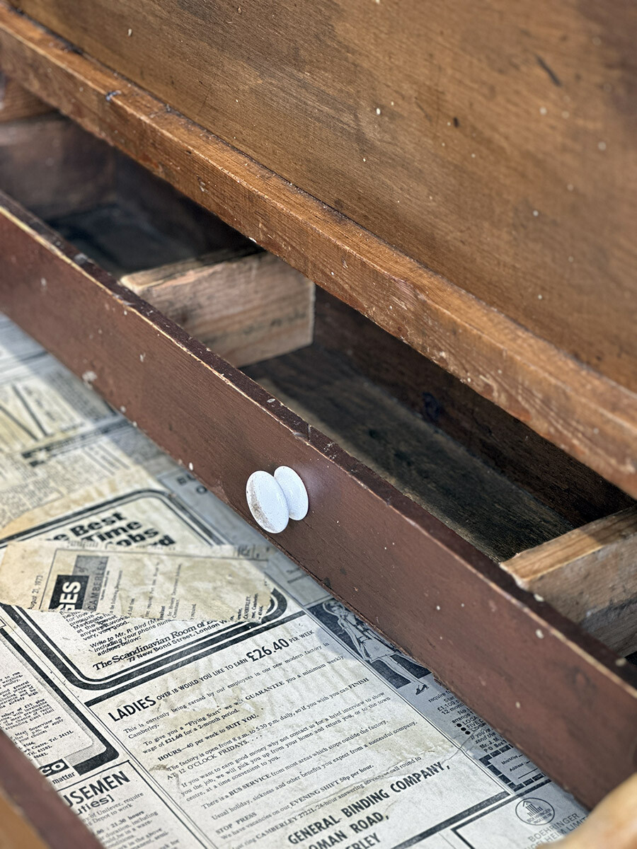 목수가 출장용으로 사용했던 공구함입니다. 목재로 만들어진 커다란 공구함의 커버에는 톱을 거치할 수 있는 고정 장치가 있고, 내부에는 못이나 피스 등의 부속이나 작은 도구들을 정리해 넣을 수 있는 부속함이 딸려 있습니다. 메인 트렁크의 내부에는 오래된 신문지로 데코파쥬 되어 있어서 상업 공간에서 상품들을 진열해놓는 디스플레이 캐비넷 용도로 활용하면 좋습니다. 사진 이미지로 보는 느낌보다 실물이 큰 감이 있으니, 아래 사이즈를 참고 하시기 바랍니다.