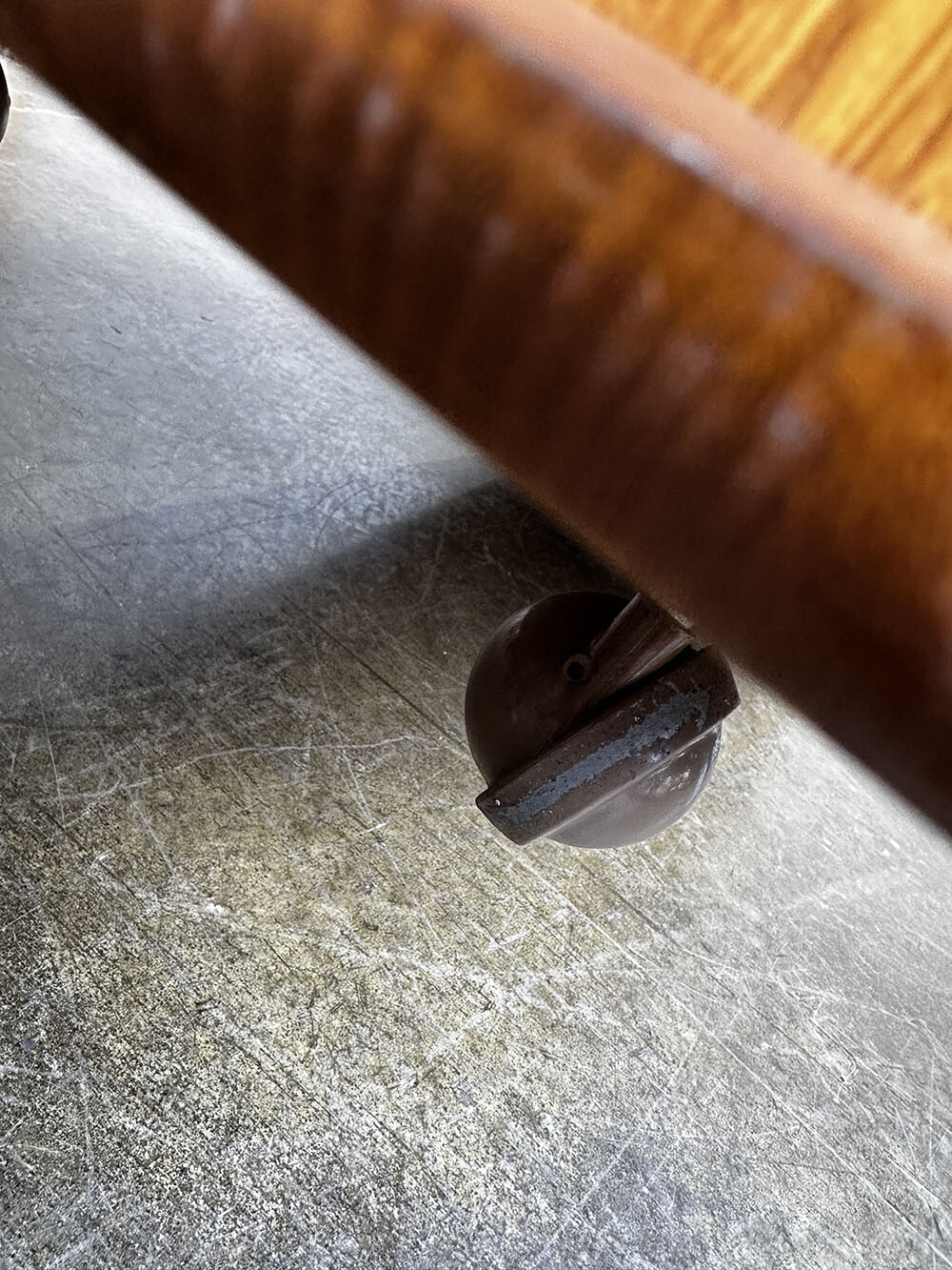 영국의 클래시컬 가구들을 현대화 시킨다는 컨셉으로 다양한 디자인을 도전했던 얼콜라니가, 좀 더 현대적인 느낌으로 이 커피 테이블을 제작한 것은 아마 세계대전 이후에 급격히 변화하는 가정의 모습 때문이었을 것으로 보입니다. 일반적인 가정의 거실에는 편안한 쇼파와 함께 높이가 낮은 테이블이 필요해졌고, 위치를 바꾸려고 할 때에는 카페트 위에서도 잘 움직일 수 있도록 카스트 아이언 소재의 바퀴를 달아 두었죠.