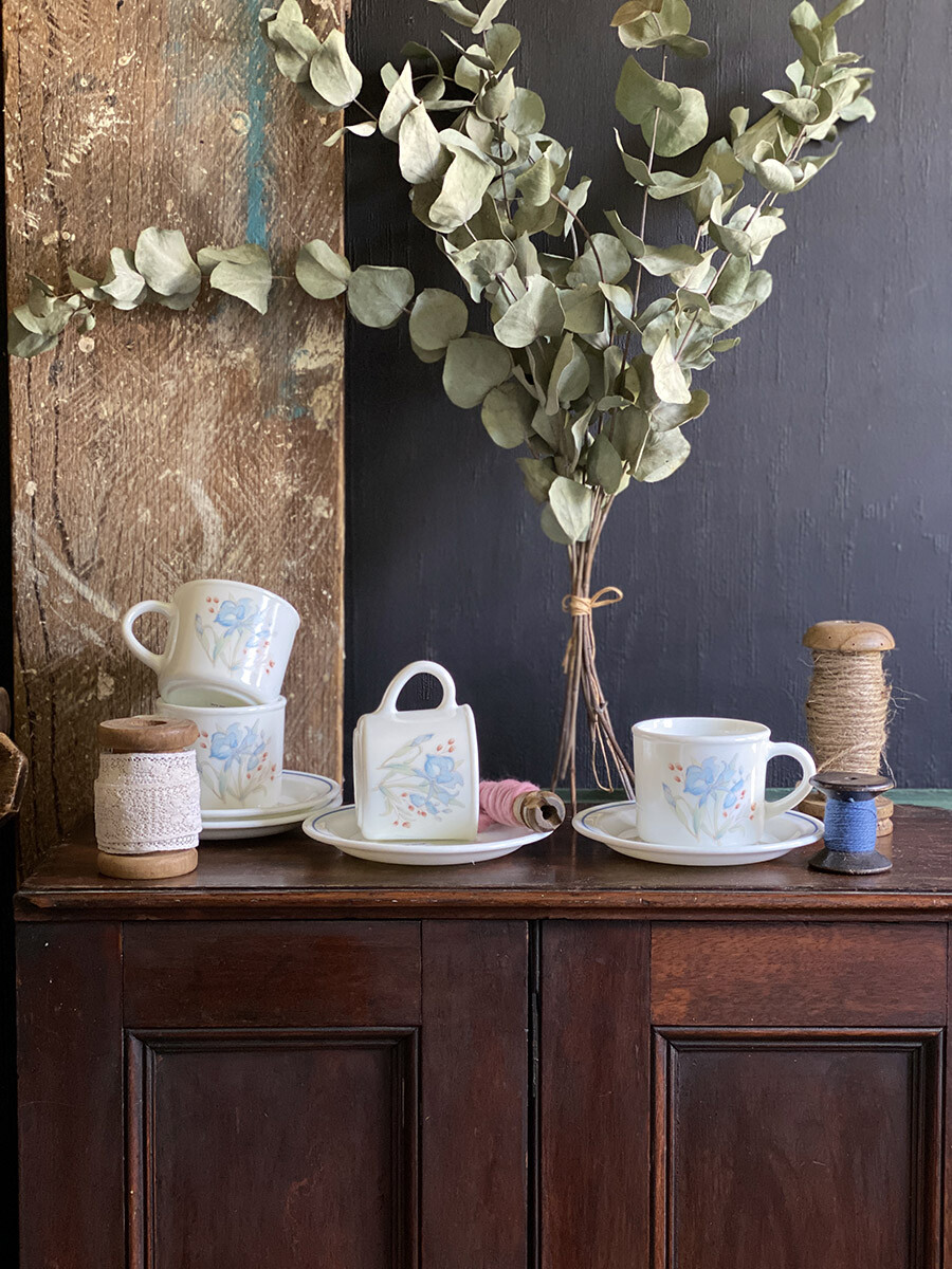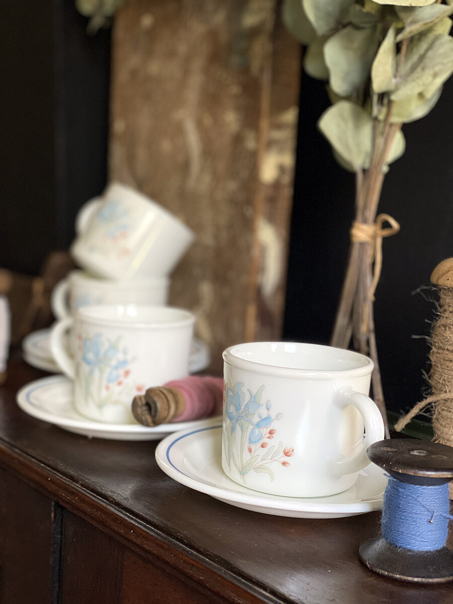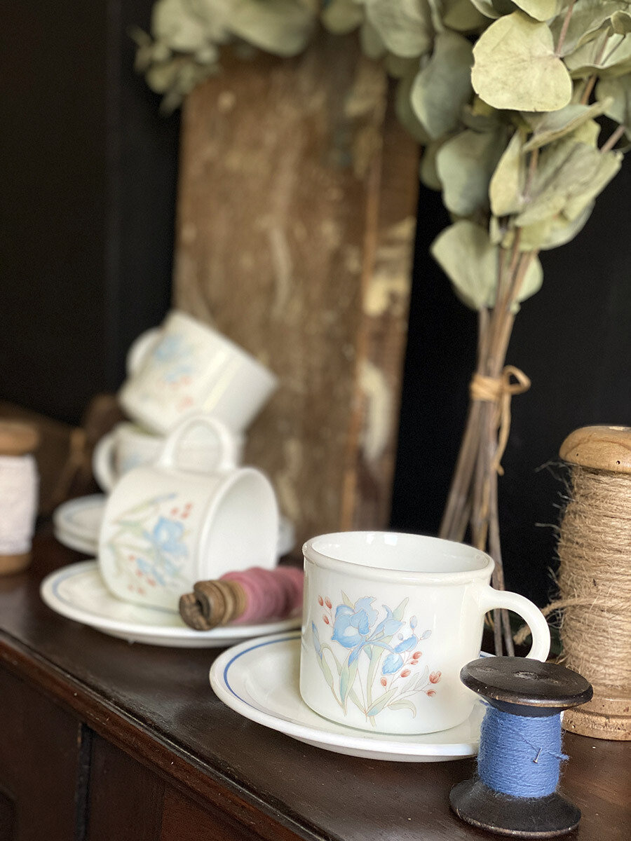 블루 아이리스 문양이 들어간 파이렉스(PYREX)의 빈티지 티 컵과 소서 셋트입니다.