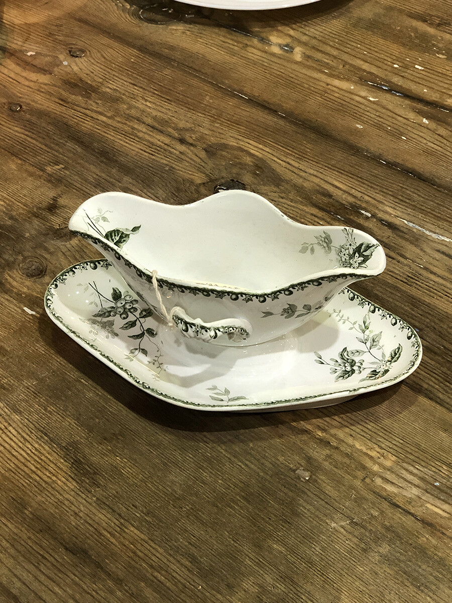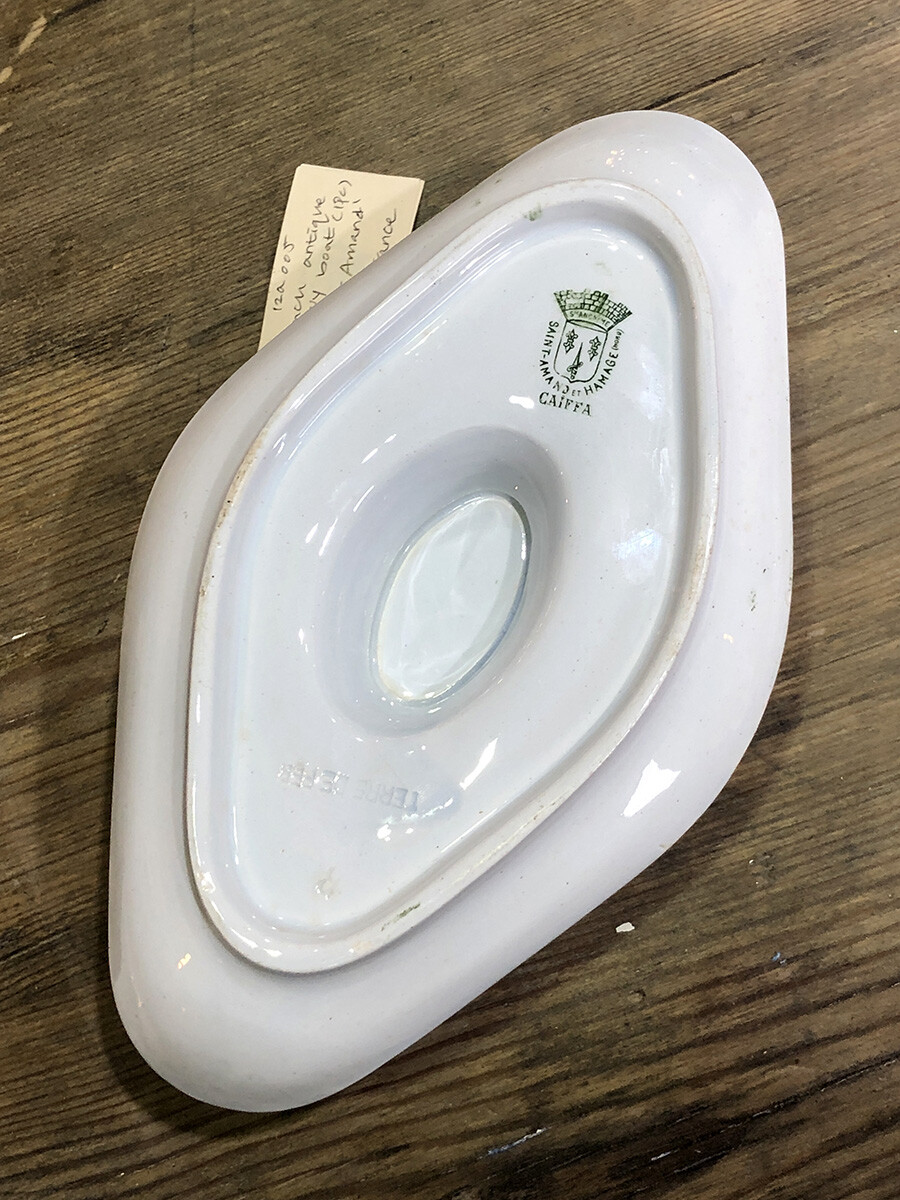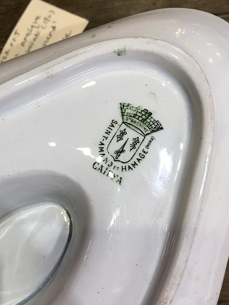 프렌치 도기 회사인 생-아몽(SANIT-AMAND)의 그레이비 보트입니다. 고기나 감자 등의 요리에 자주 곁들여지는 그레이비 소스를 담는 전용 그릇을 '그레이비 보트'라고 부릅니다. SAINT-AMAND ET HAMAGE 라는 백 스탬프를 통해 1896년 이후의 상품임을 알 수 있습니다.