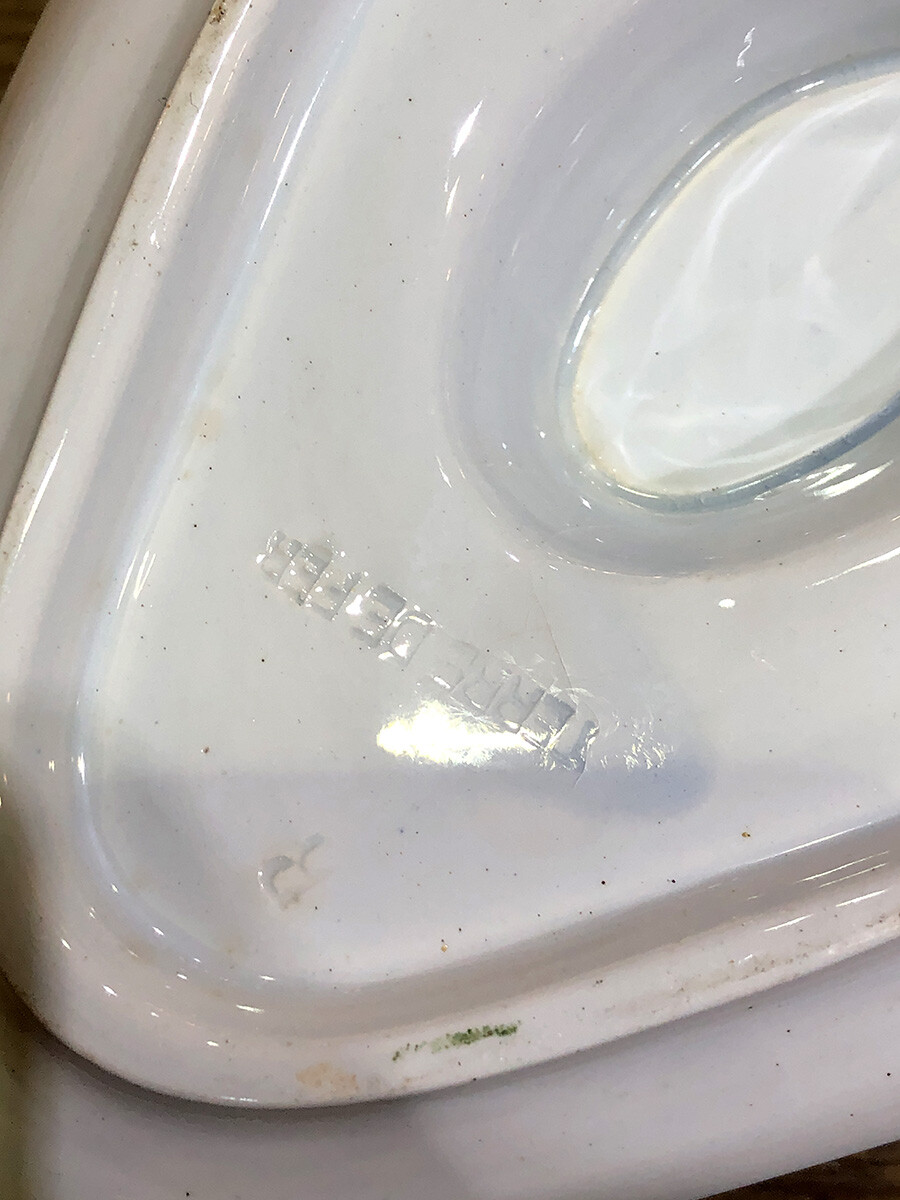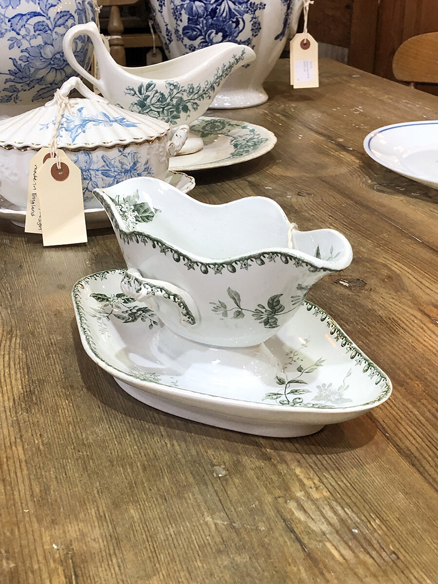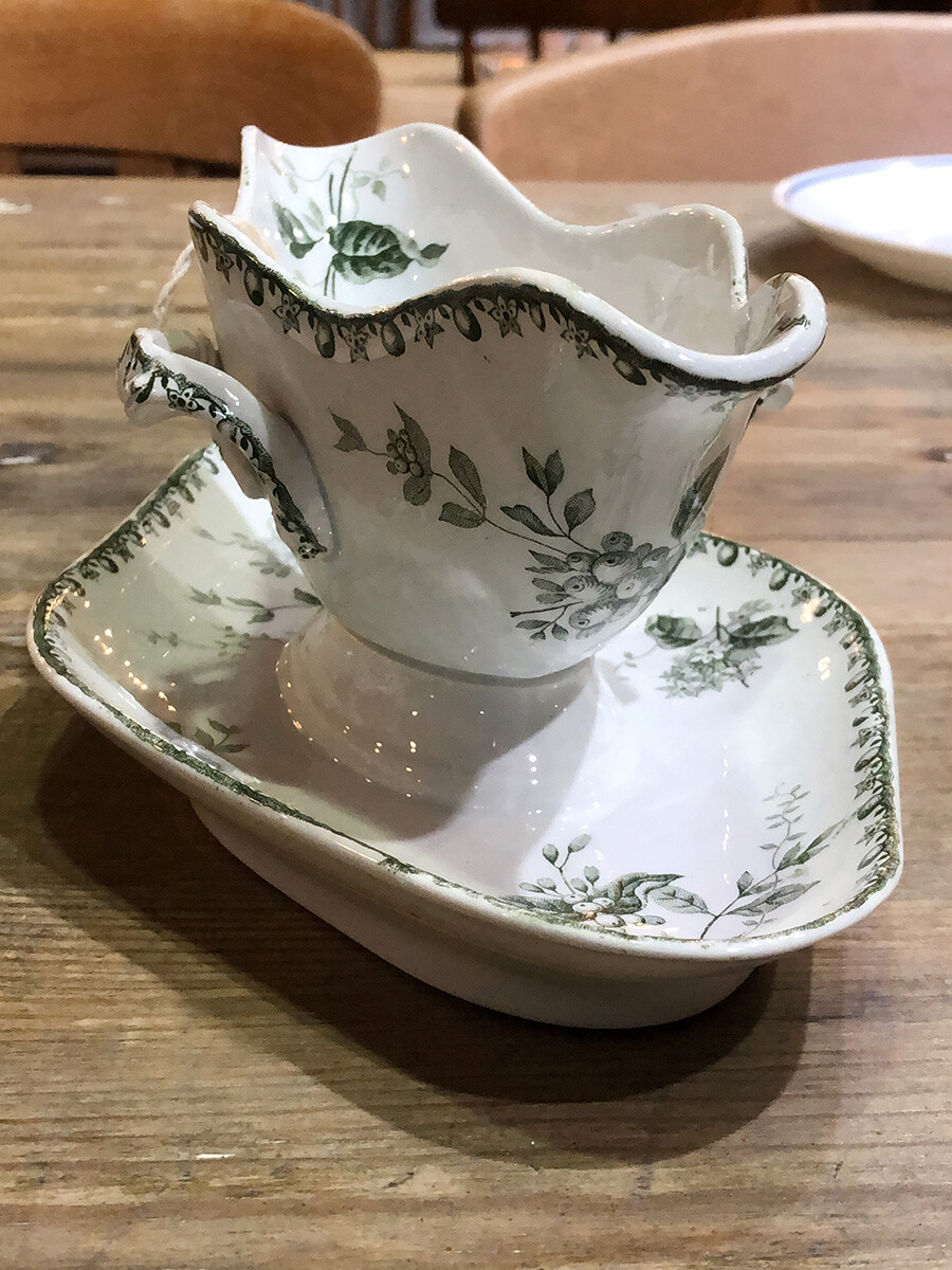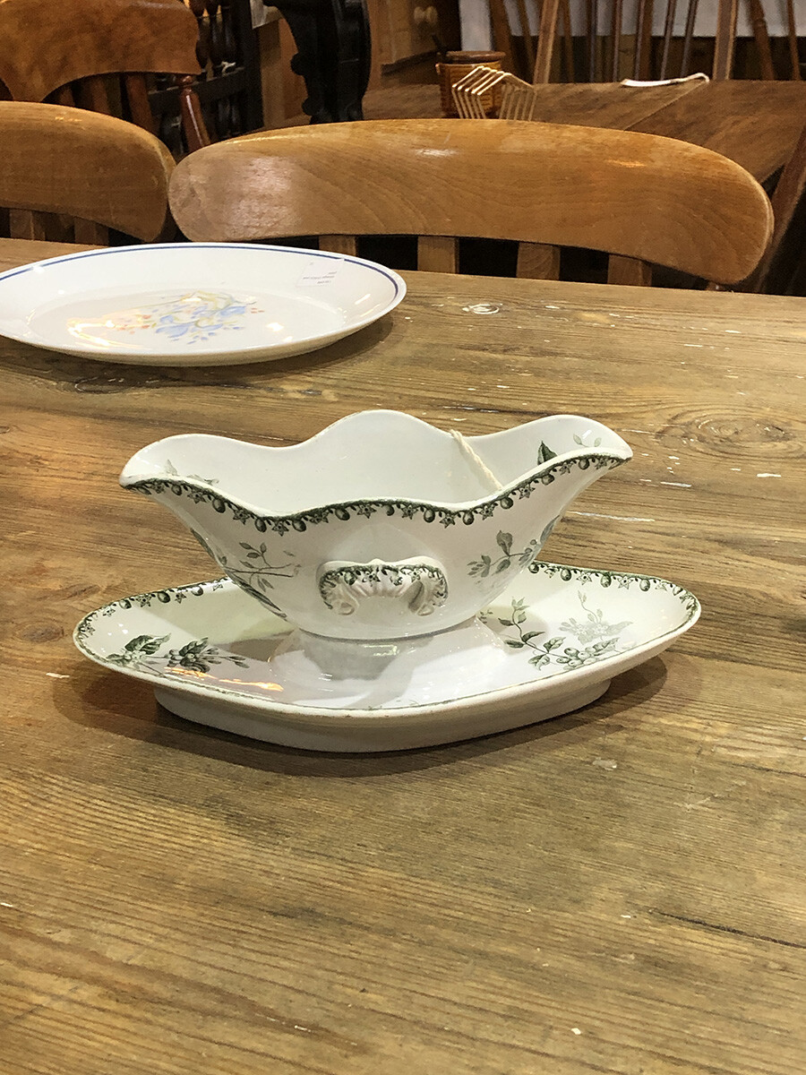 프렌치 도기 회사인 생-아몽(SANIT-AMAND)의 그레이비 보트입니다. 고기나 감자 등의 요리에 자주 곁들여지는 그레이비 소스를 담는 전용 그릇을 '그레이비 보트'라고 부릅니다. SAINT-AMAND ET HAMAGE 라는 백 스탬프를 통해 1896년 이후의 상품임을 알 수 있습니다.