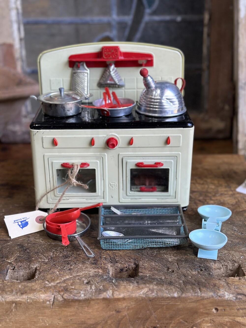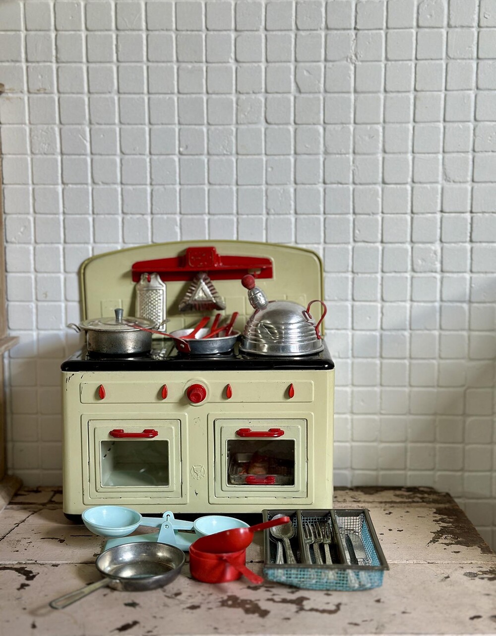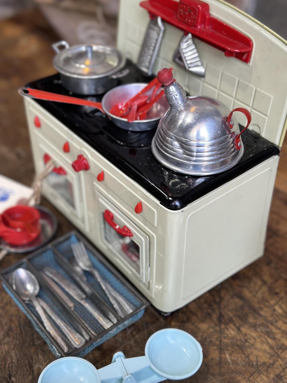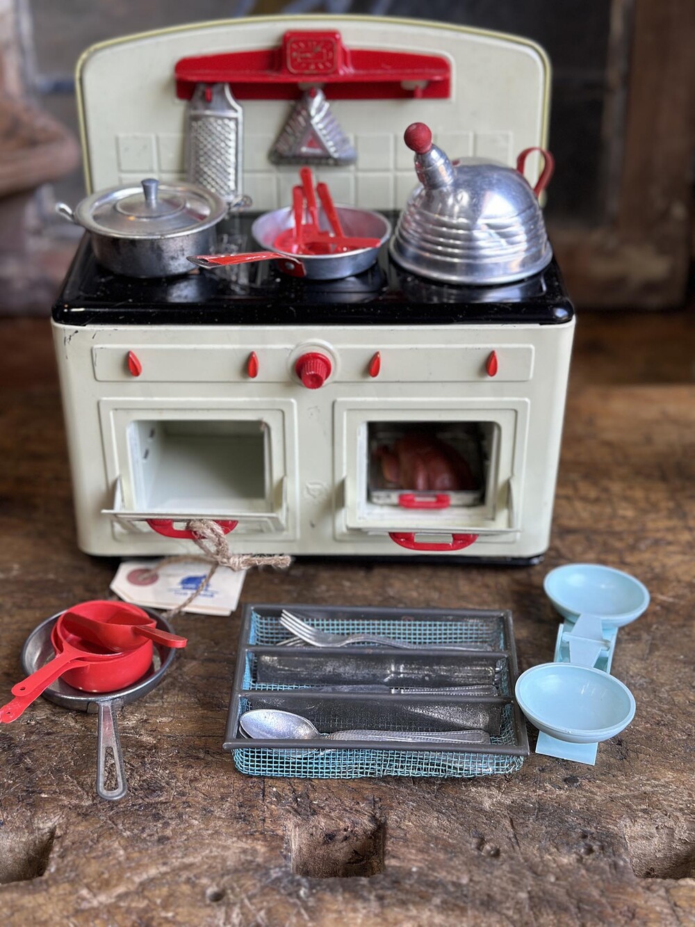 독일의 토이 메이커가 제작한 빈티지 틴 토이 키친 레인지입니다. 레인지를 비롯하여, 다양한 주방 기구들과 오븐 속 칠면조까지 액세서리들이 모두 완비되어 있는 레어 아이템입니다. 1950년대에 제작되었습니다.