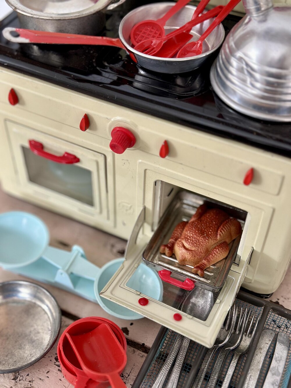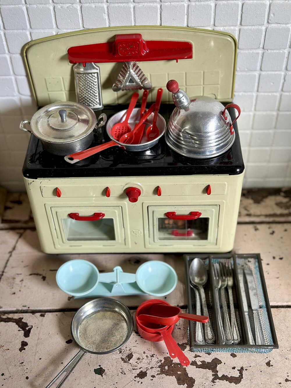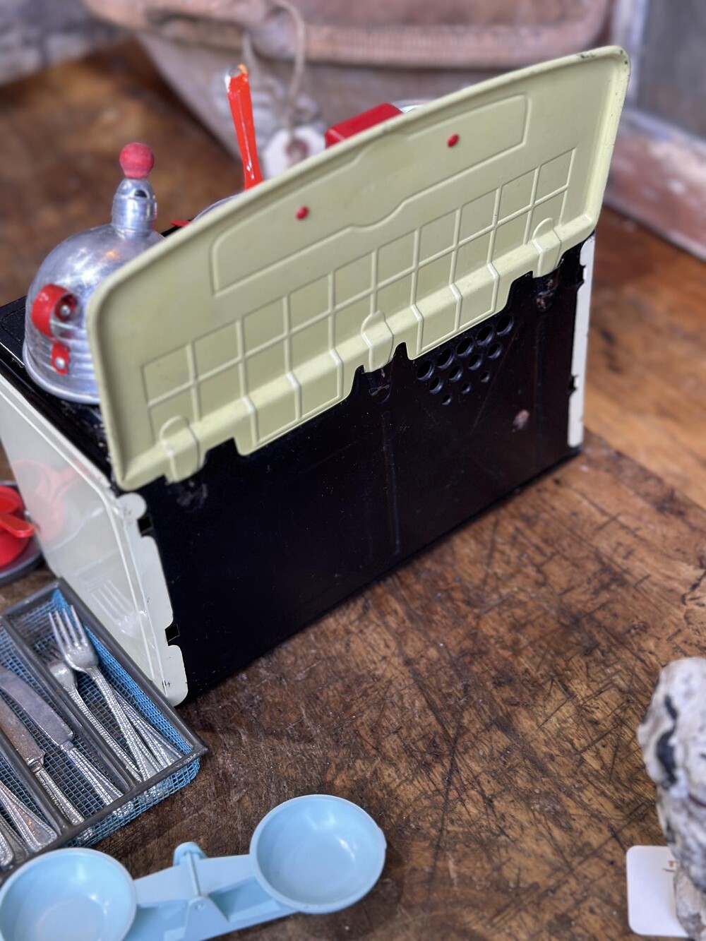 독일의 토이 메이커가 제작한 빈티지 틴 토이 키친 레인지입니다. 레인지를 비롯하여, 다양한 주방 기구들과 오븐 속 칠면조까지 액세서리들이 모두 완비되어 있는 레어 아이템입니다. 1950년대에 제작되었습니다.