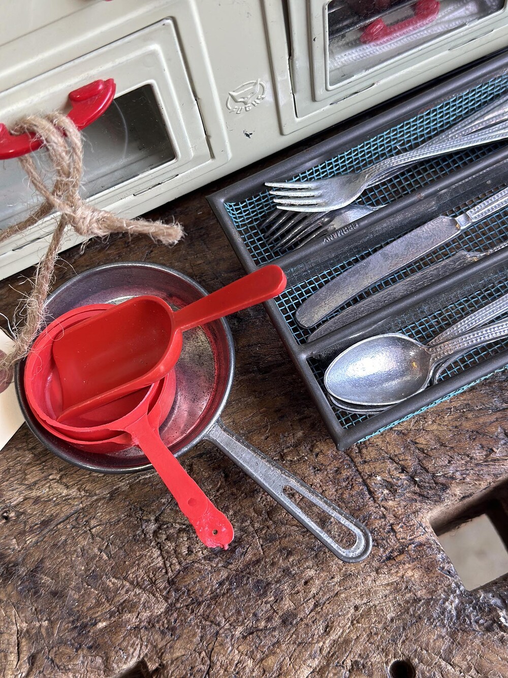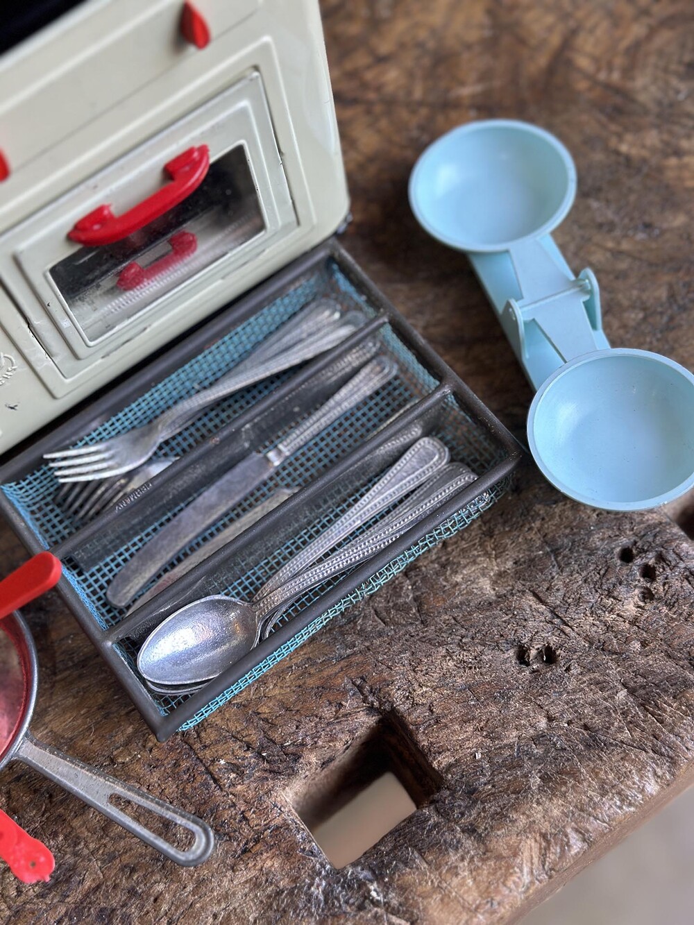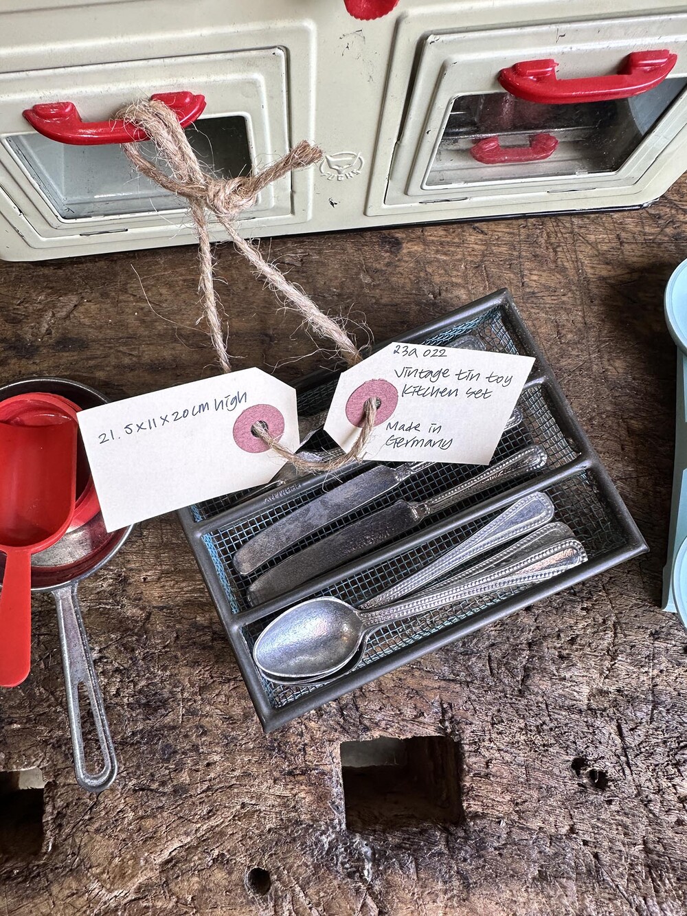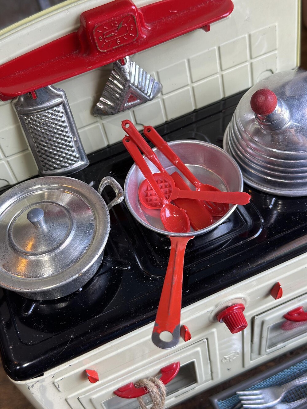 독일의 토이 메이커가 제작한 빈티지 틴 토이 키친 레인지입니다. 레인지를 비롯하여, 다양한 주방 기구들과 오븐 속 칠면조까지 액세서리들이 모두 완비되어 있는 레어 아이템입니다. 1950년대에 제작되었습니다.