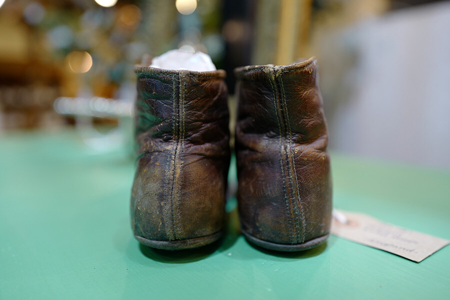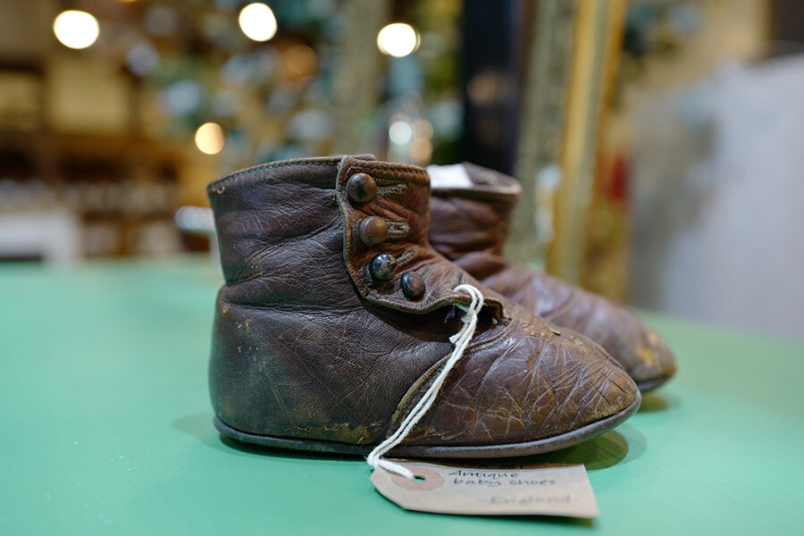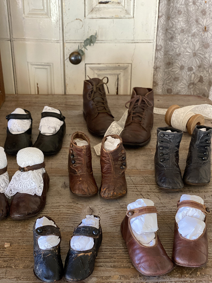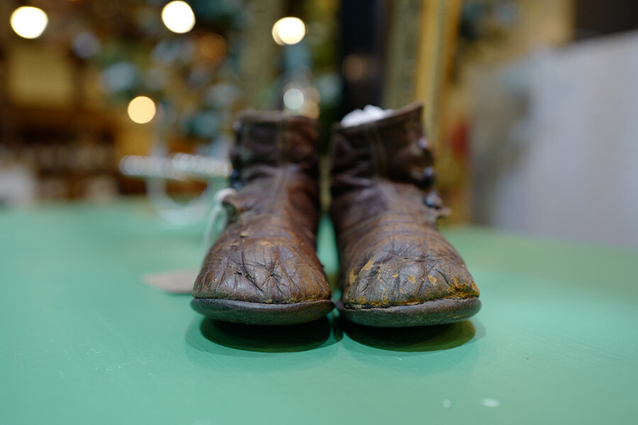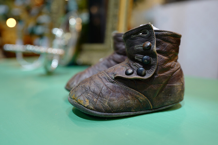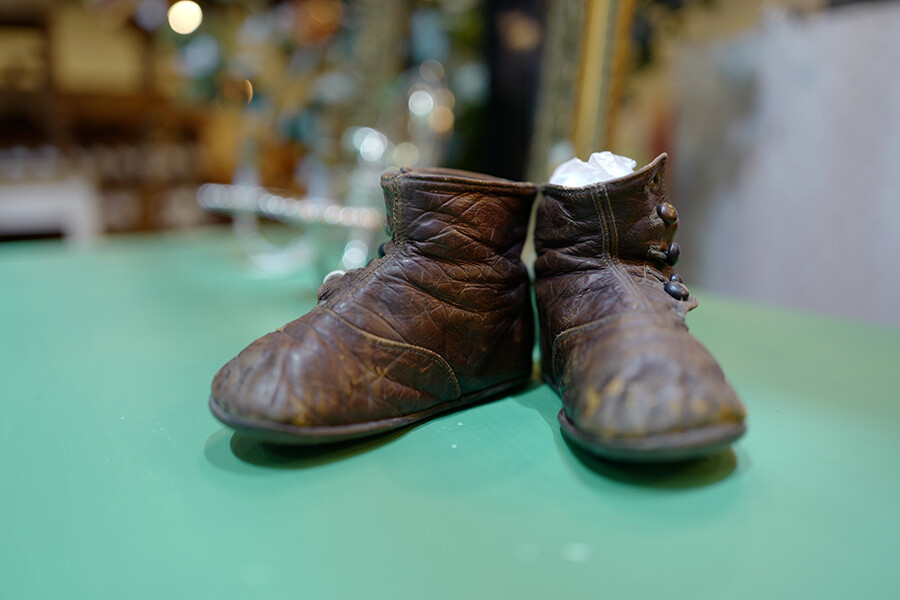 가죽 소재의 앤틱 베이비 슈즈입니다. 자그마한 부츠 형태입니다.