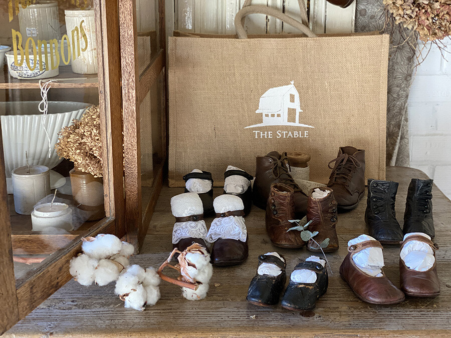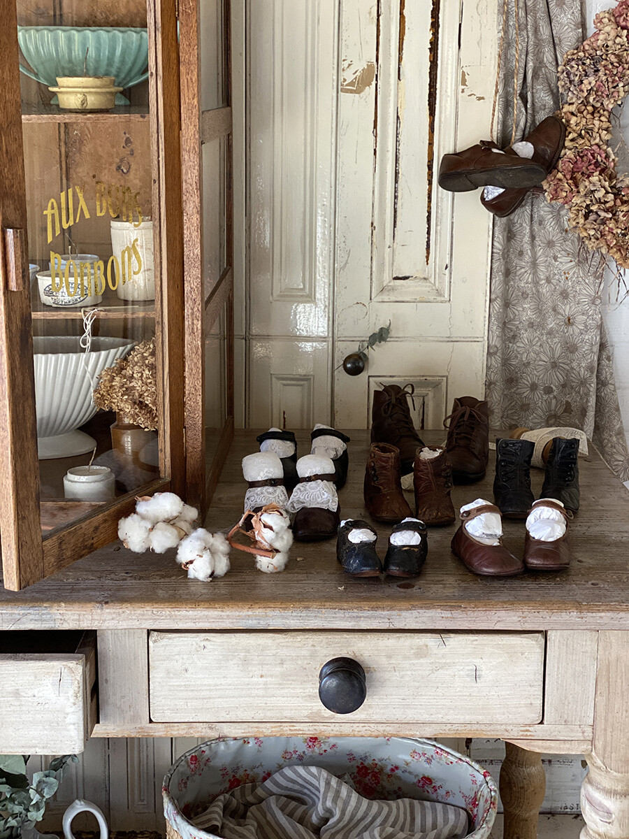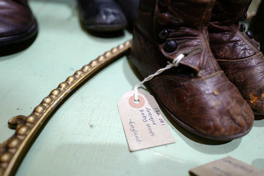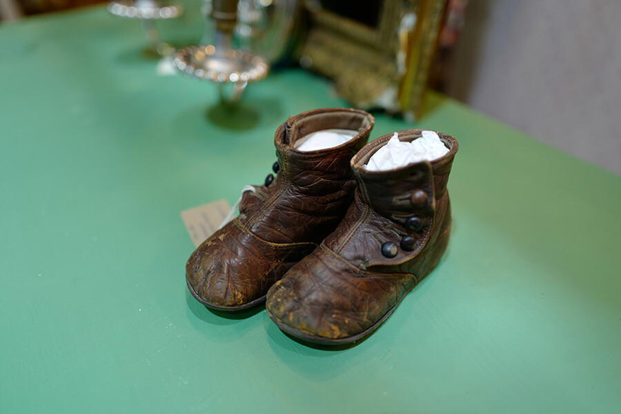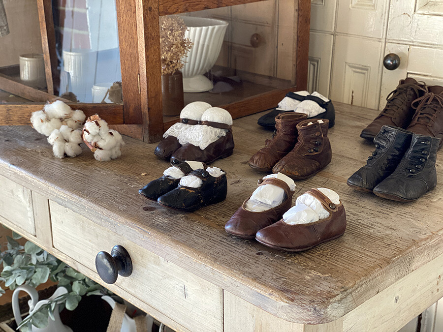 가죽 소재의 앤틱 베이비 슈즈입니다. 자그마한 부츠 형태입니다.