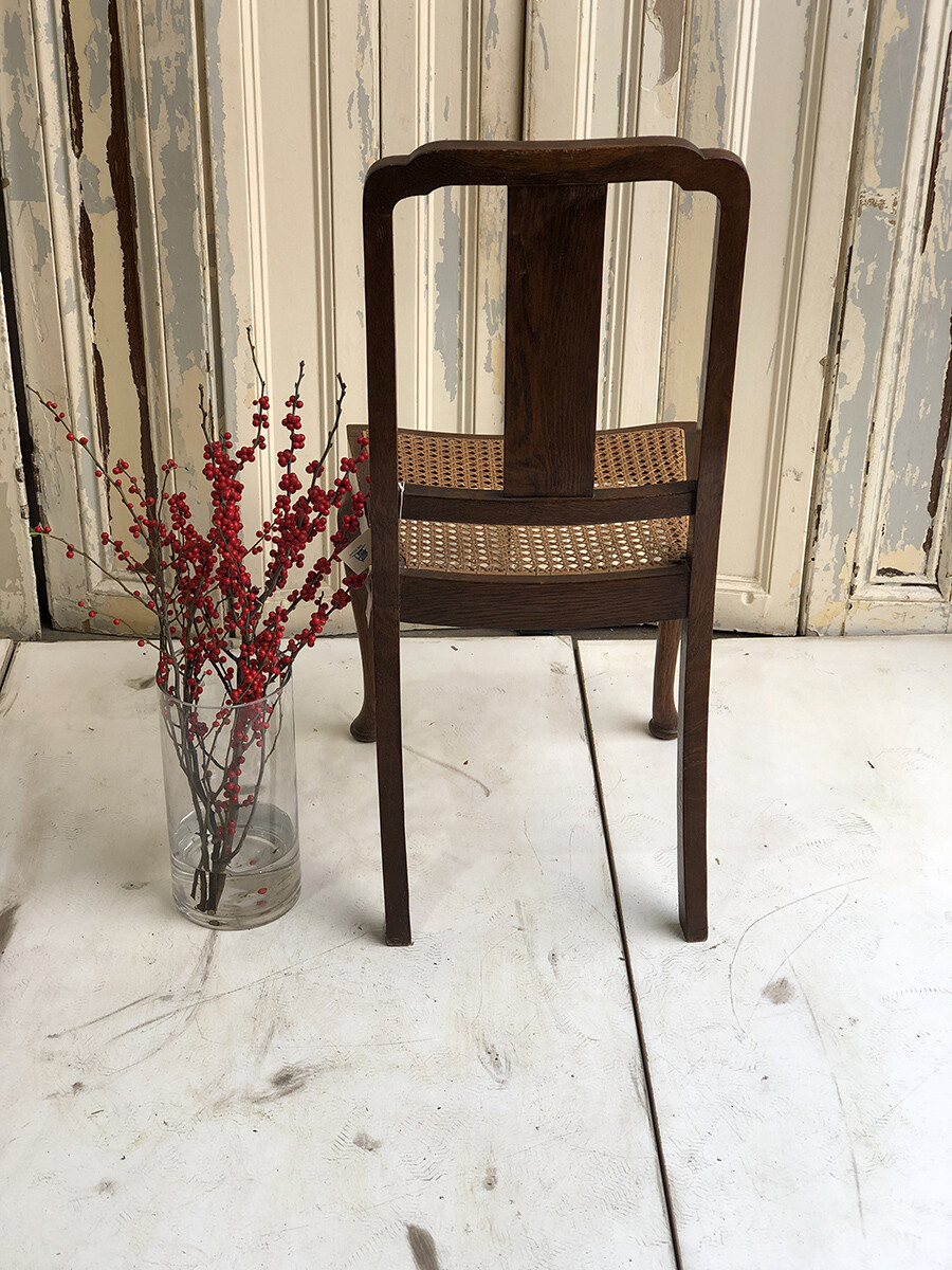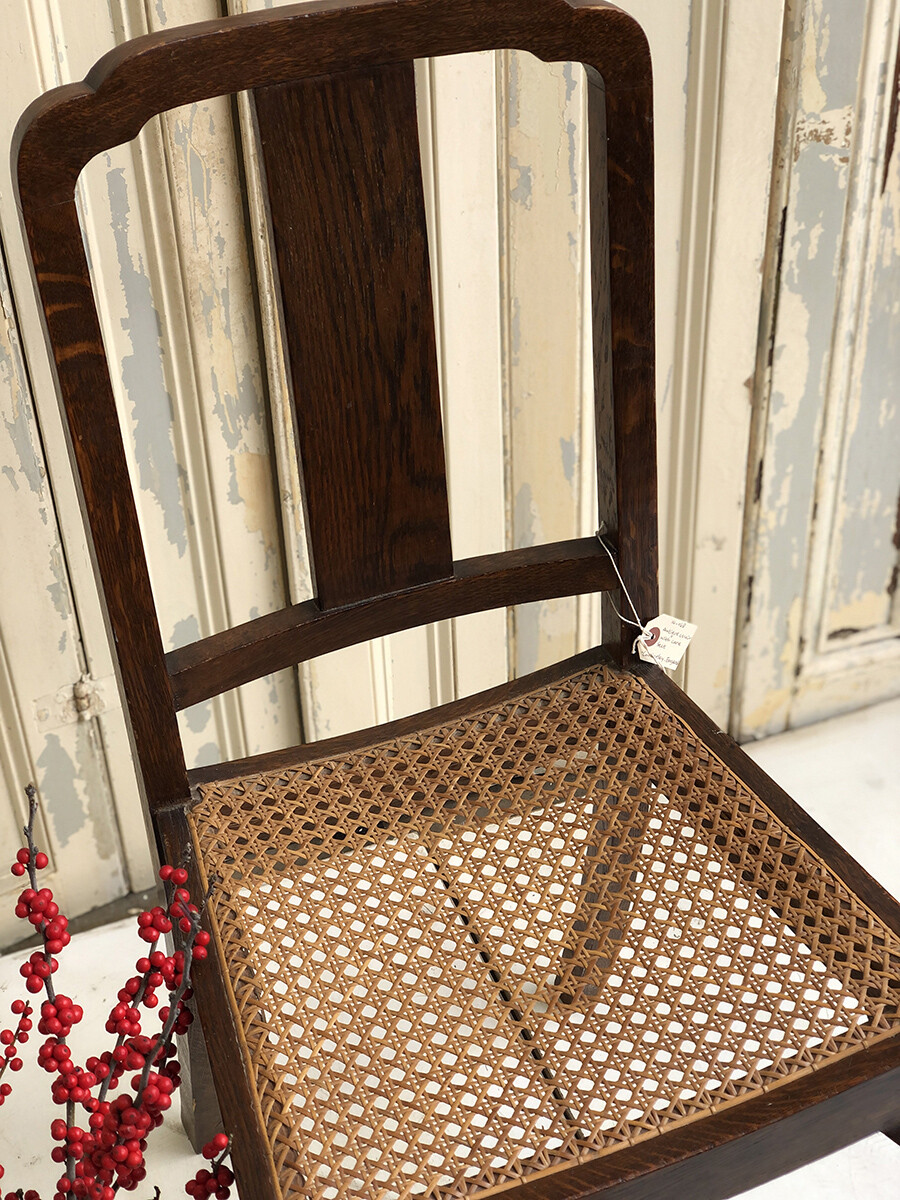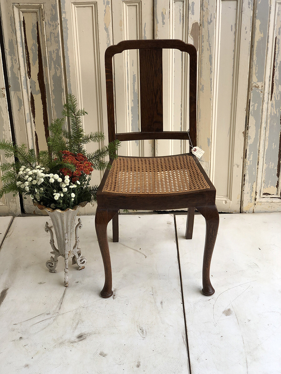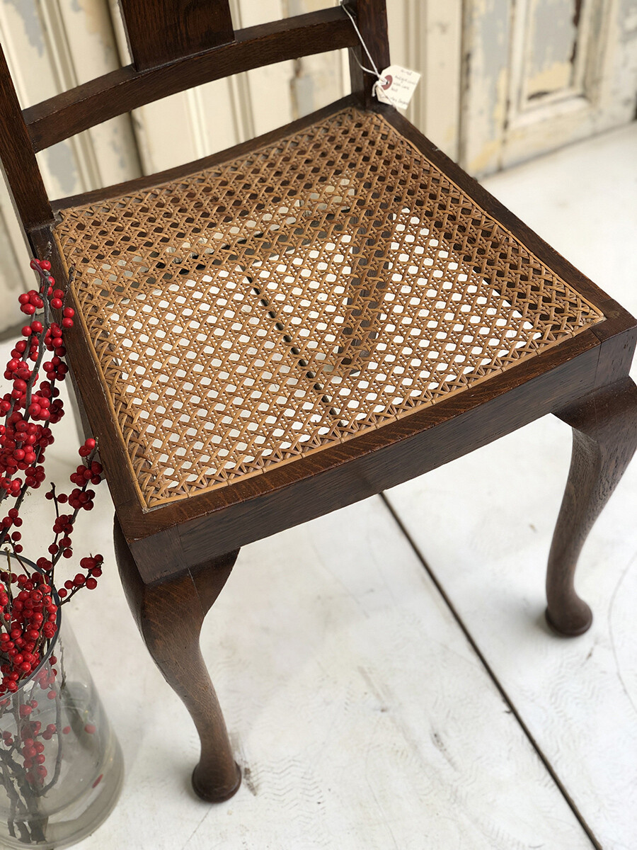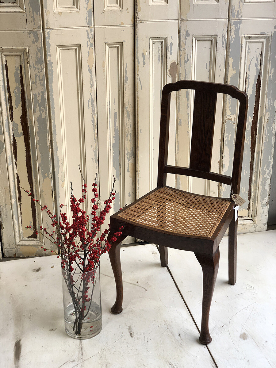 가늘게 쪼갠 사탕수수의 줄기를 엮어서(cane weaving) 시트나 등받이에 사용한 의자를 케인 시트 체어(cane seat chair)라고 합니다. 케인 시트는 제국주의시대에 식민지로부터 대량의 사탕수수가 수입되면서부터 가구에 점차 사용되기 시작했다는 설이 있습니다. 케인 시트는 여성을 위한 체어에 주로 사용되었고, 그때문에 케인 시트가 사용된 체어들은 대부분 어느 정도 장식적인 부분들이 더욱 가미되어 있는 경우가 많습니다. 명칭에서도 베드룸 체어로 되어 있는 것을 볼 수 있는데, 보통 여성의 침실에서 침대 옆에 두고서 옷이나 스타킹을 갈아 신거나, 가운이나 가디건 등을 걸쳐 두는 용도로 사용되었습니다. 실용성보다는 장식적인 요소에 더욱 비중을 둔 의자라고 할 수 있습니다. 케인 시트를 문제없이 오래 보존하려면 사용할 때에는 쿠션(방석)을 꼭 사용하시기를 권장합니다. 등받이는 스플릿 백, 다리는 캐브리올 레그를 갖는 1700년대의 고전적인 형태를 갖고 있는데, 과도한 장식 없이 미니멀하게 디자인 되어 있습니다.