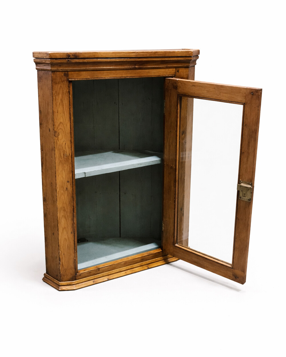 내부는 2단으로 나뉘어 있으며, 차분하게 청색 빛이 도는 회색의 쉐비 시크 페인팅으로 정돈되어 있습니다. 일반적으로 앤틱 코너 유닛들이 대부분 유리창이 없는 편인데, 유리창이 있어 디스플레이 용도로 사용하시는 것도 좋을 듯 합니다. 벽에 걸거나 바닥이나 다른 가구 위에 내려 놓고 사용하는 것이 모두 가능하며, 열쇠가 포함되어 있습니다.