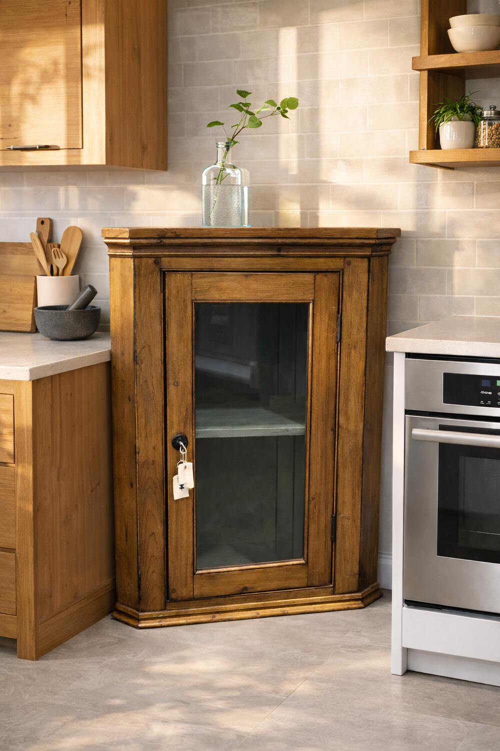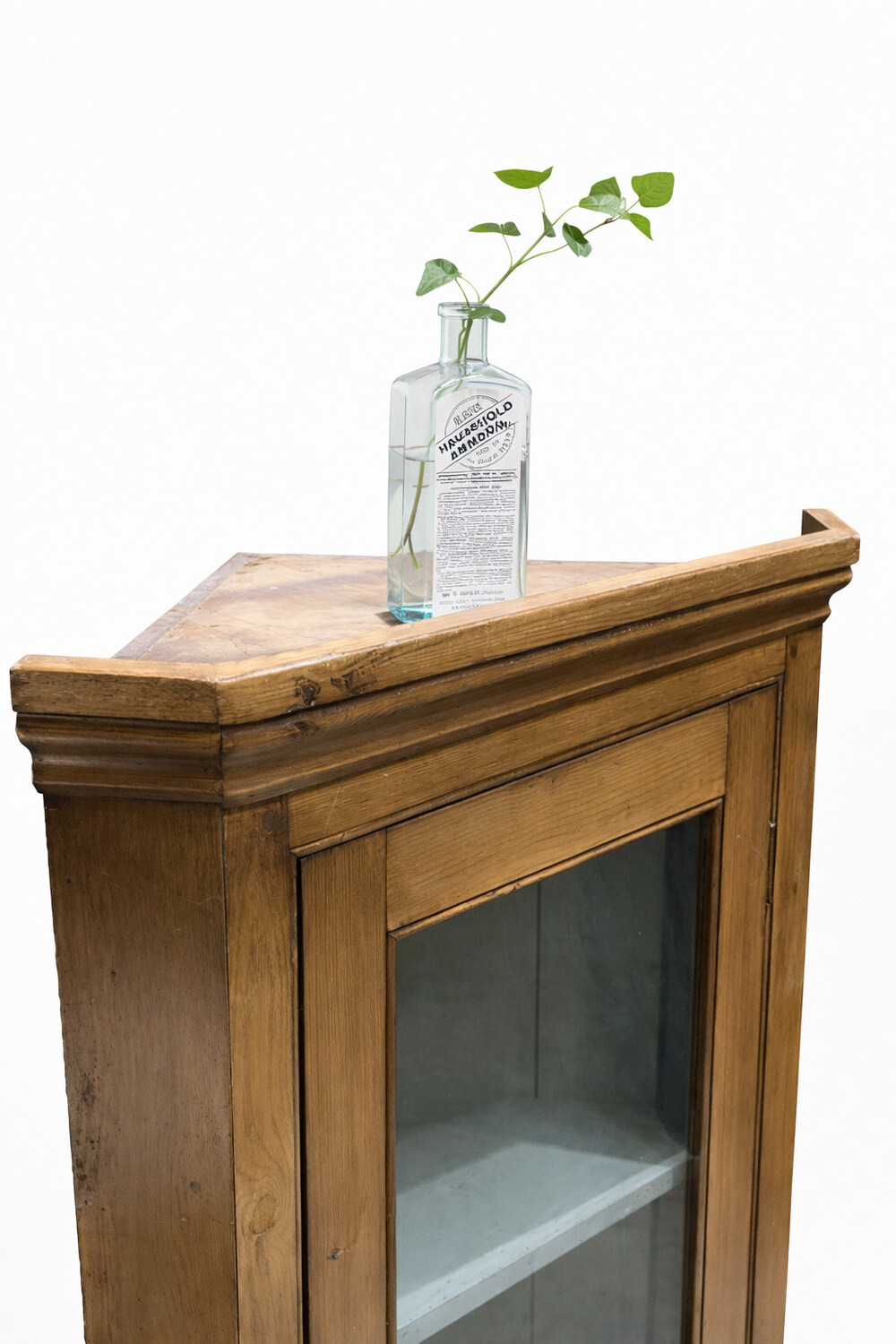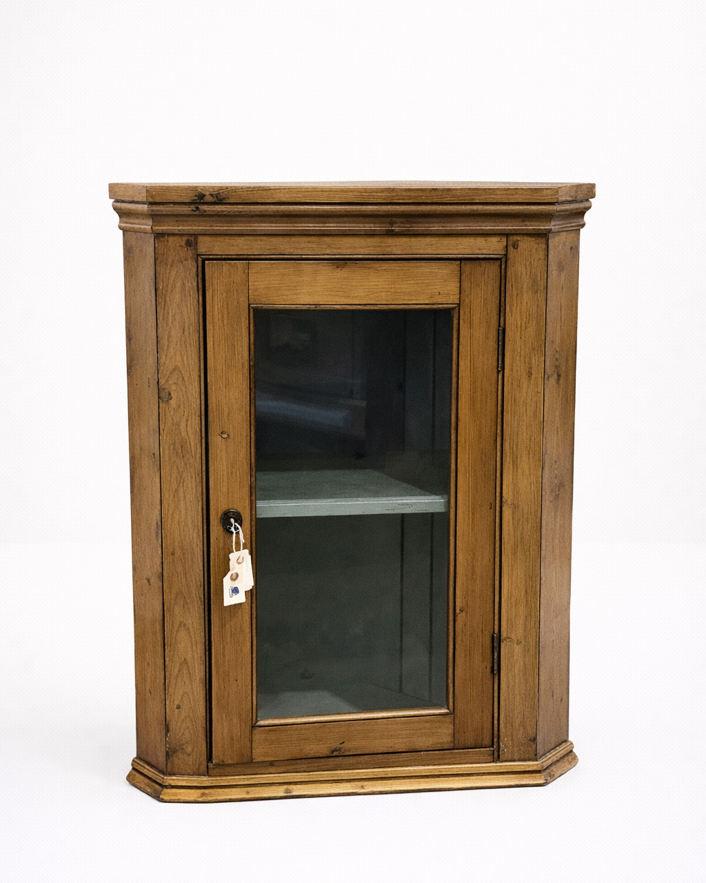 14-085 Antique pine corner unit with glass door and a key