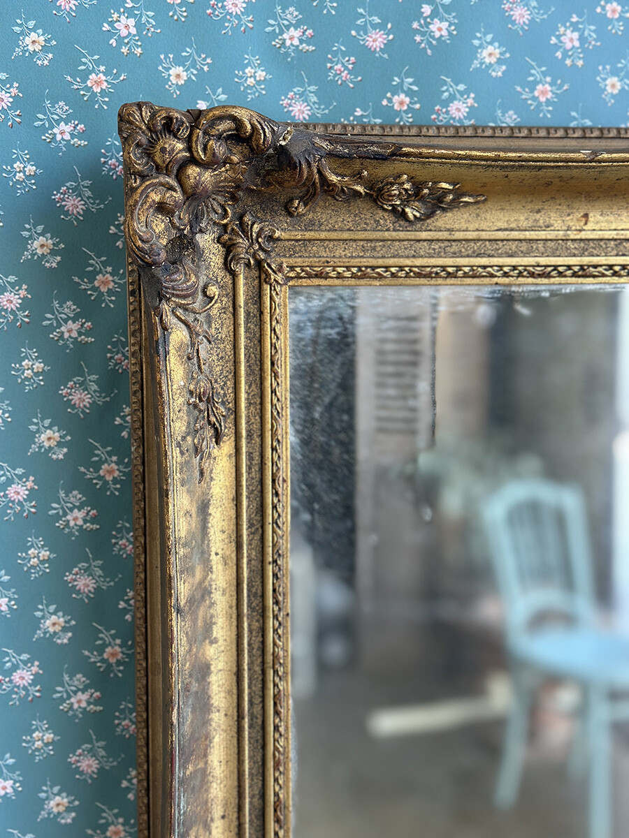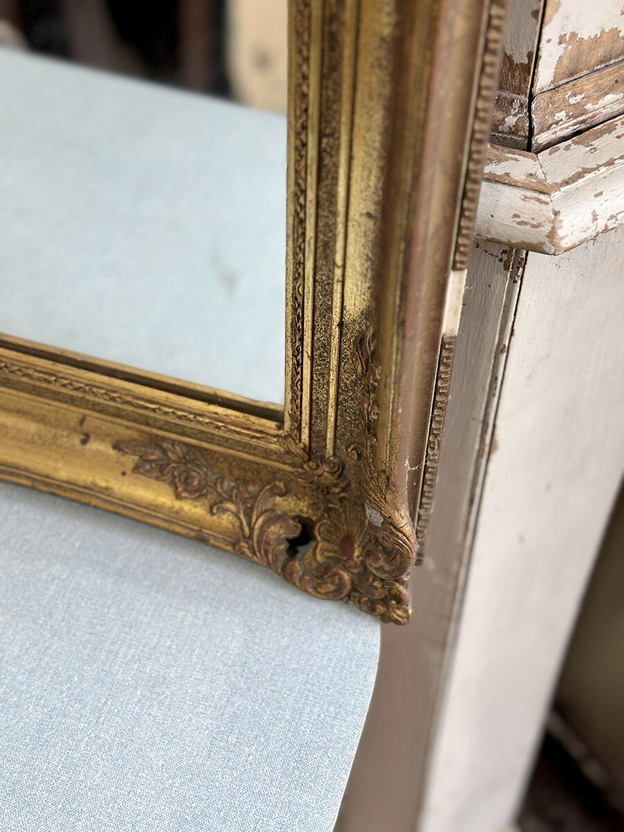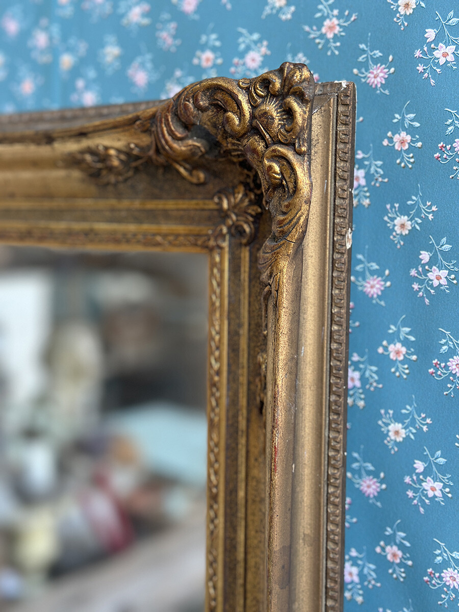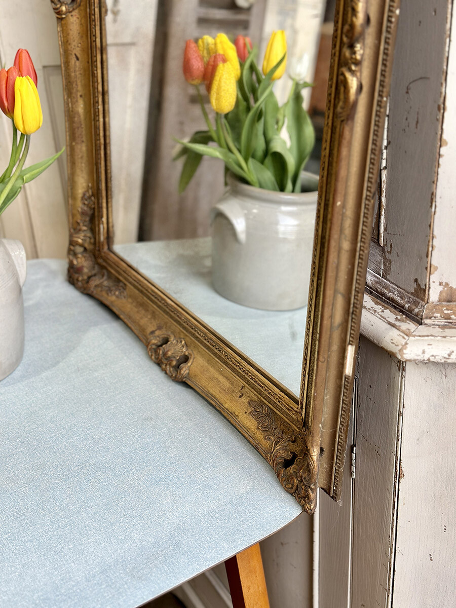 길티드 프레임(gilted frame)은 일반적으로 나무로 된 바탕 프레임 위에 플라스터(석고)로 패널과 장식 형태를 만들고, 그 위에 금박을 입히는 방식으로 제작 되었습니다. 이렇게 만들어진 길티드 프레임에는 석고라는 소재의 특성 상, 오랜 세월이 흐르면서 크랙이나 칩 등이 발생할 수밖에 없는데, 오히려 이러한 흔적들은 세월감의 요소로 받아들여지고 있습니다. 길티드 프레임에 들어 있는 거울 역시 오랜 세월을 보낸 오리지널 앤틱 거울입니다.