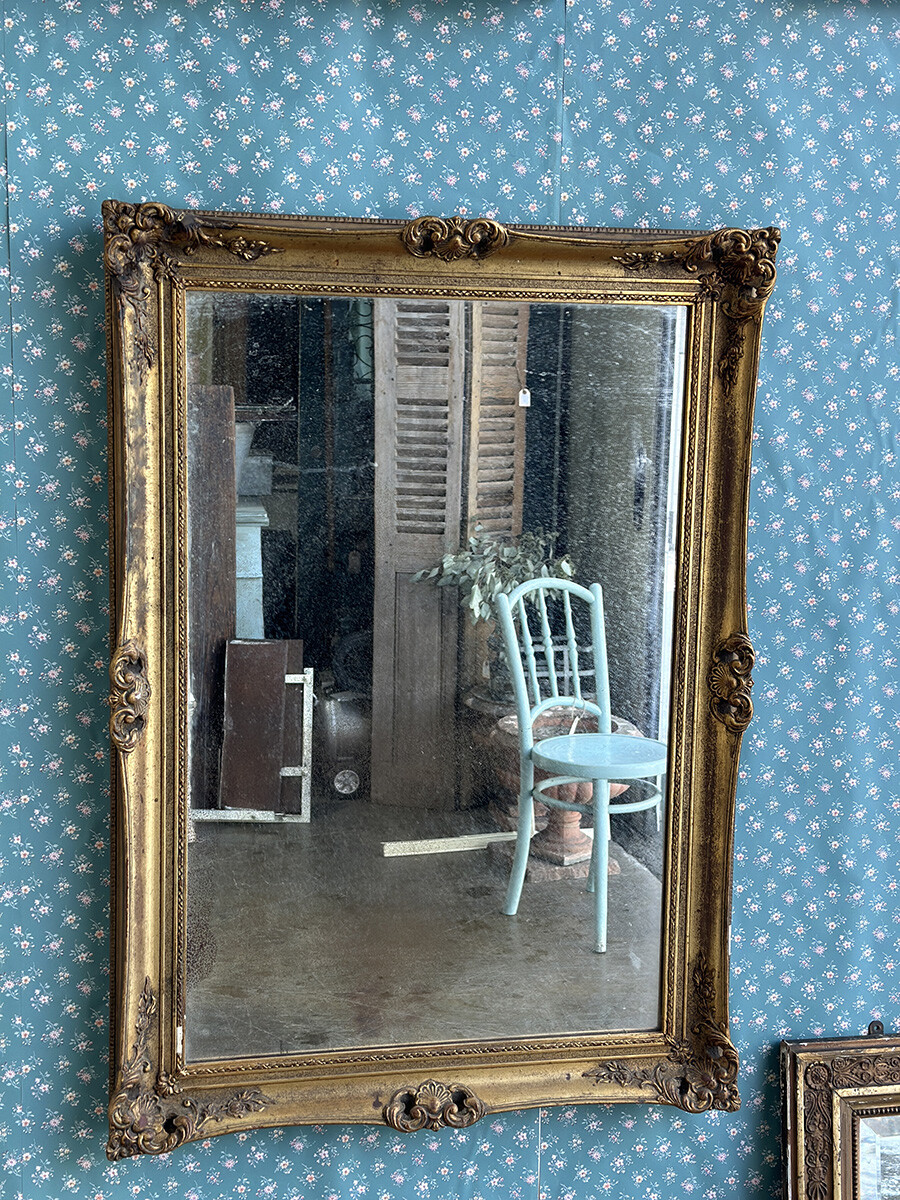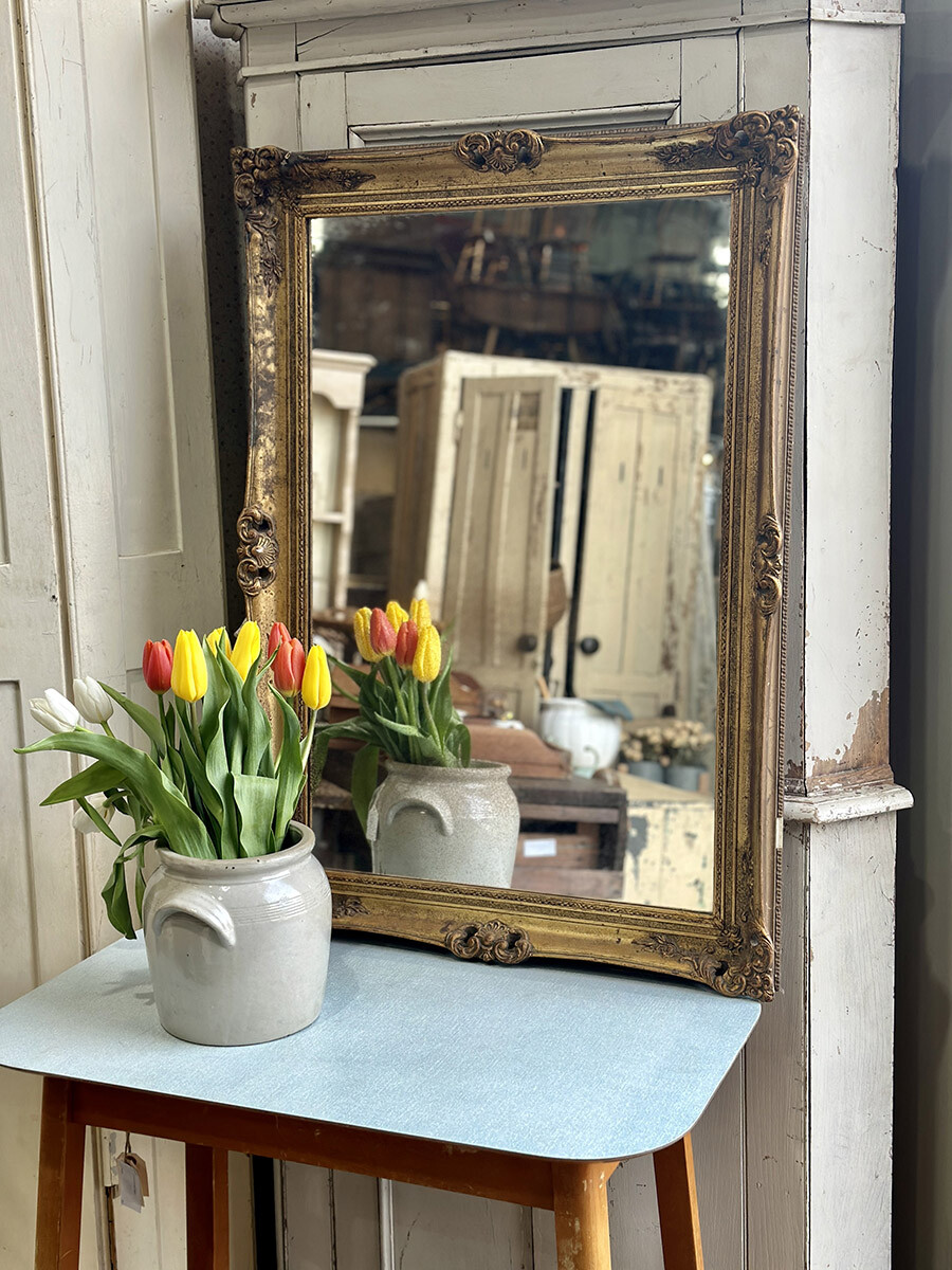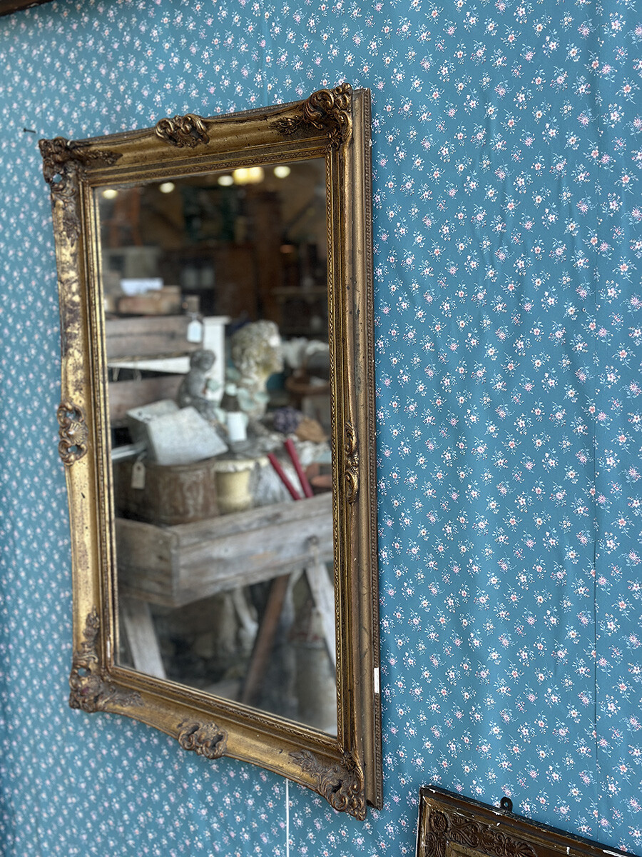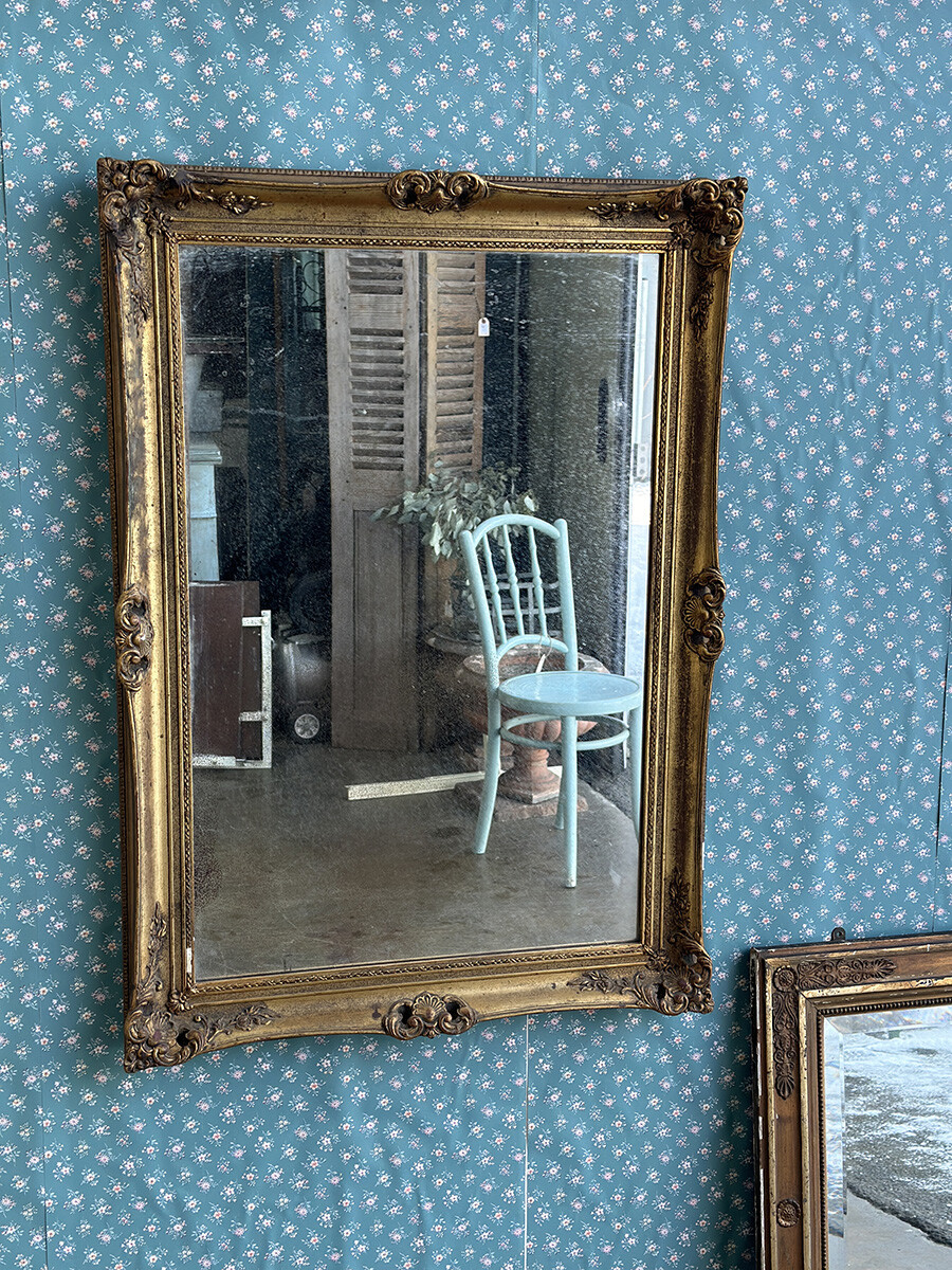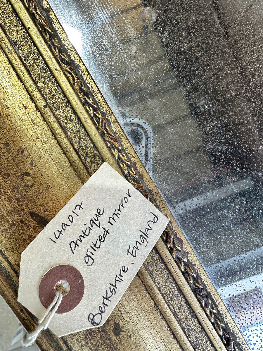 길티드 프레임(gilted frame)은 일반적으로 나무로 된 바탕 프레임 위에 플라스터(석고)로 패널과 장식 형태를 만들고, 그 위에 금박을 입히는 방식으로 제작 되었습니다. 이렇게 만들어진 길티드 프레임에는 석고라는 소재의 특성 상, 오랜 세월이 흐르면서 크랙이나 칩 등이 발생할 수밖에 없는데, 오히려 이러한 흔적들은 세월감의 요소로 받아들여지고 있습니다. 길티드 프레임에 들어 있는 거울 역시 오랜 세월을 보낸 오리지널 앤틱 거울입니다.