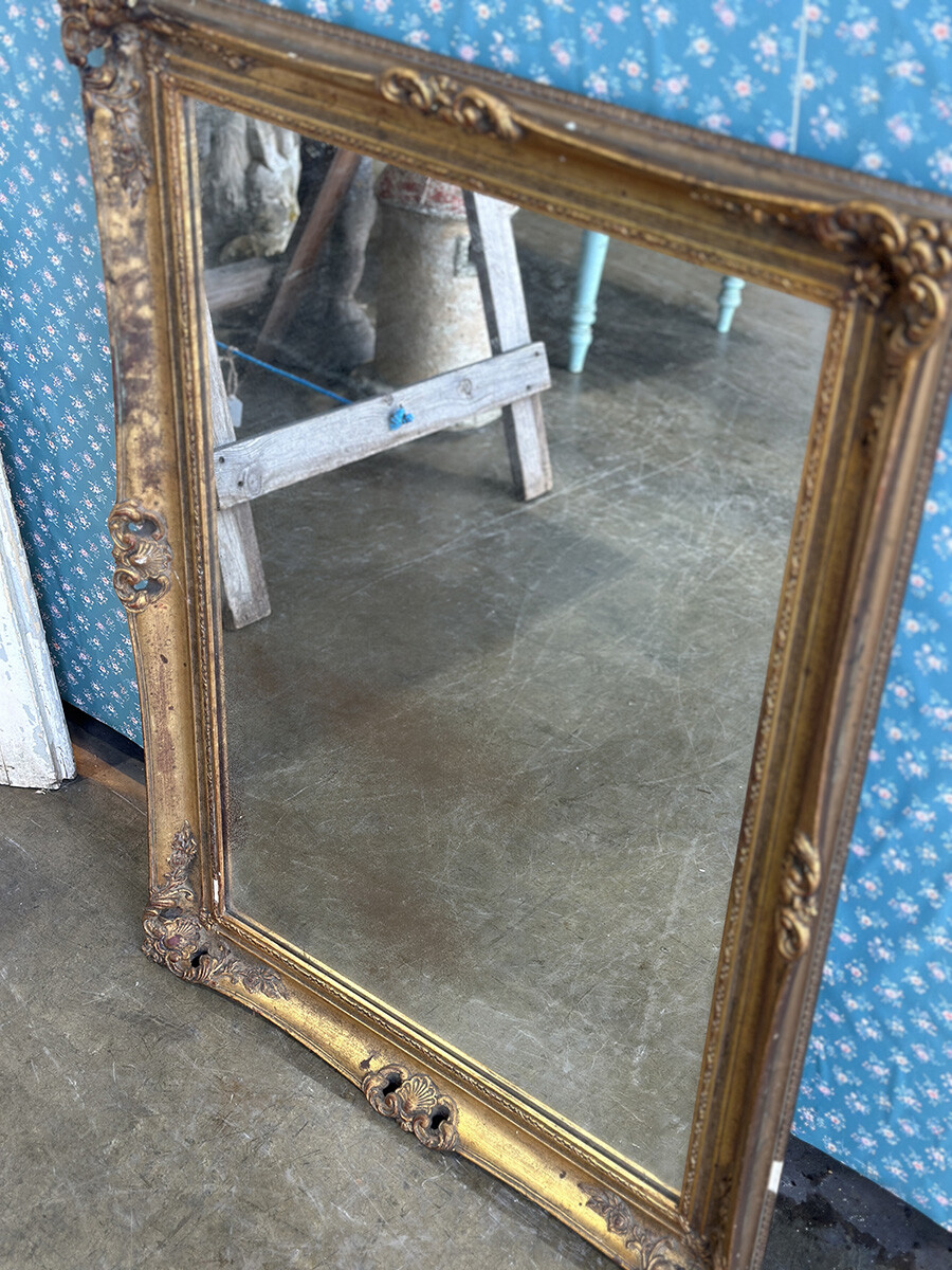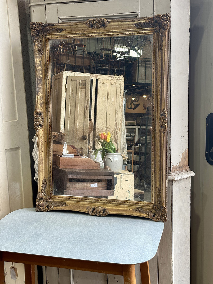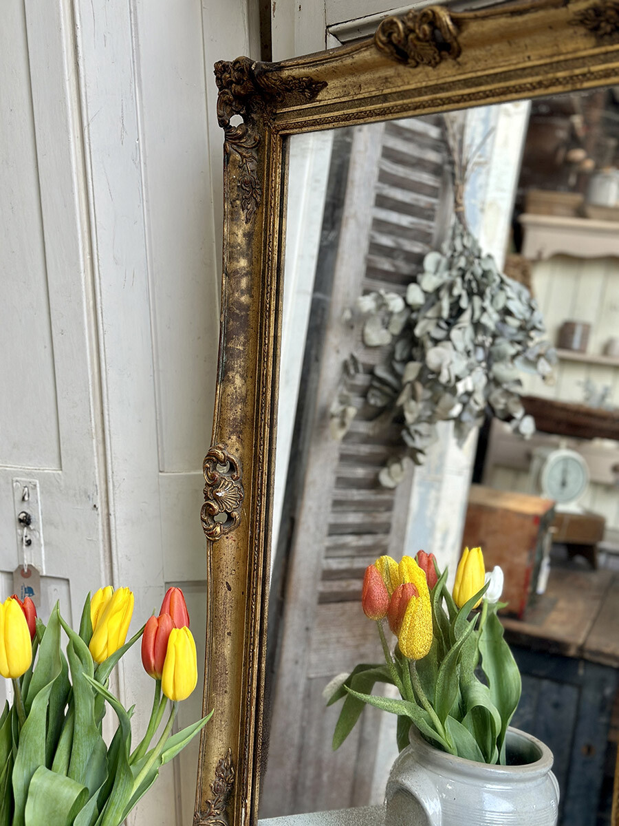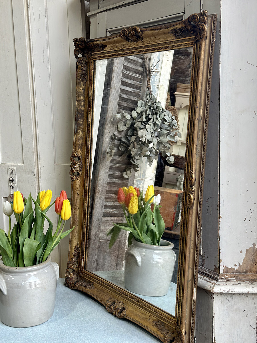길티드 프레임(gilted frame)은 일반적으로 나무로 된 바탕 프레임 위에 플라스터(석고)로 패널과 장식 형태를 만들고, 그 위에 금박을 입히는 방식으로 제작 되었습니다. 이렇게 만들어진 길티드 프레임에는 석고라는 소재의 특성 상, 오랜 세월이 흐르면서 크랙이나 칩 등이 발생할 수밖에 없는데, 오히려 이러한 흔적들은 세월감의 요소로 받아들여지고 있습니다. 길티드 프레임에 들어 있는 거울 역시 오랜 세월을 보낸 오리지널 앤틱 거울입니다.