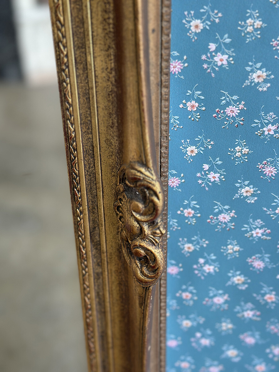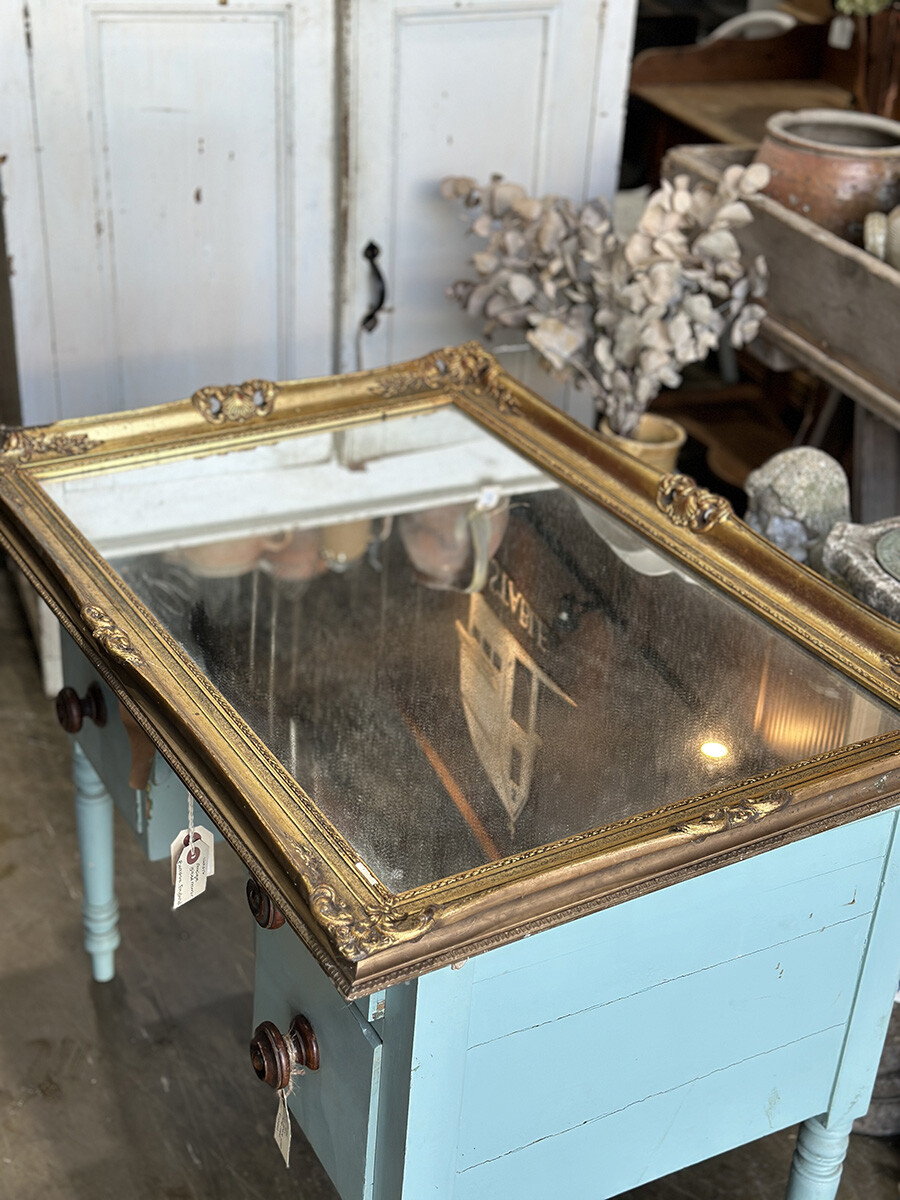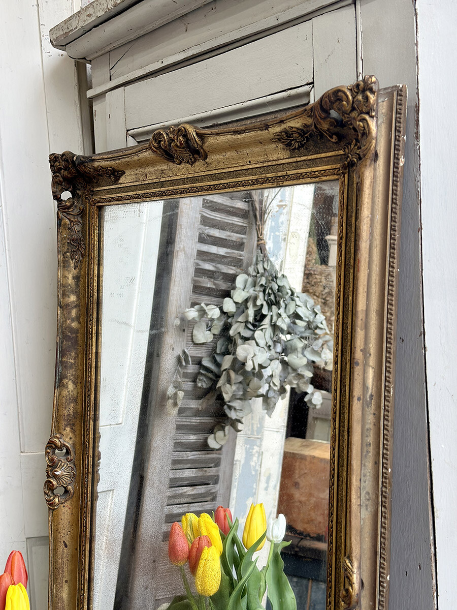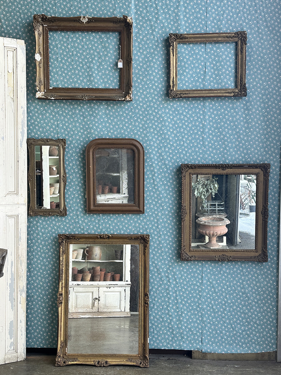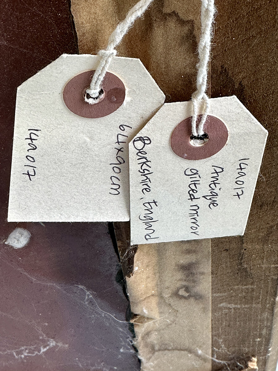 길티드 프레임(gilted frame)은 일반적으로 나무로 된 바탕 프레임 위에 플라스터(석고)로 패널과 장식 형태를 만들고, 그 위에 금박을 입히는 방식으로 제작 되었습니다. 이렇게 만들어진 길티드 프레임에는 석고라는 소재의 특성 상, 오랜 세월이 흐르면서 크랙이나 칩 등이 발생할 수밖에 없는데, 오히려 이러한 흔적들은 세월감의 요소로 받아들여지고 있습니다. 길티드 프레임에 들어 있는 거울 역시 오랜 세월을 보낸 오리지널 앤틱 거울입니다.