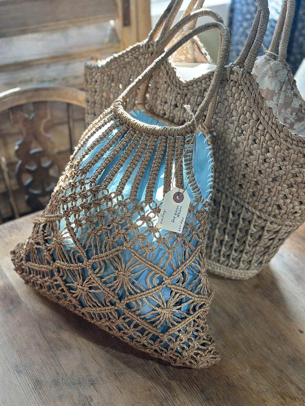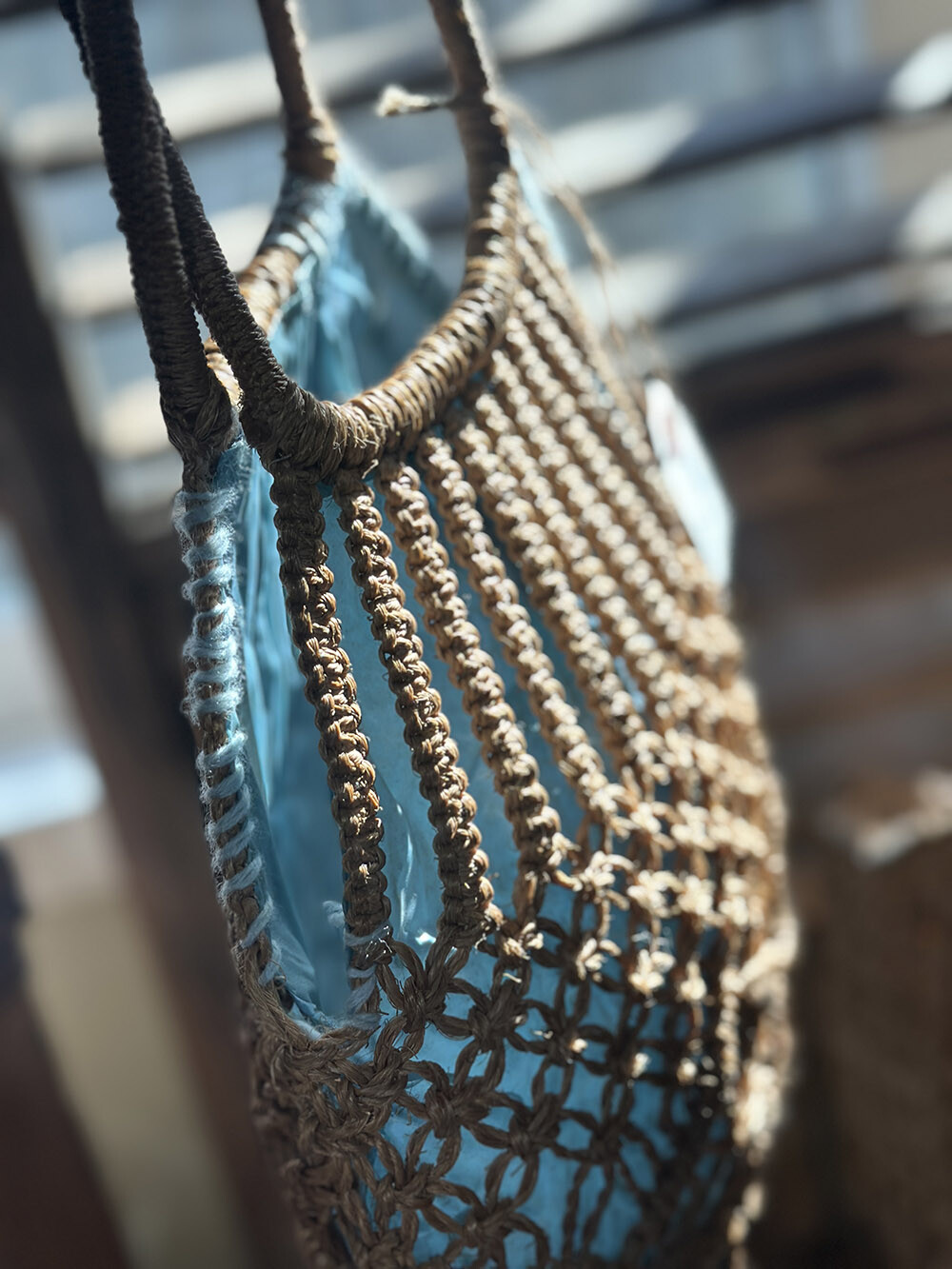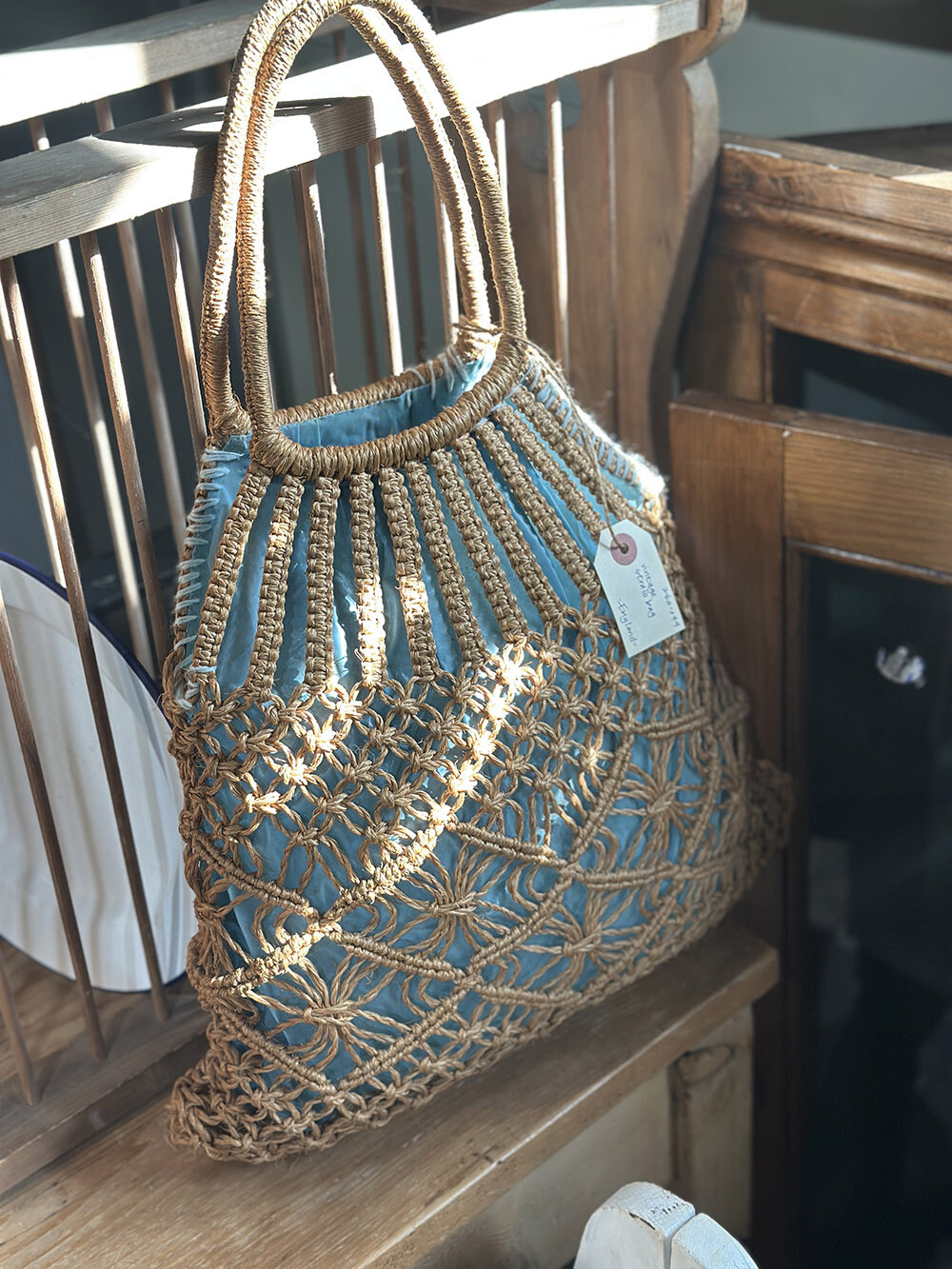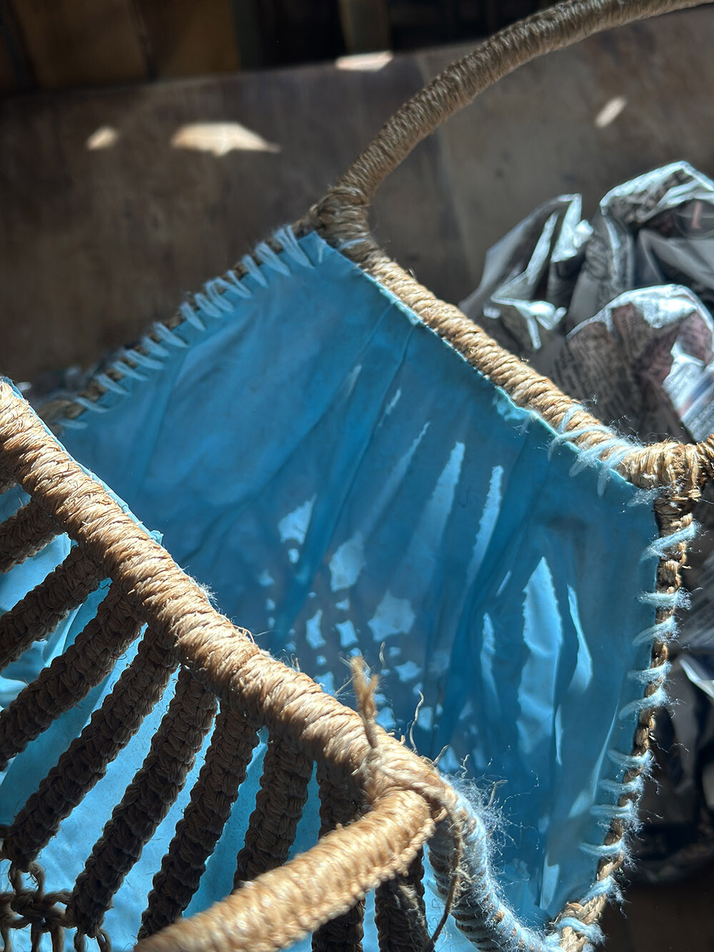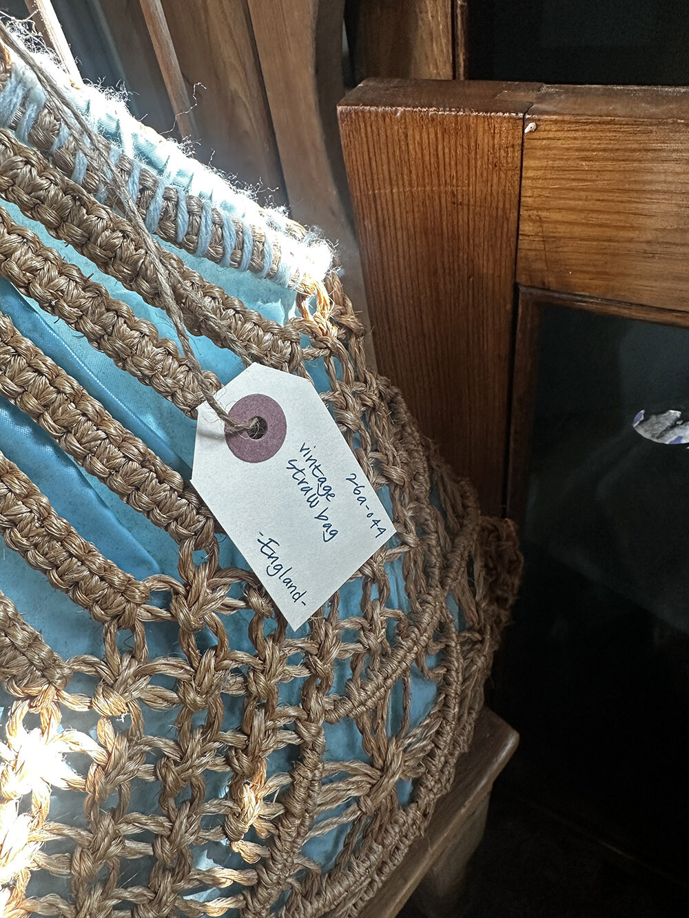 25a-044 Vintage straw bag - inner lining (blue)