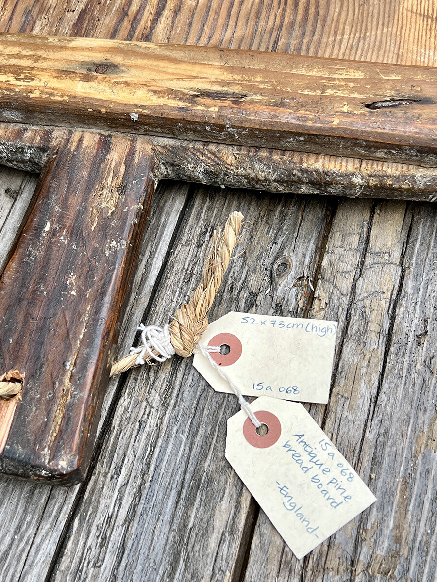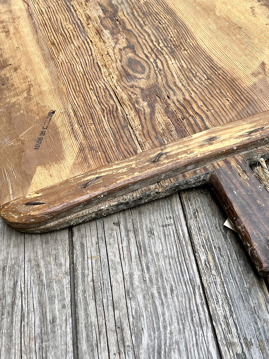 파인(pine ; 소나무) 소재의 앤틱 브레드 보드입니다. 앤틱 파인 소재의 희소성은 브레드 보드에서도 상당히 높은 편인데, 단순히 소나무이기 때문만은 아닙니다. 앤틱 파인 브레드 보드를 보면 사이즈가 꽤 넓직한 편인데, 그 보드가 여러 개의 패널을 붙여서 만든 것이 아니라 한 장으로 되어 있다는 점이 놀라운 포인트입니다. 나무를 벌목해서 판재로 가공할 때에 이 정도 크기의 원목 재료를 얻으려면, 꽤 크고 어느 정도 곧은 아름드리 소나무를 켜야 하지요. 이러한 부분이 가격적인 면에서도 드러나는 상대적으로 고가인 앤틱 키친 아이템입니다. 브레드 보드의 경우에는 실제로 제빵에 사용되었던 물건이다보니 본 상품처럼 밀가루나 도우 반죽과 같은 것들도 파티나에 자연스럽게 융화되어서 보다 더 멋진 세월감을 보여주는 경우들도 있습니다.