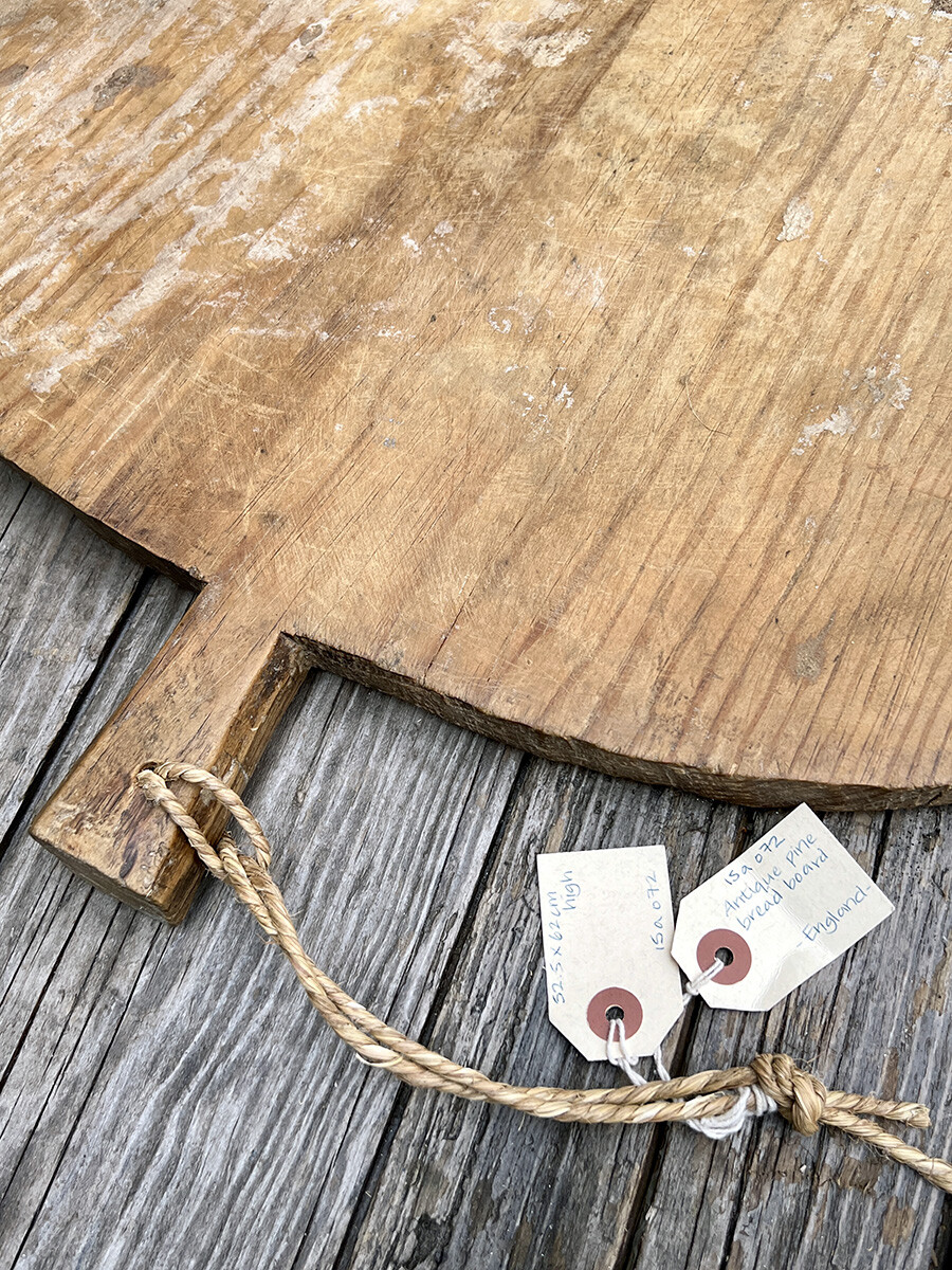 파인(pine ; 소나무) 소재의 앤틱 브레드 보드입니다. 앤틱 파인 소재의 희소성은 브레드 보드에서도 상당히 높은 편인데, 단순히 소나무이기 때문만은 아닙니다. 앤틱 파인 브레드 보드를 보면 사이즈가 꽤 넓직한 편인데, 그 보드가 여러 개의 패널을 붙여서 만든 것이 아니라 한 장으로 되어 있다는 점이 놀라운 포인트입니다. 나무를 벌목해서 판재로 가공할 때에 이 정도 크기의 원목 재료를 얻으려면, 꽤 크고 어느 정도 곧은 아름드리 소나무를 켜야 하지요. 이러한 부분이 가격적인 면에서도 드러나는 상대적으로 고가인 앤틱 키친 아이템입니다. 브레드 보드의 경우에는 실제로 제빵에 사용되었던 물건이다보니 본 상품처럼 밀가루나 도우 반죽과 같은 것들도 파티나에 자연스럽게 융화되어서 보다 더 멋진 세월감을 보여주는 경우들도 있습니다.