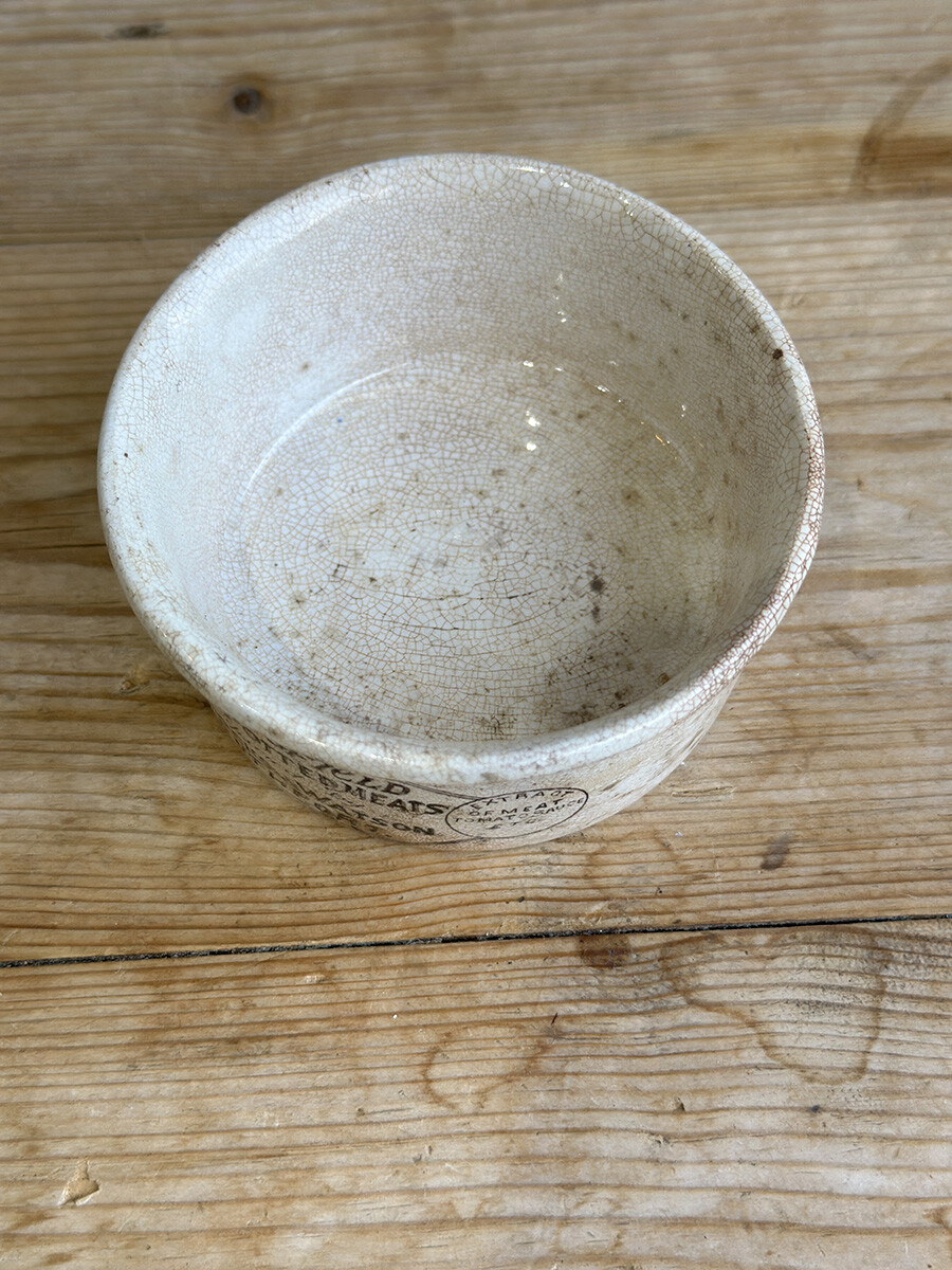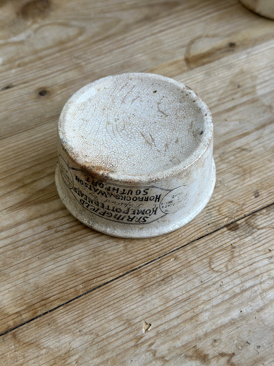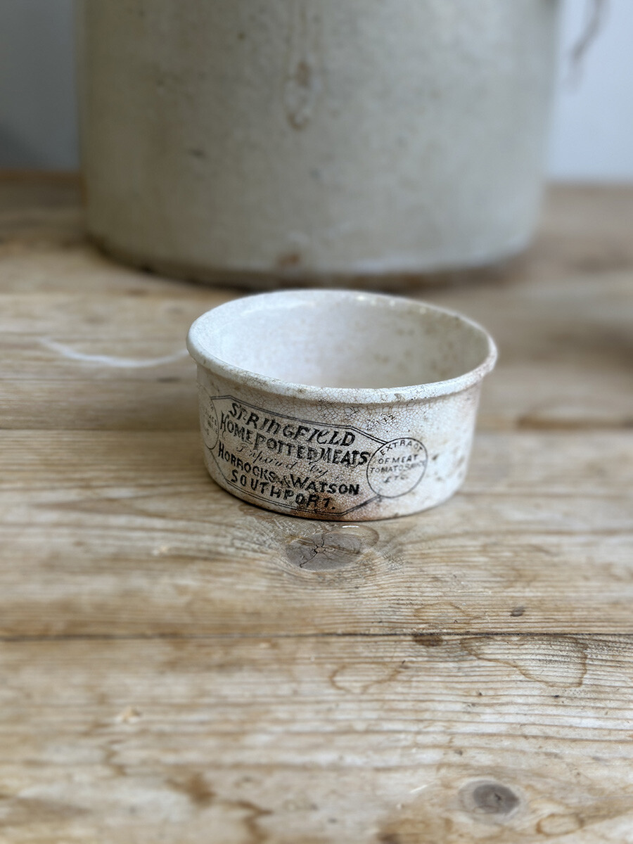 아이언스톤(ironstone) 소재로 만들어진 앤틱 스몰 자입니다. 아이언스톤 소재의 도기는 충격에 강하고, 위생적이라 식품의 보존과 유통을 위해 많이 사용되었습니다. 이러한 경향성은 1800년대 후반부터 영국에서 시작된 대형 식료품점(슈퍼마켓의 원형이 됩니다)의 등장으로 인해 가속화 되었죠. 이렇게 식료품을 전문적으로 판매하는 곳을 푸드홀 카운터 서비스 마켓이라고 하는데, 베이컨이나 햄, 잼과 빵, 그리고 앤초비나 포티드 미츠가 주요 판매품이었습니다.