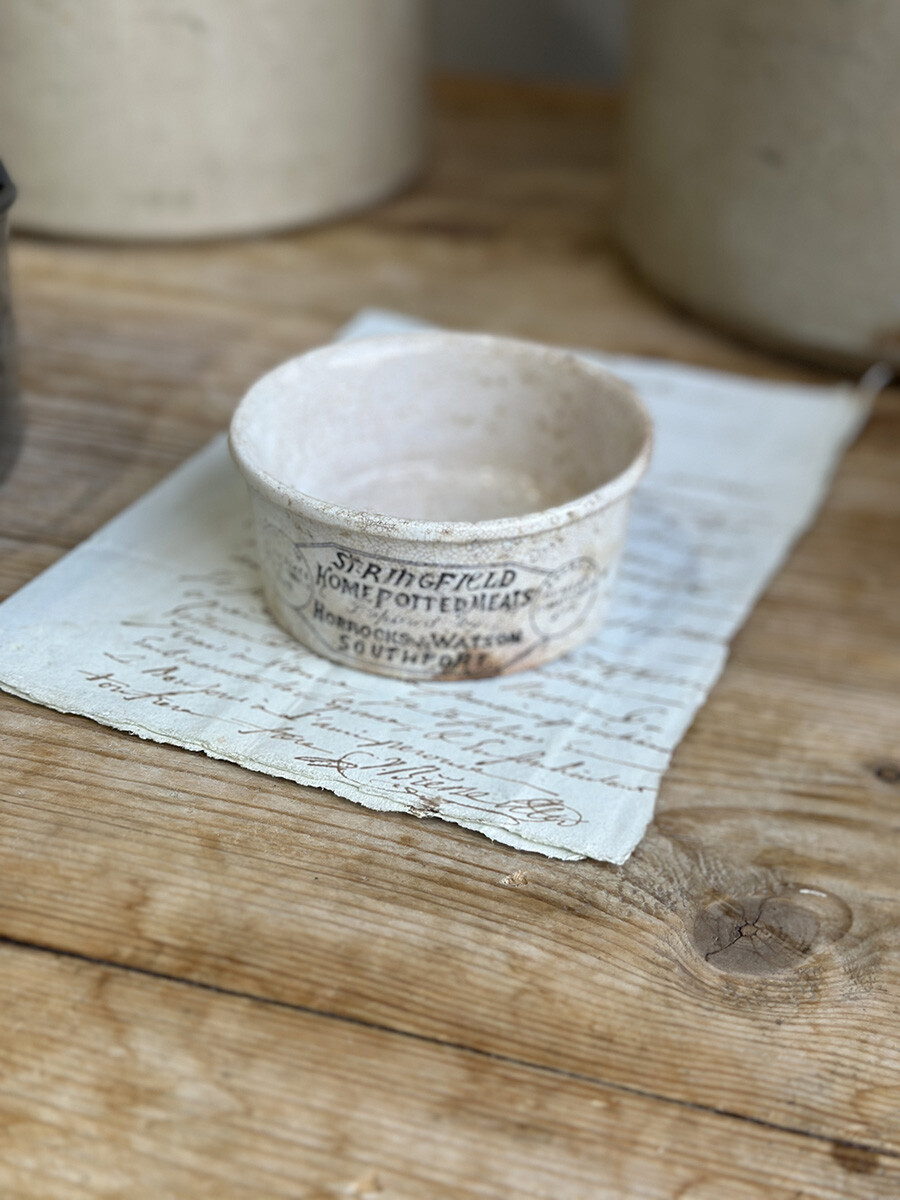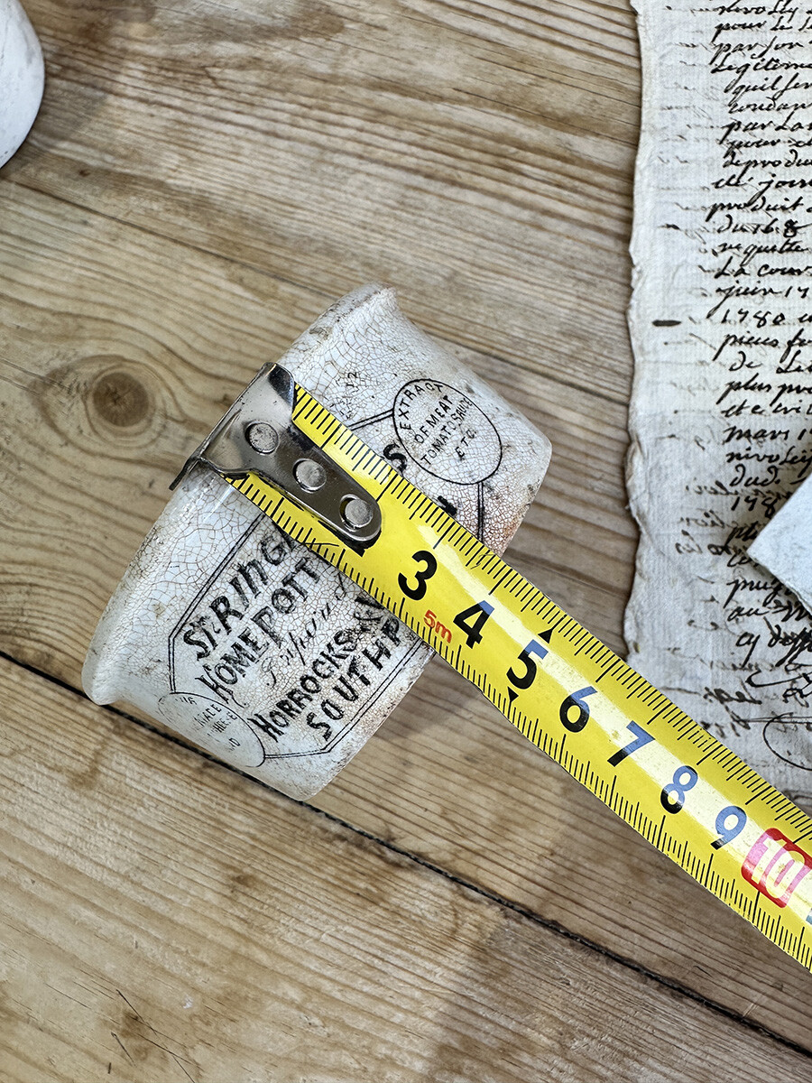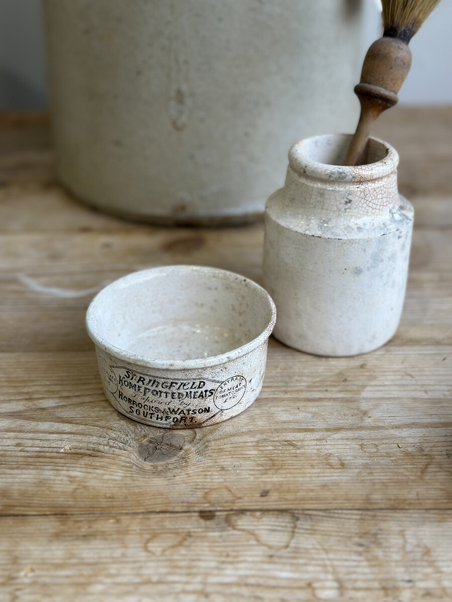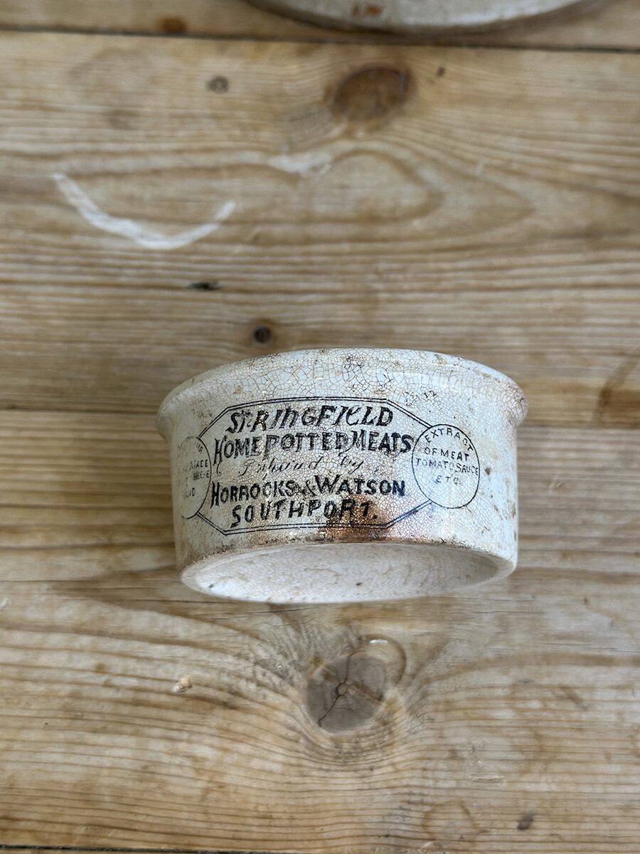 아이언스톤(ironstone) 소재로 만들어진 앤틱 스몰 자입니다. 아이언스톤 소재의 도기는 충격에 강하고, 위생적이라 식품의 보존과 유통을 위해 많이 사용되었습니다. 이러한 경향성은 1800년대 후반부터 영국에서 시작된 대형 식료품점(슈퍼마켓의 원형이 됩니다)의 등장으로 인해 가속화 되었죠. 이렇게 식료품을 전문적으로 판매하는 곳을 푸드홀 카운터 서비스 마켓이라고 하는데, 베이컨이나 햄, 잼과 빵, 그리고 앤초비나 포티드 미츠가 주요 판매품이었습니다.