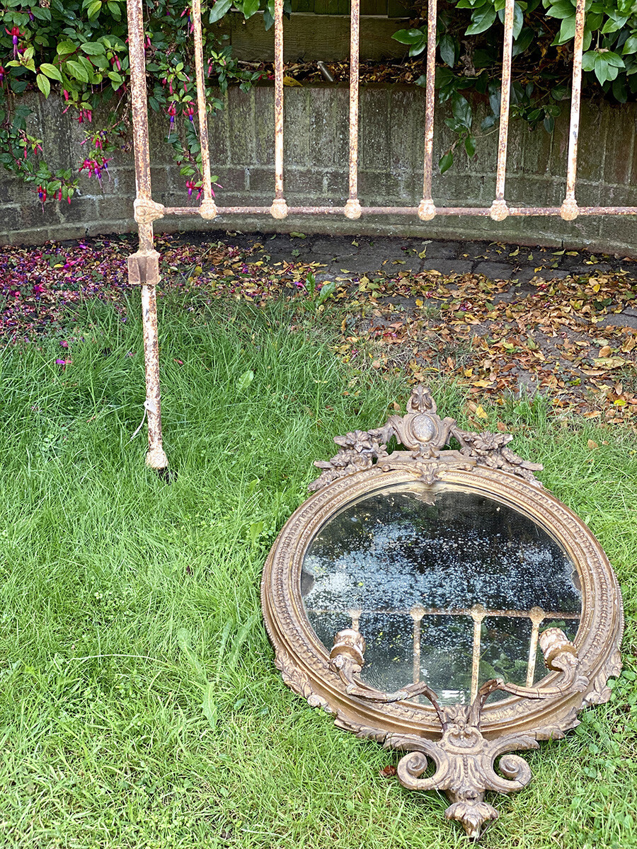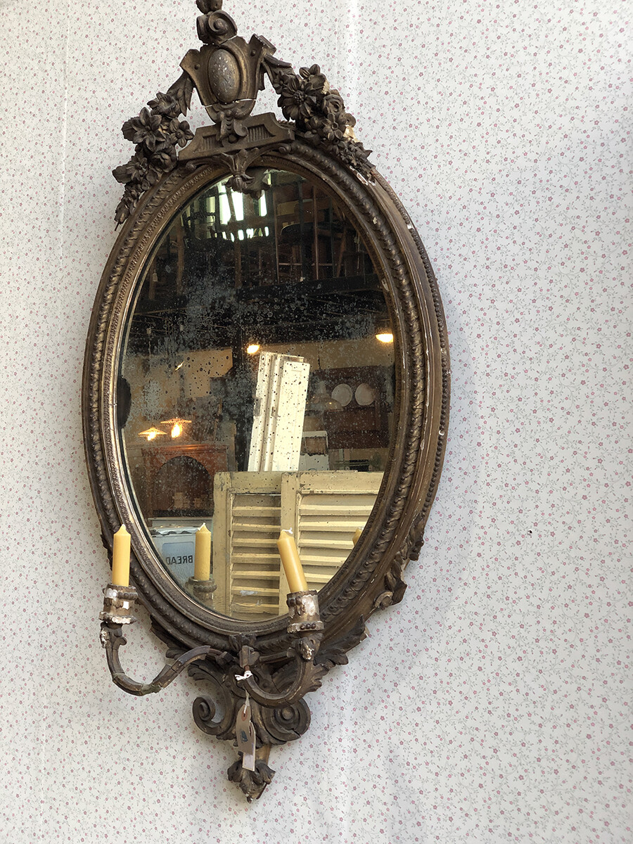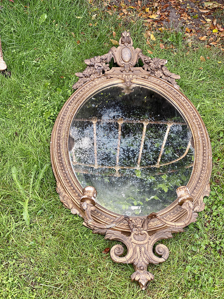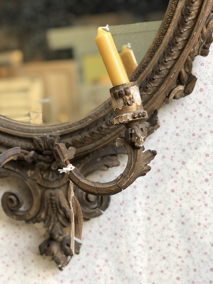 신고전주의 양식의 감각적인 장식과 2개의 캔들 홀더가 전면부에 설치되어 있어 보기 드문 앤틱 거울입니다. 거울 프레임의 장식은 플라스터(석고)로 만들어져 있으며, 거을도 오리지널 파츠가 그대로 보존되어 있습니다. 프레임 장식은 사이 사이 금이 가고 일부 떨어진 부분이 있으며, 거울면에도 뿌옇게 오랜 세월의 흔적이 남아 있습니다. 하지만 오리지널 앤틱 거울은 플라스터 장식과 거울면이 낡을 수록 오히려 선호되고 있으며, 보다 훨씬 높은 가격으로 영국 현지에서 거래되고 있음을 참고 하시기 바랍니다.