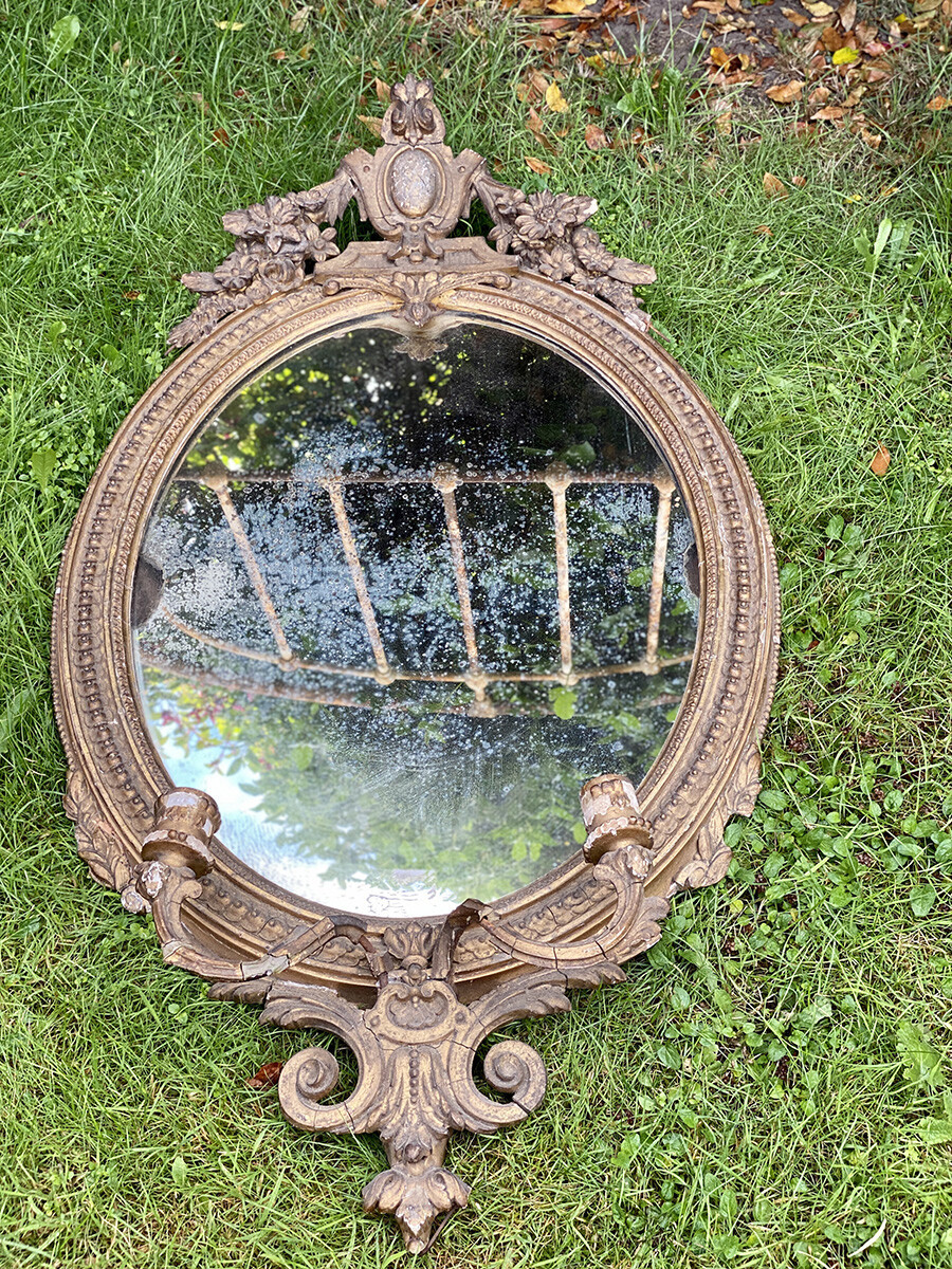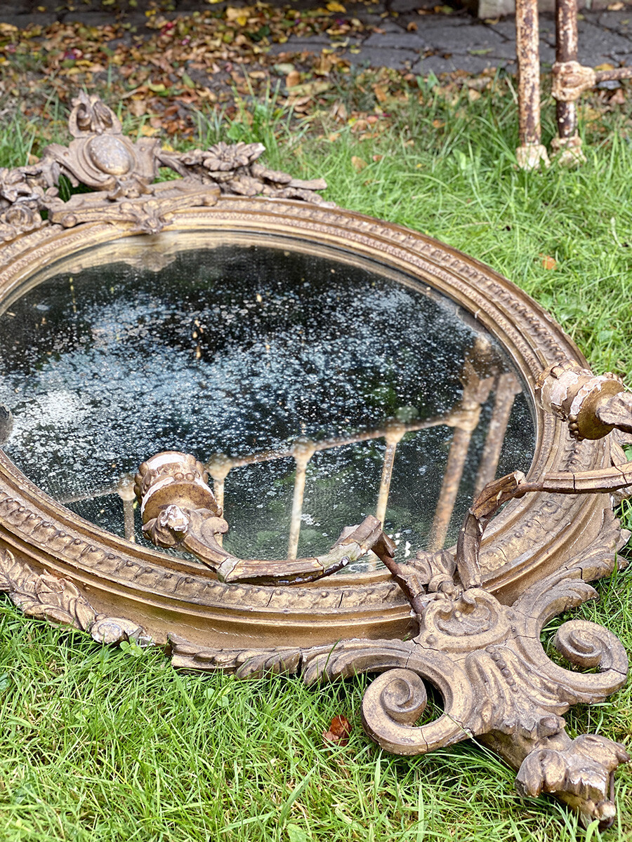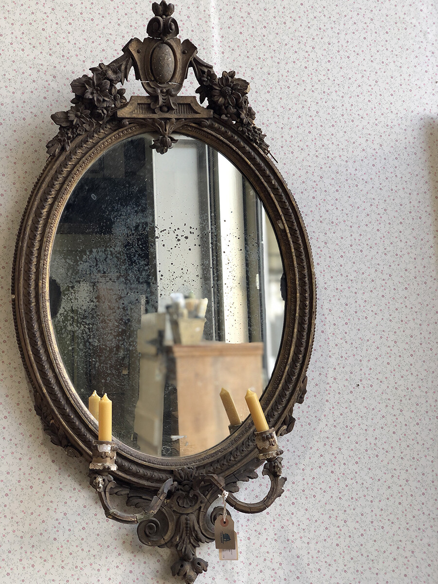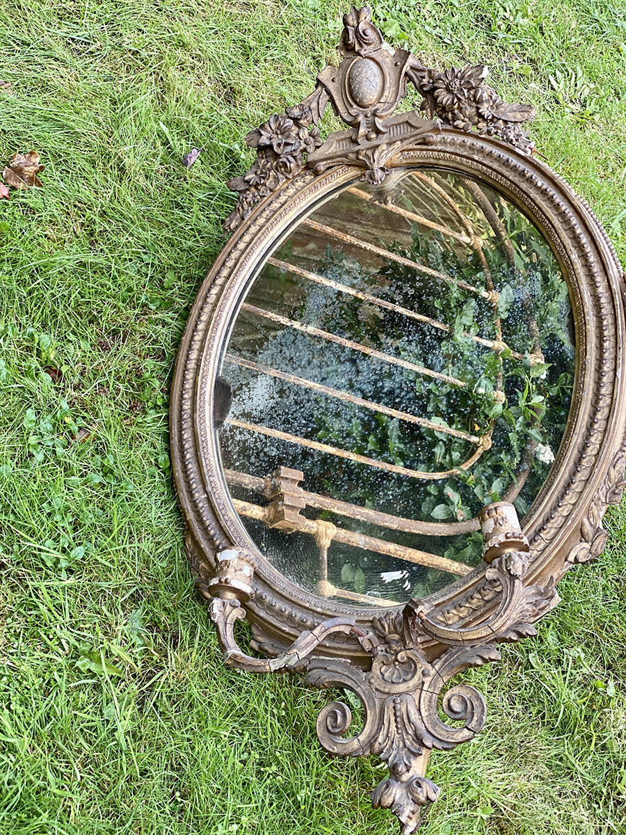 신고전주의 양식의 감각적인 장식과 2개의 캔들 홀더가 전면부에 설치되어 있어 보기 드문 앤틱 거울입니다. 거울 프레임의 장식은 플라스터(석고)로 만들어져 있으며, 거을도 오리지널 파츠가 그대로 보존되어 있습니다. 프레임 장식은 사이 사이 금이 가고 일부 떨어진 부분이 있으며, 거울면에도 뿌옇게 오랜 세월의 흔적이 남아 있습니다. 하지만 오리지널 앤틱 거울은 플라스터 장식과 거울면이 낡을 수록 오히려 선호되고 있으며, 보다 훨씬 높은 가격으로 영국 현지에서 거래되고 있음을 참고 하시기 바랍니다.