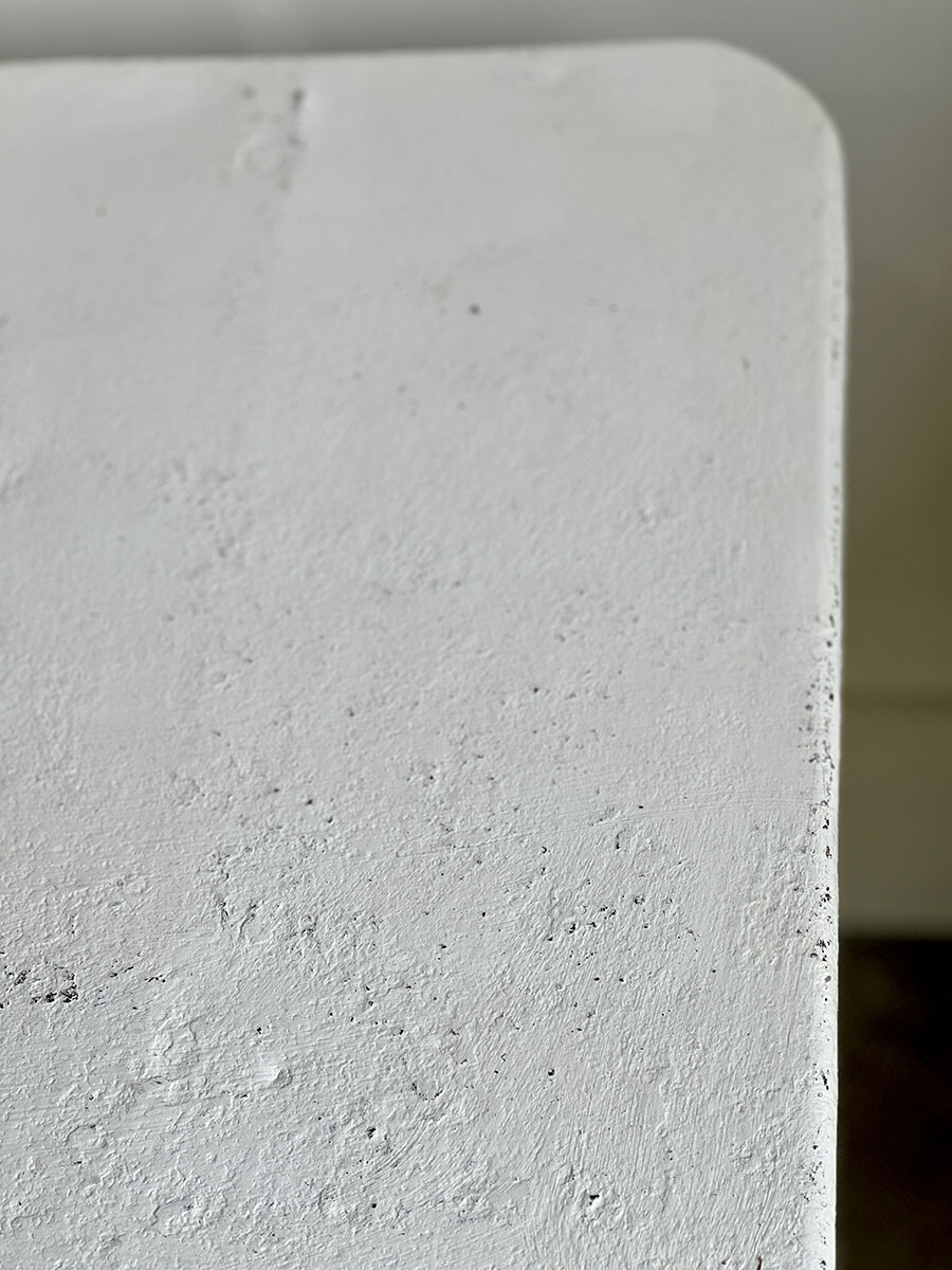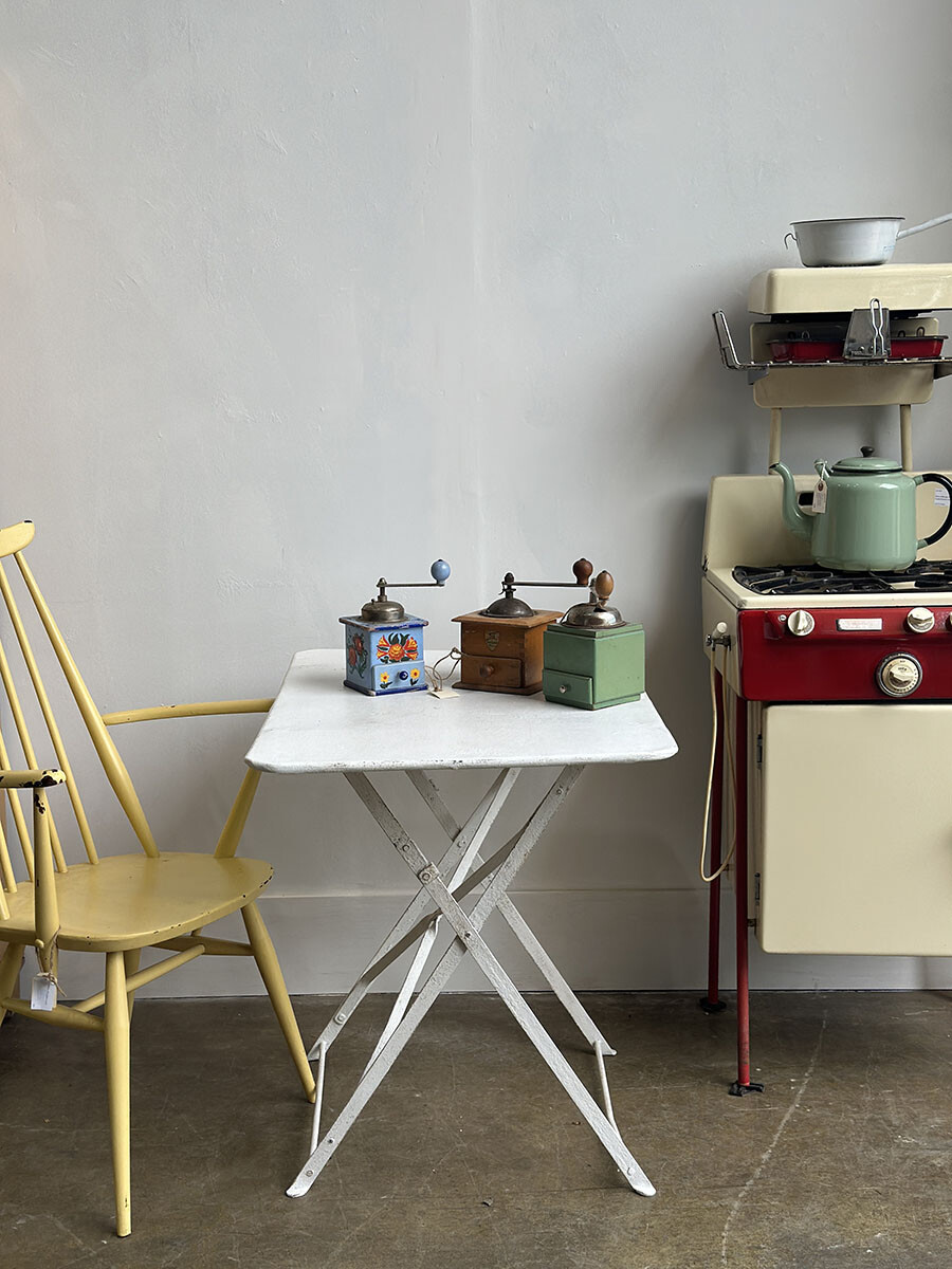 철 주물로 제작된 빈티지 가든 메탈 폴딩 테이블입니다. 1800년대에서 1900년대 초중반까지, 제국주의 시대의 영국에서는 식민지 무역을 통해 유입되었던 철 자원이 다른 유럽 국가들에 비해 흔했기 때문에, 본 상품과 같이 가든에서 사용할 테이블이나 체어, 거대한 화분이나 각종 용품들을 철로 제작하던 시기가 있었습니다. 이 앤틱 가든 메탈 폴딩 테이블 역시 당시에 제작되었고, 이후로 아주 오랜 시간동안 영국인들의 정원에서 사용되었던 것입니다. 오랜 시간 사용하면서 이전 주인들에 의해서 도색은 다르게 바뀌어 왔지만, 그 밑에 숨겨진 주물 몸체는 매우 견고하며 묵직합니다. 도막의 표면에 슬몃 슬몃 드러나는 본체 금속의 흔적들에서 묘한 정감이 느껴지죠.