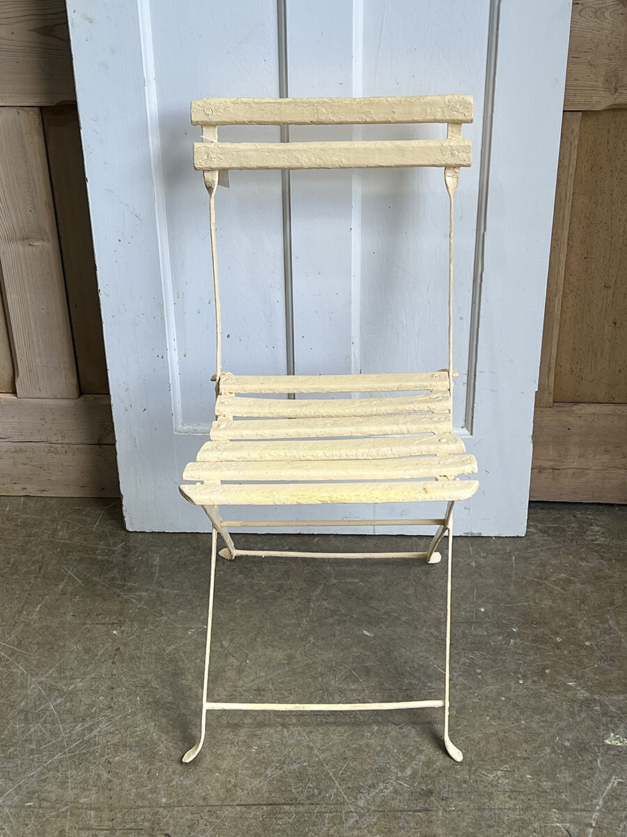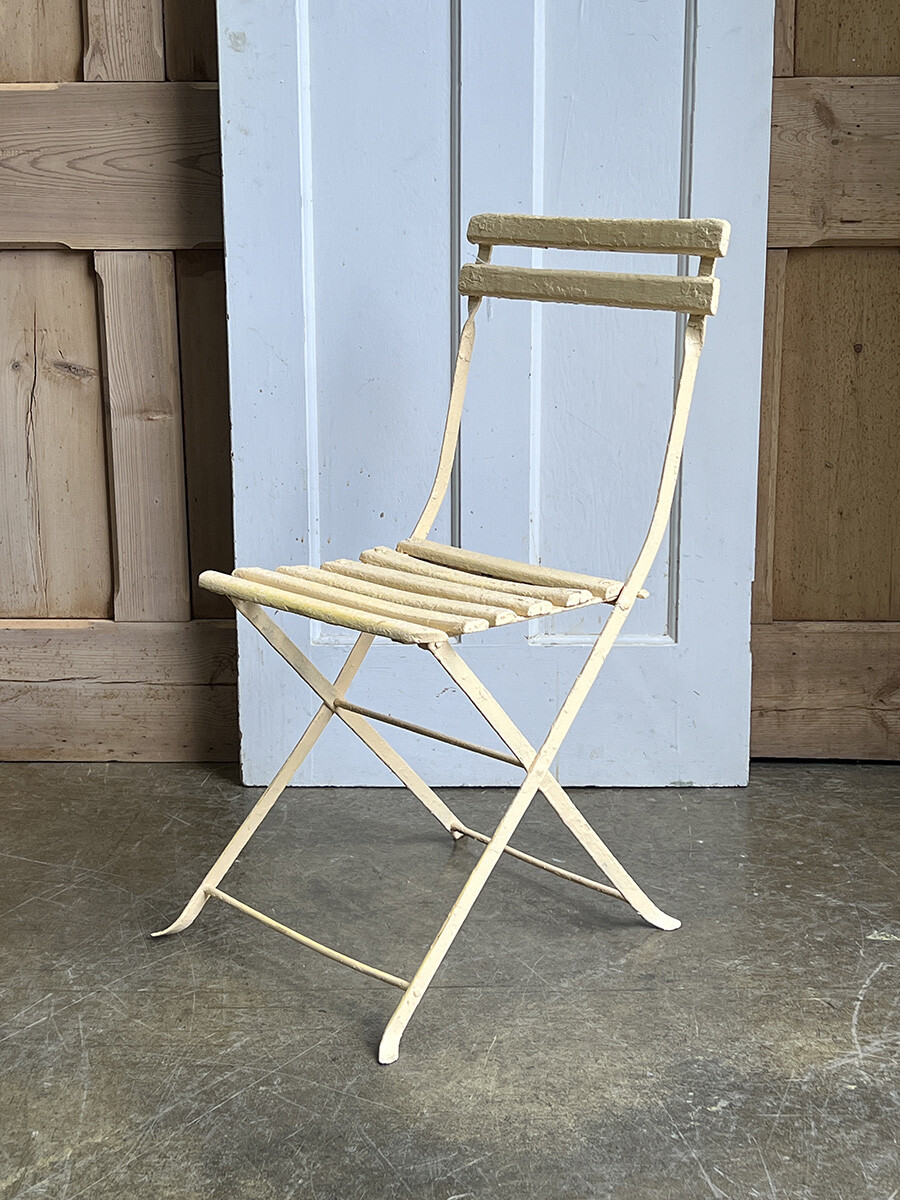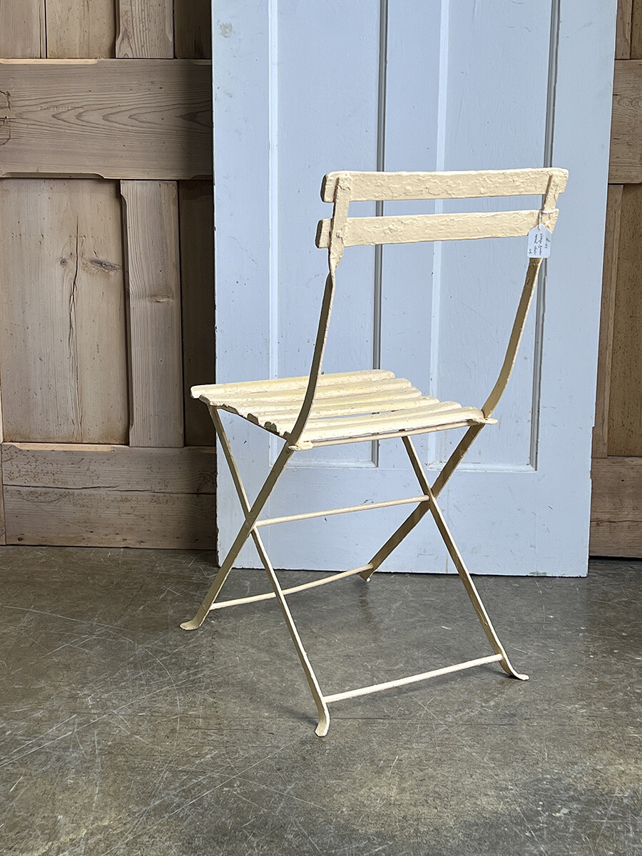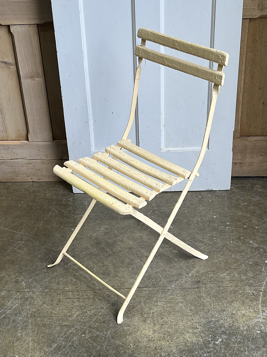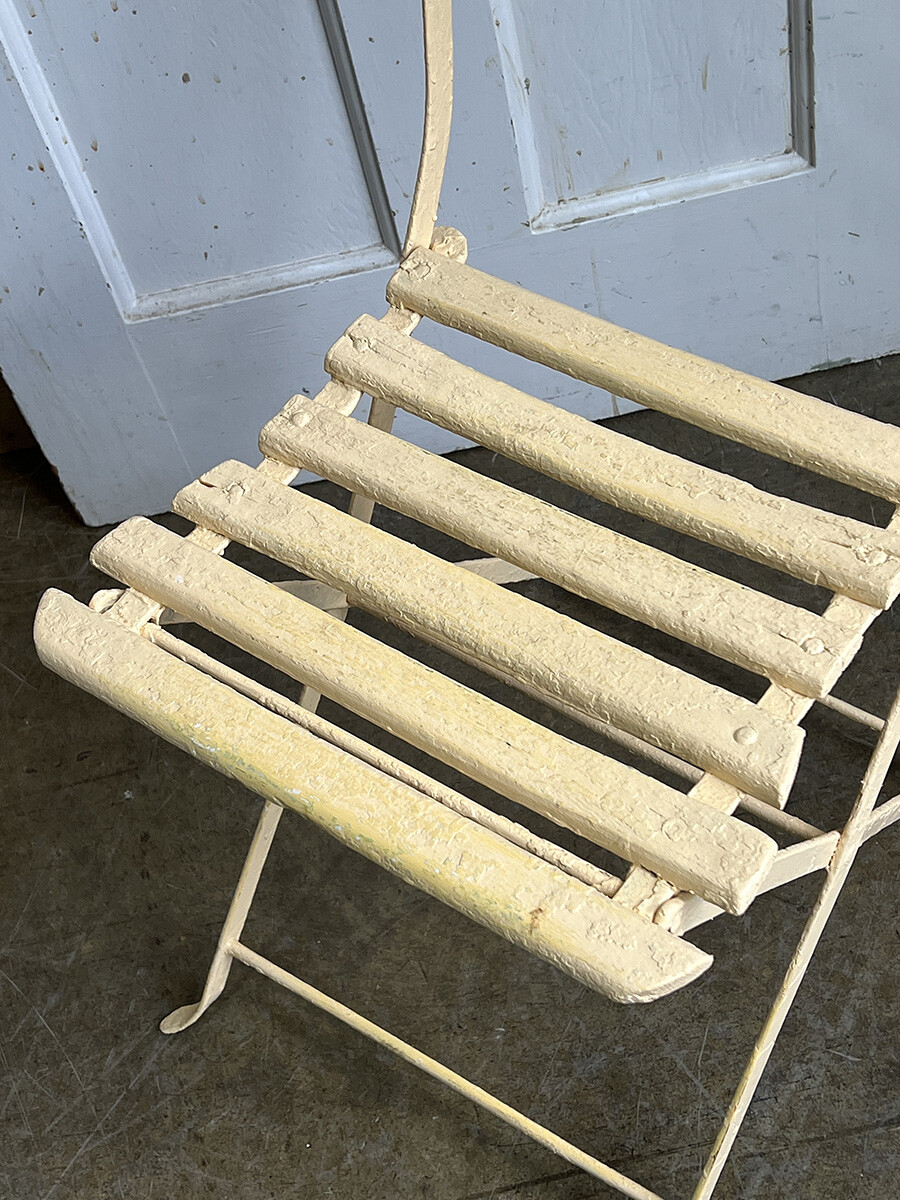가든 및 야외용 메탈 폴딩 체어입니다. 원목 패널과 철제 프레임으로 제작되어 있으며 접이식 구조를 갖고 있습니다. 전체적으로 버터 옐로우 컬러로 칠해져 있습니다.