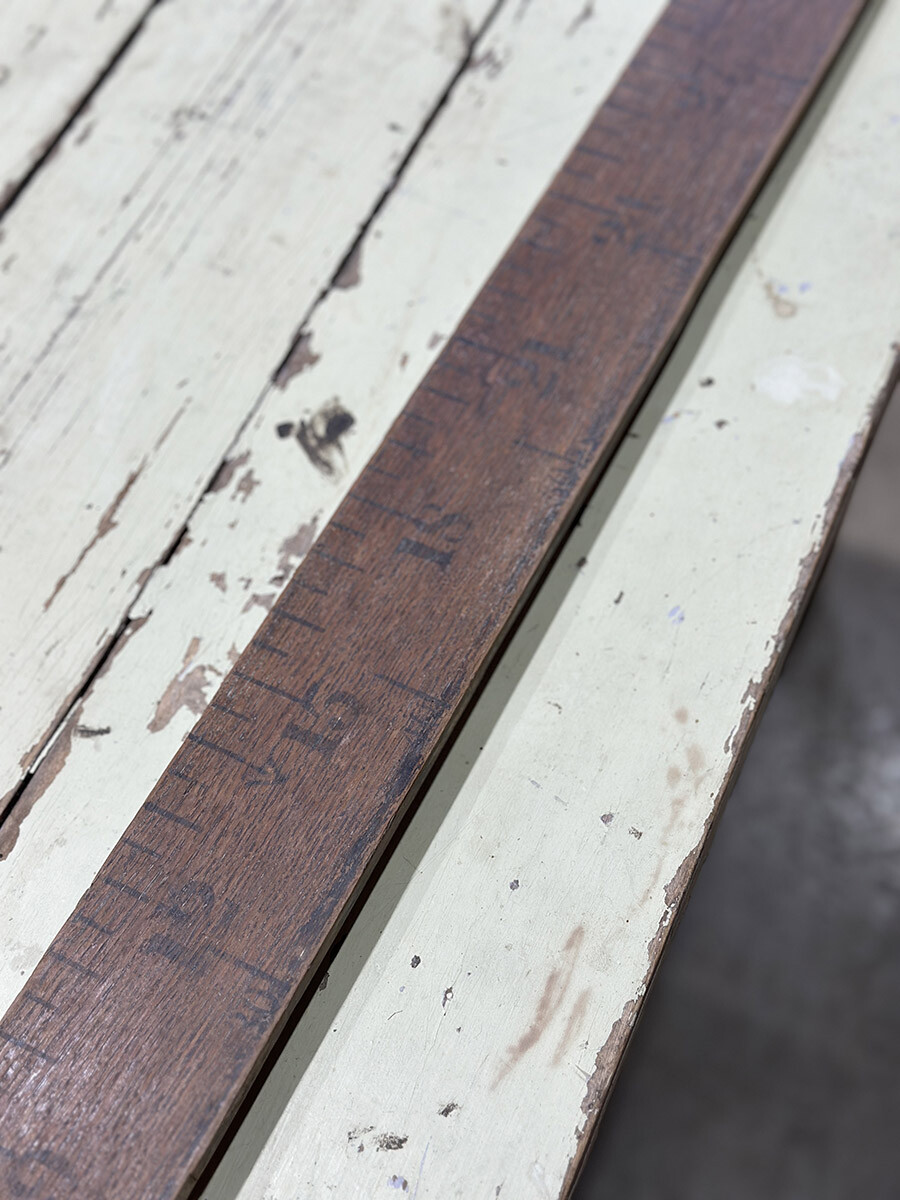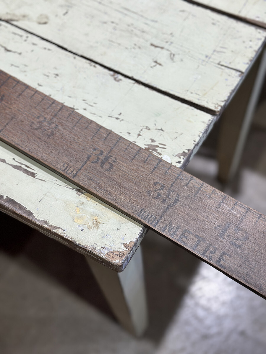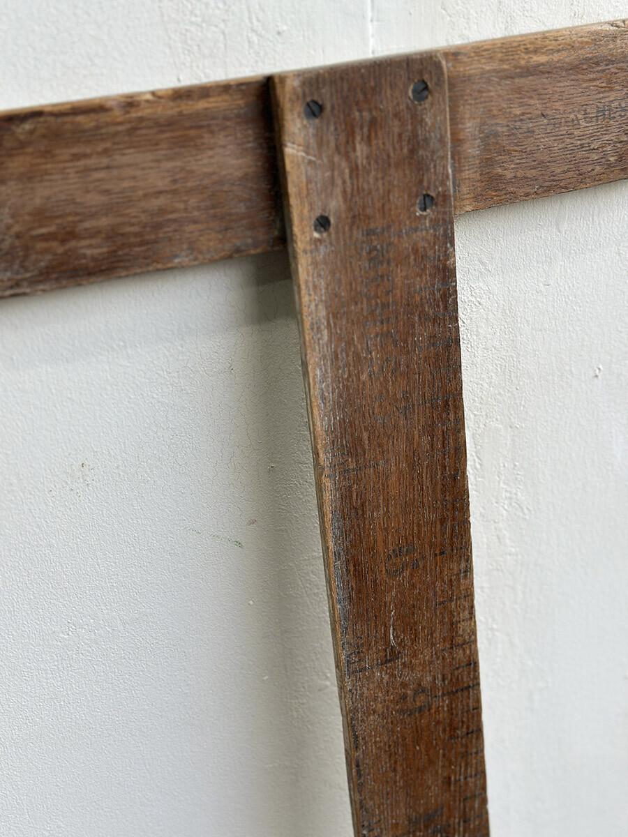 드레스 메이커가 사용했던 빈티지 T 자입니다. 소재는 원목이며, 단위는 cm / inch 가 함께 병기되어 있습니다.