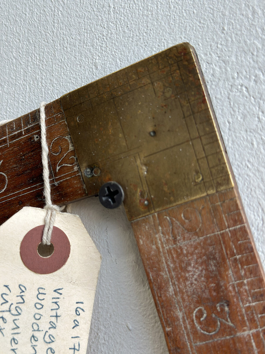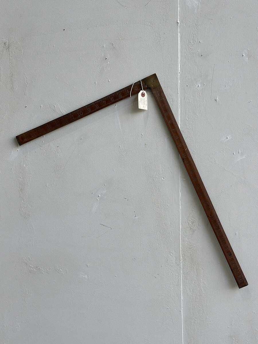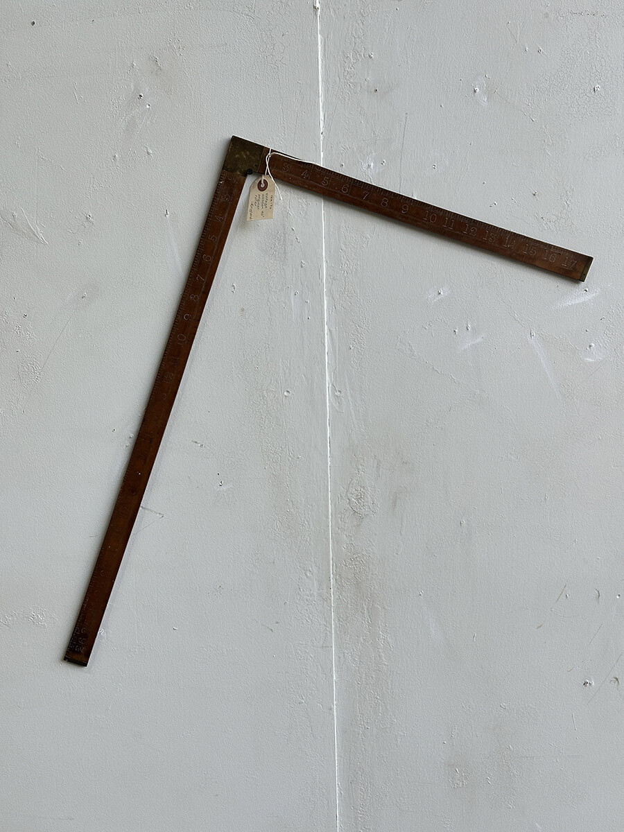 원목으로 제작되어 있는 빈티지 직각자입니다. 이음매와 끝 부분이 브라스 소재로 되어 있어서 고급스러운 멋이 있습니다. 단위는 영국에서 사용되는 인치(inch)로 되어 있습니다.