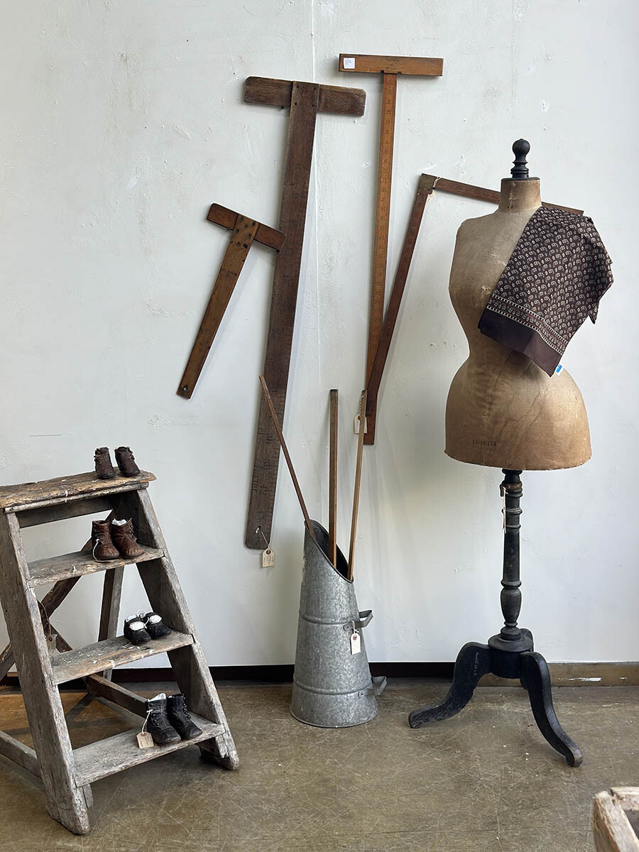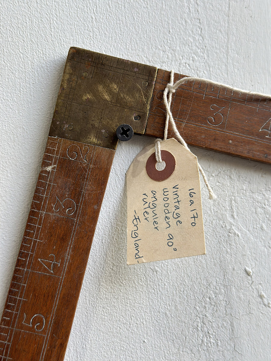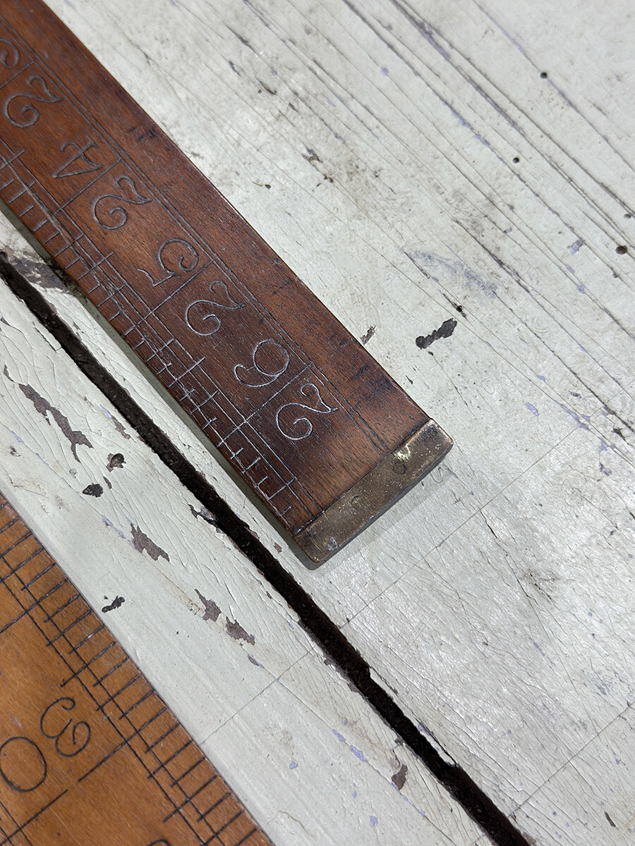 원목으로 제작되어 있는 빈티지 직각자입니다. 이음매와 끝 부분이 브라스 소재로 되어 있어서 고급스러운 멋이 있습니다. 단위는 영국에서 사용되는 인치(inch)로 되어 있습니다.