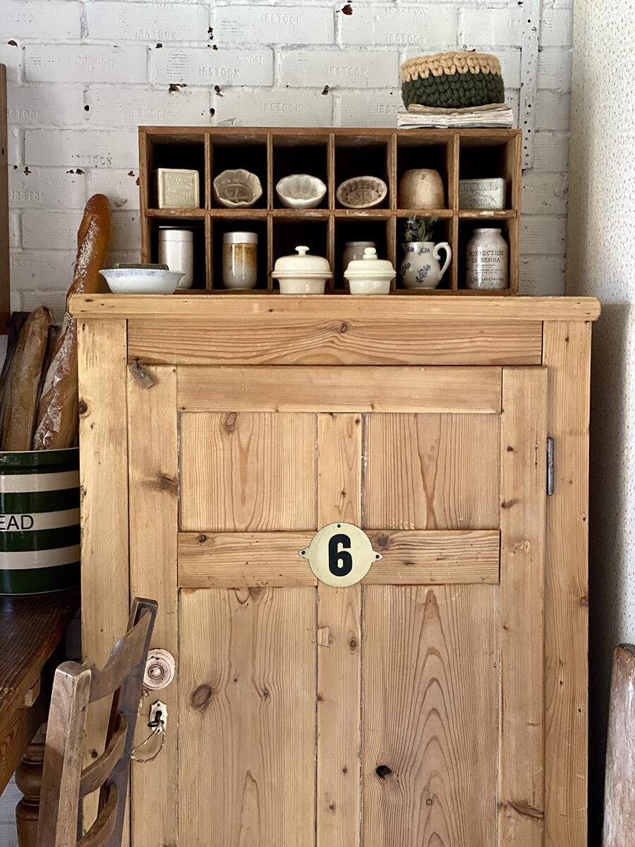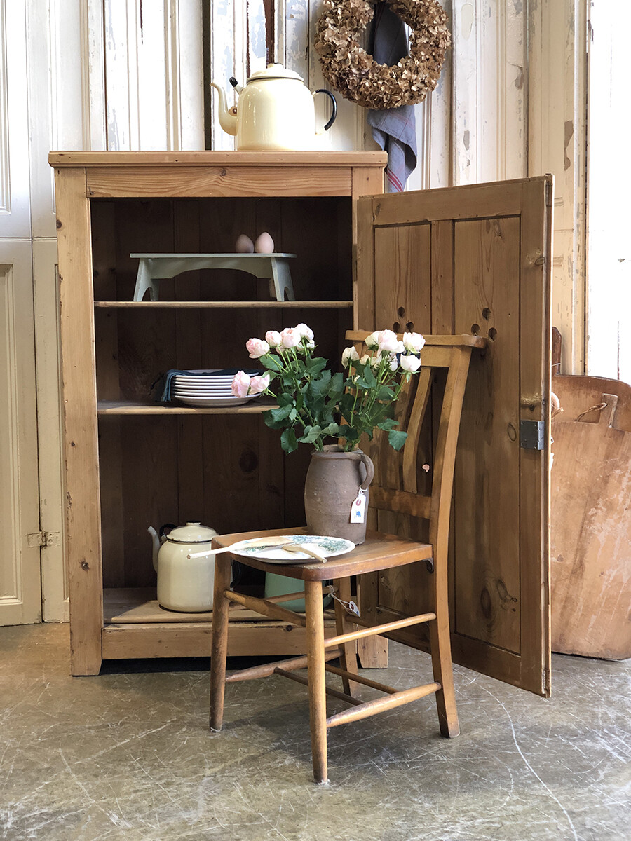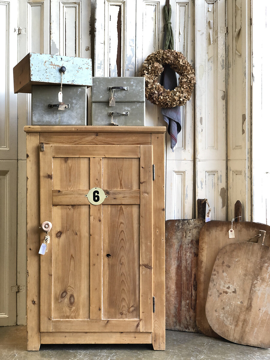 올드 빈티지 파인 소재의 키친 커보드입니다. 커보드 내부는 전체 4단으로 나뉘어 있습니다. 심플한 디자인의 올드 파인 커보드의 표면에 형성된 파티나가 전체적으로 깔끔한 것으로 보아, 처음부터 내츄럴 우든 상태로 바니쉬가 사용된 적 없이 잘 보전되어 온 것으로 보입니다. 앙증맞은 연한 핑크의 앤틱 놉이 손잡이로 달려 있으며, 열쇠가 포함되어 있습니다.