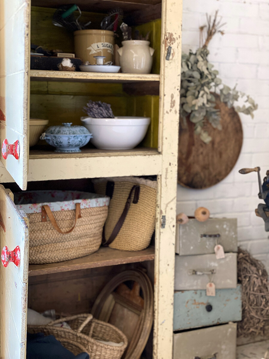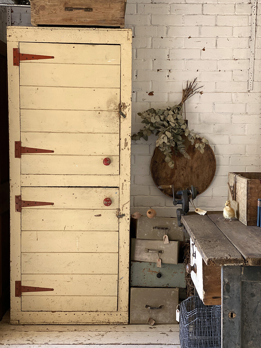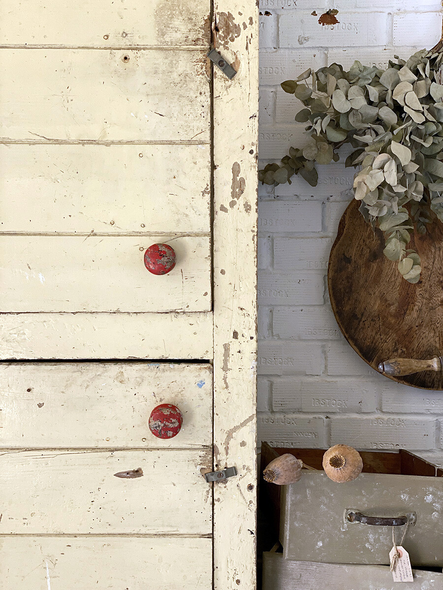 17-091 Antique pine shabby chic cupboard (cream + red handles)