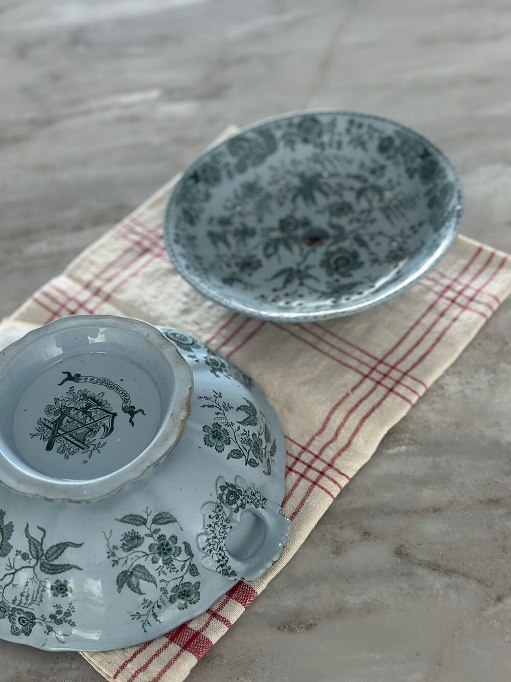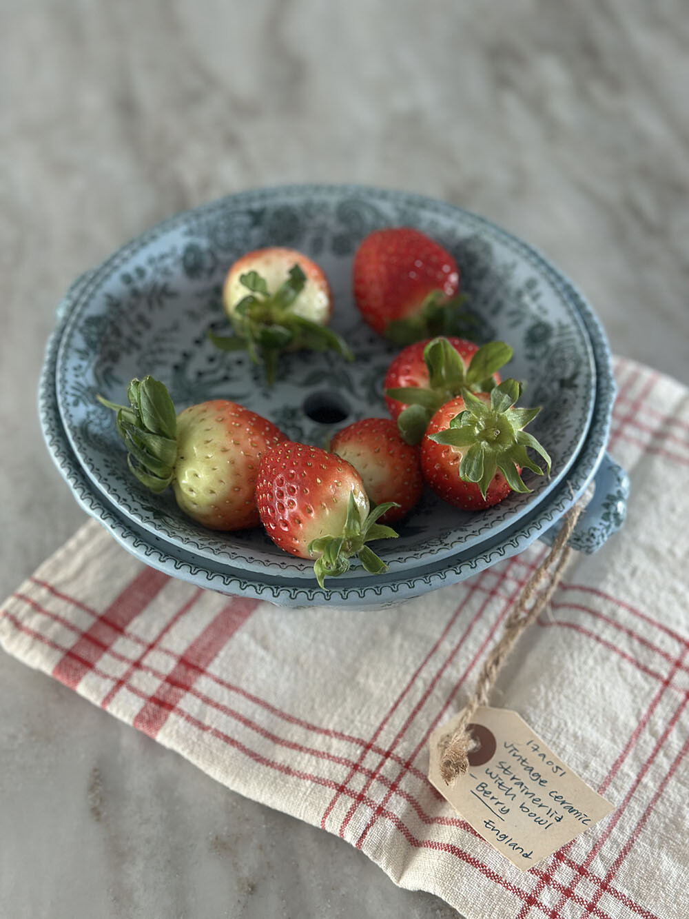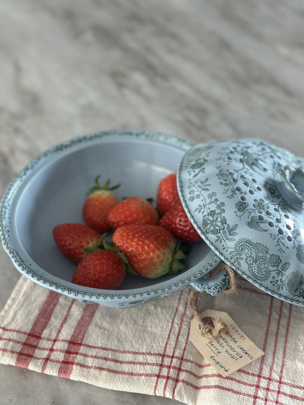 빈티지 세라믹 베리 보울은 명칭대로 딸기를 비롯한 베리류를 씻어서 담아 두었던 베리류 전용 테이블웨어입니다. 리드(뚜껑)를 스트레이너로 쓸 수 있도록 작은 물빠짐용 구멍들이 있어서, 장식적인 오브제로도 실용적으로도 매우 유용한 아이템입니다.