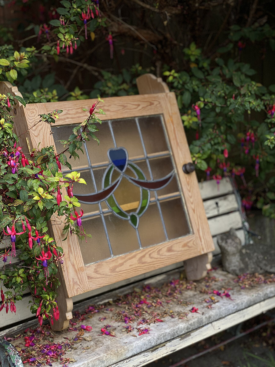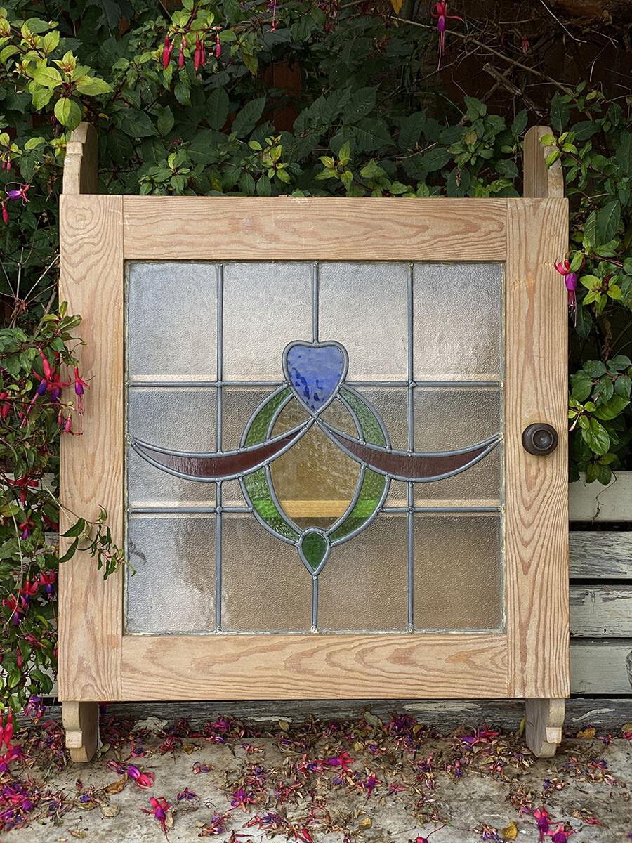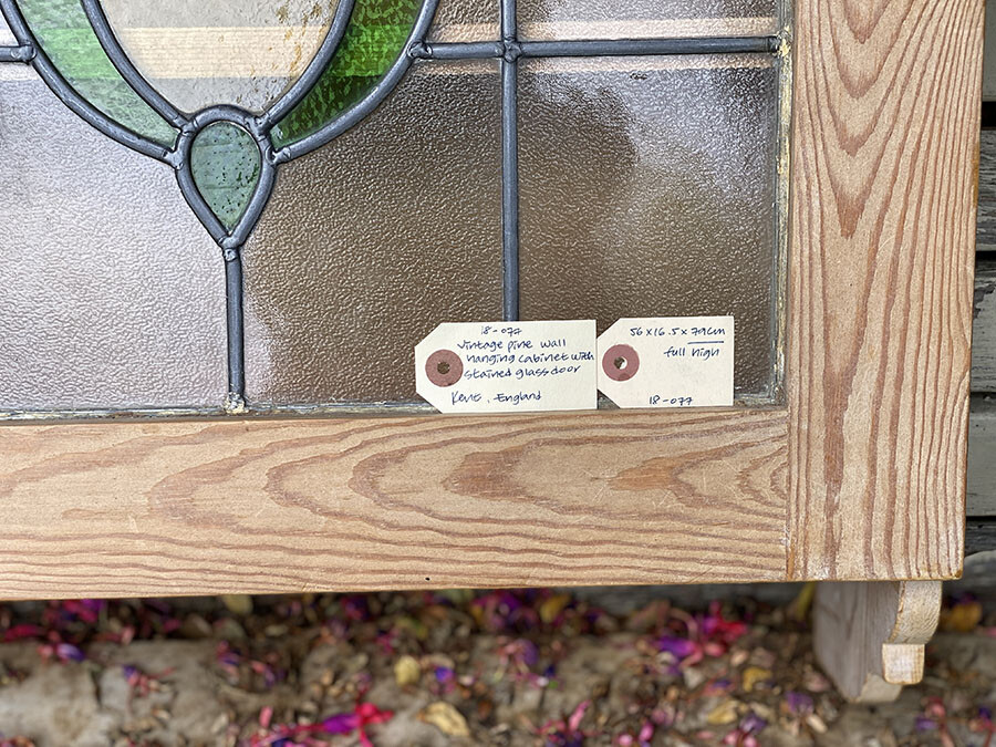 18-077 Vintage pine wall hanging cabinet with stained glass door
