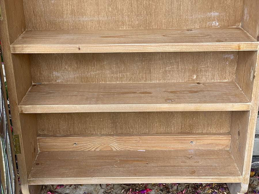 스테인드 글래스 도어가 있는 벽걸이 스타일의 빈티지 파인 캐비넷입니다. 아담한 사이즈이며, 내부에는 선반이 3단으로 나뉘어져 있습니다. 벽에 피스를 박을 수 있는 구멍이 내부에 뚫려 있습니다.