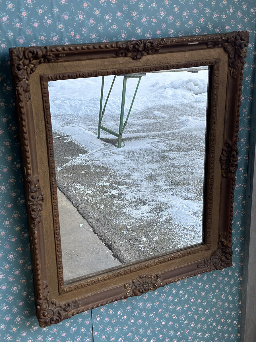 길티드 프레임(gilted frame)은 일반적으로 나무로 된 바탕 프레임 위에 플라스터(석고)로 패널과 장식 형태를 만들고, 그 위에 금박을 입히는 방식으로 제작 되었습니다. 이렇게 만들어진 길티드 프레임에는 석고라는 소재의 특성 상, 오랜 세월이 흐르면서 크랙이나 칩 등이 발생할 수밖에 없는데, 오히려 이러한 흔적들은 세월감의 요소로 받아들여지고 있습니다. 이러한 길티드 프레임을 활용하여 만들어진 거울입니다.