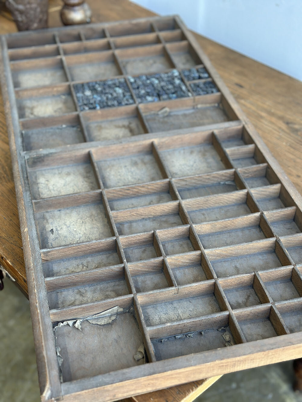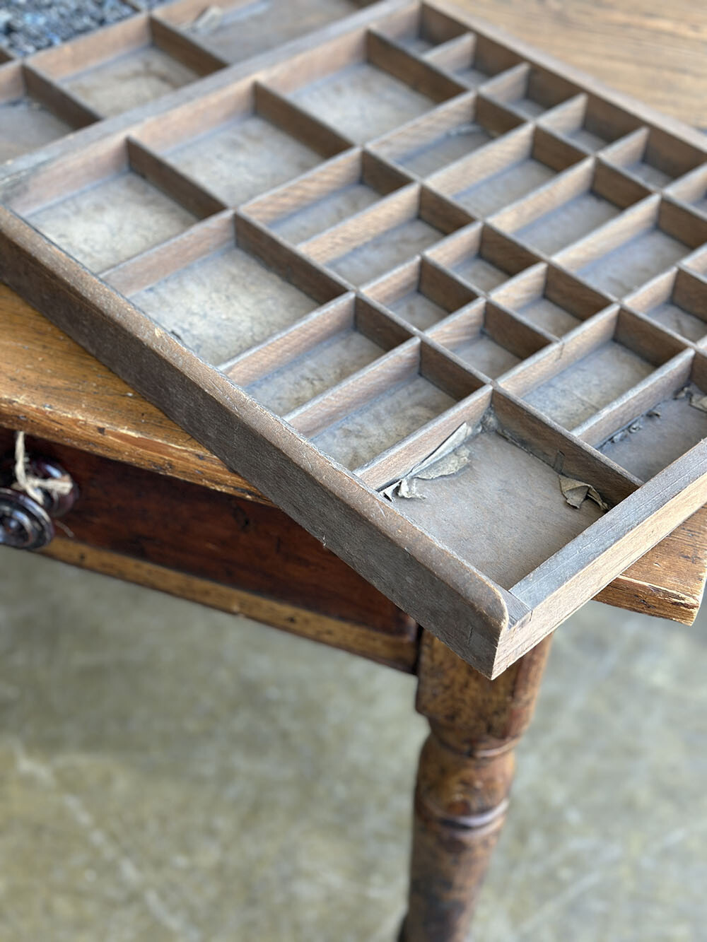 활자를 보관하던 올드 빈티지 레터프레스 우든 트레이입니다. 보통 '트레이'라고는 하지만, 활자를 보관하기 위한 얇고 넓은 서랍을 말하는데, 그 내부는 필요에 따라 격자 파티션으로 나뉘어져 있습니다. 이 파티션의 모양이나 나무결, 사이즈에 따라 무궁무진한 제각각의 캐릭터를 갖고 있어서, 다양한 빈티지 디스플레이 연출을 위한 아이템으로 활용되는 아이템입니다.