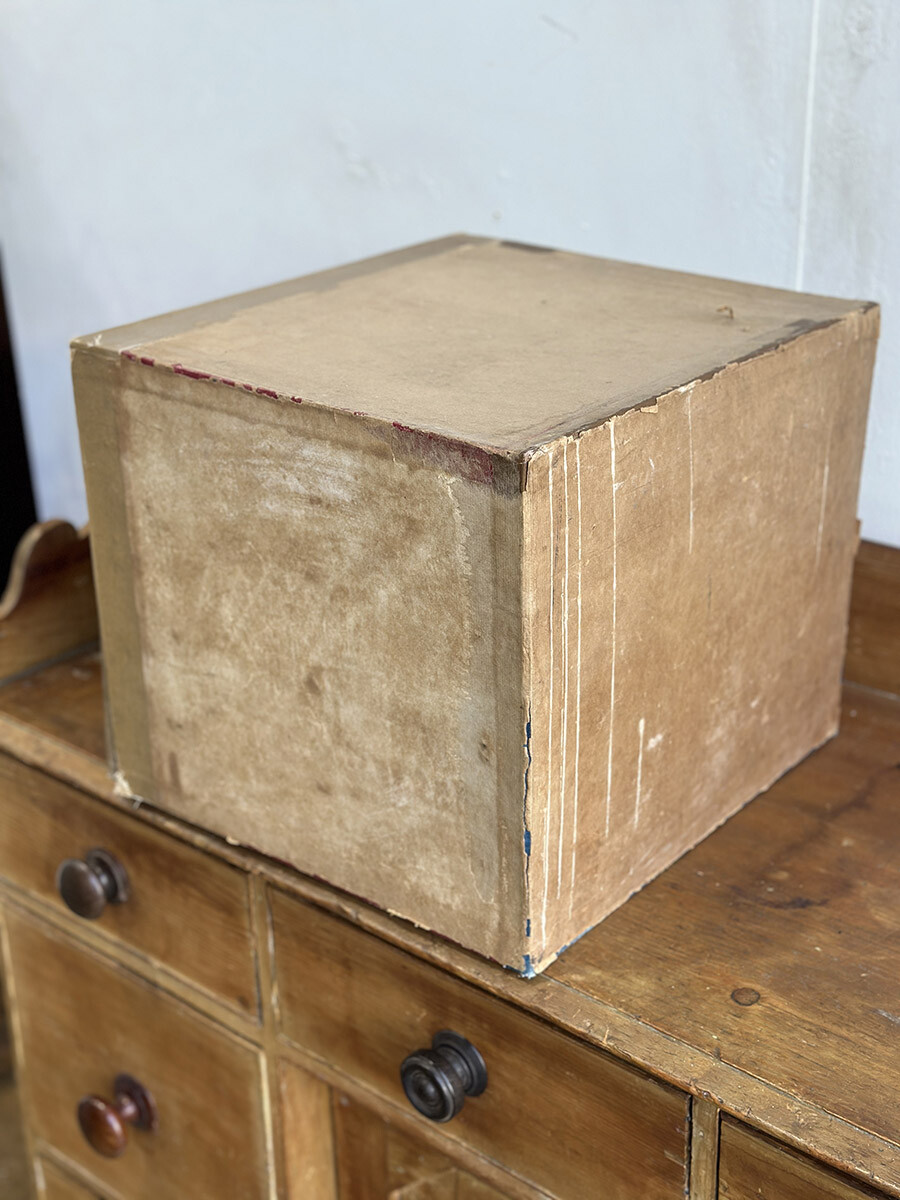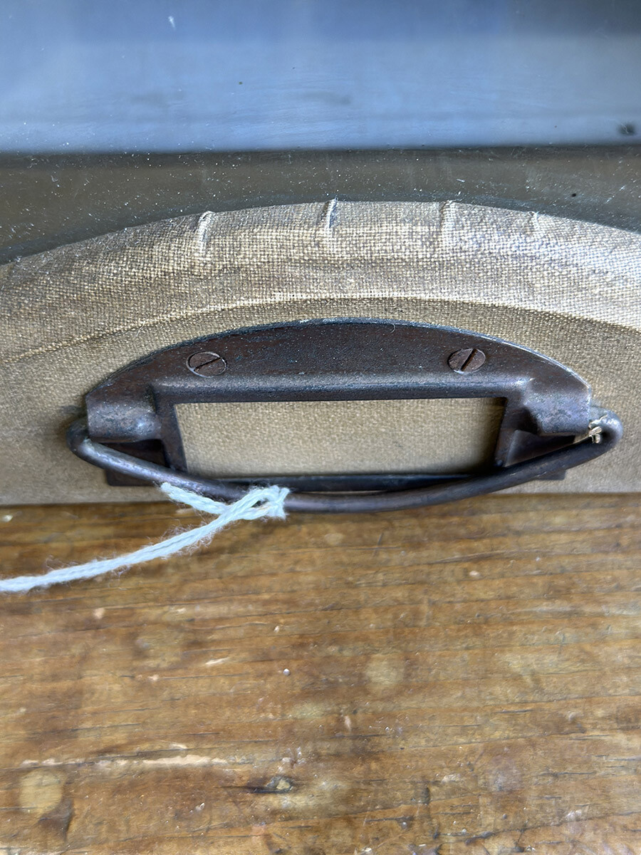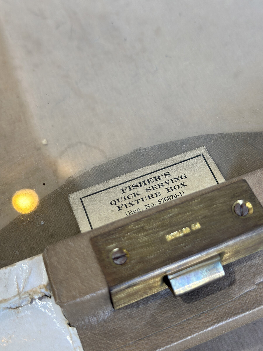 이 상품인 FISHER'S QUICK SERVING FIXTURE BOX는 두꺼운 종이로 제작되었고, 표면에 캔버스 천을 덧대어 내구성을 높인 것이 특징입니다. 또한 내부에 있는 물건을 쉽게 확인할 수 있도록 유리창이 있어 내부를 들여다볼 수 있습니다. 사진에서 제작사의 로고와 등록 번호를 확인할 수 있는데, 이 박스는 맞춤 제작되었기 때문에 고객마다 고유한 등록 번호가 부여되었습니다. 만약 분실 시, 습득한 사람이 회사에 연락하면 소유자를 확인할 수 있는 시스템이 있었습니다.