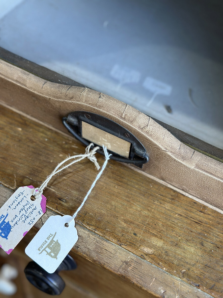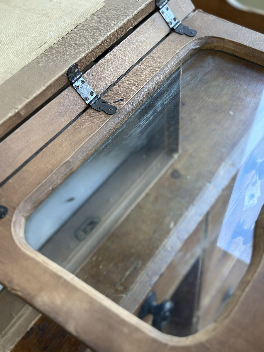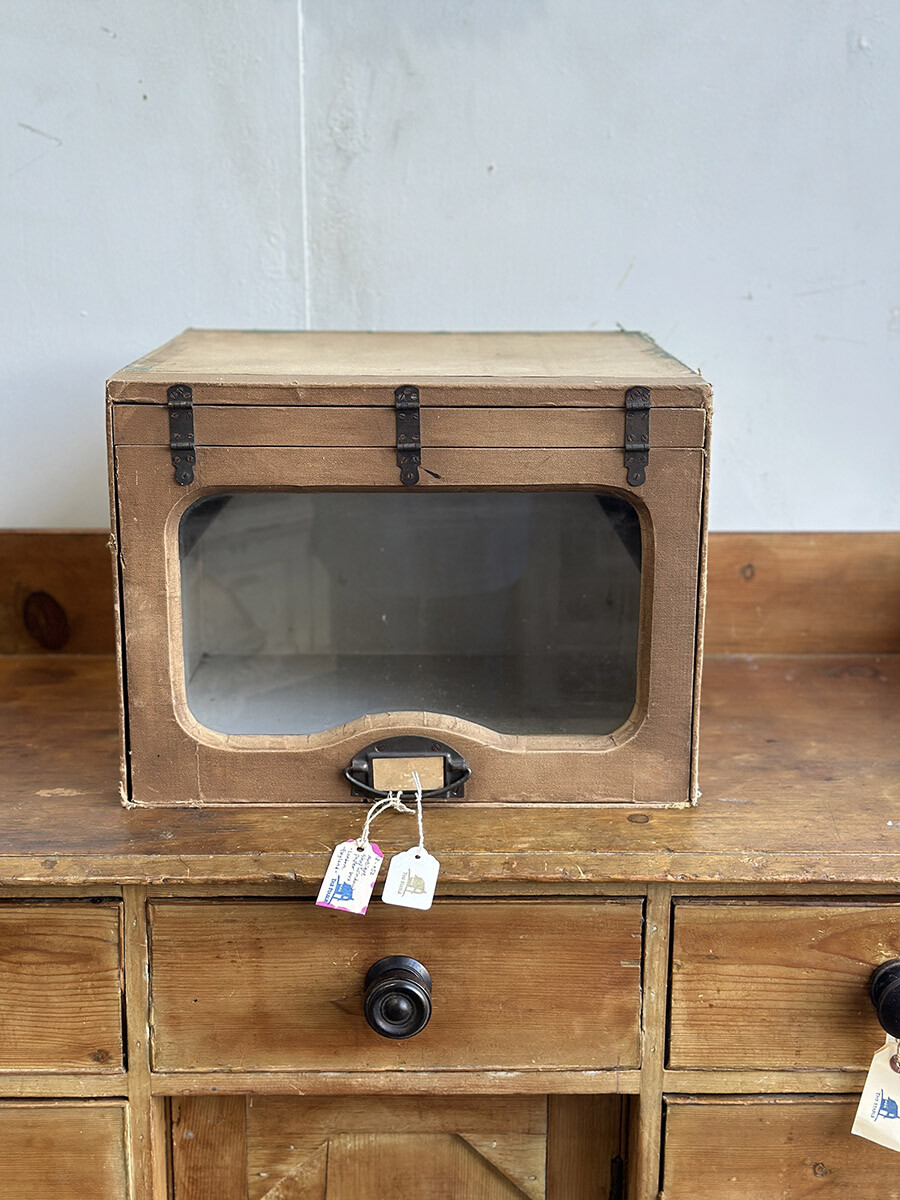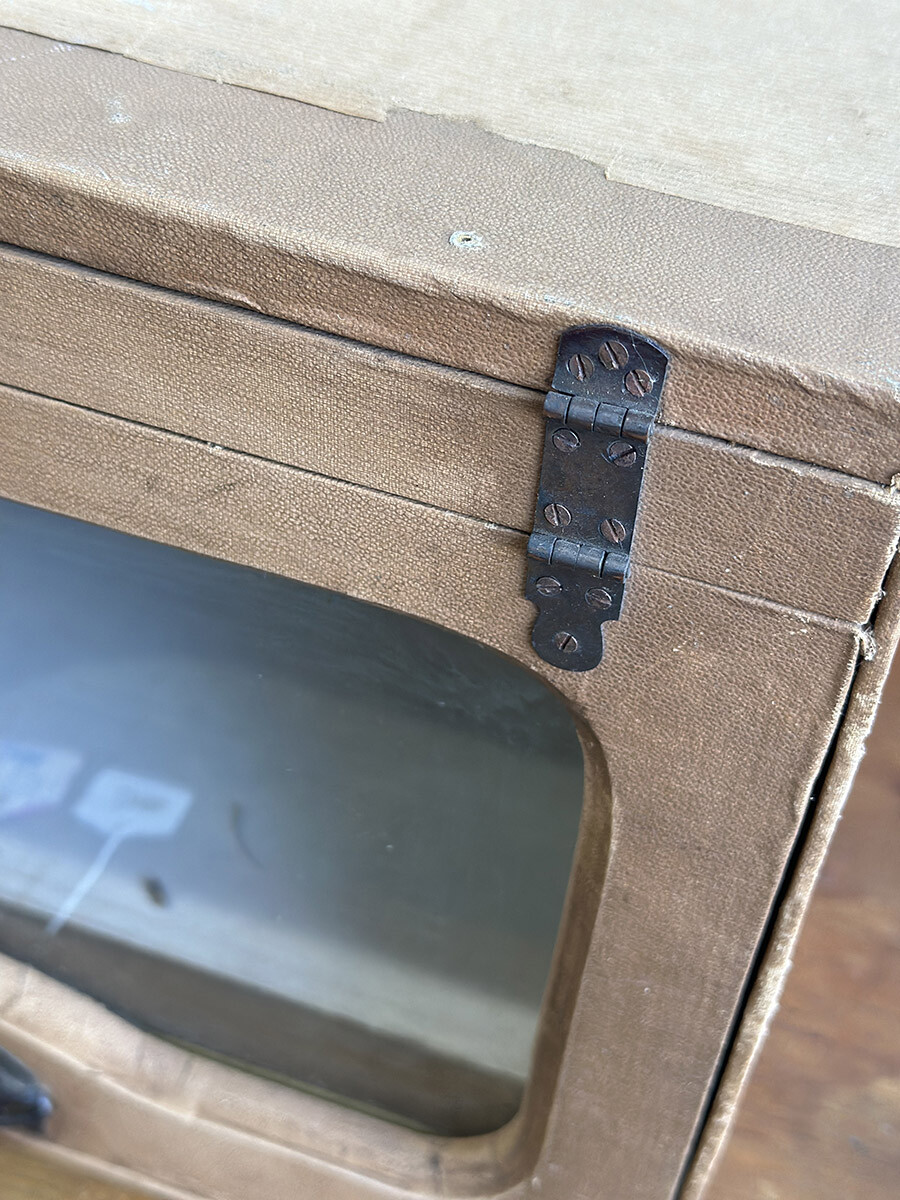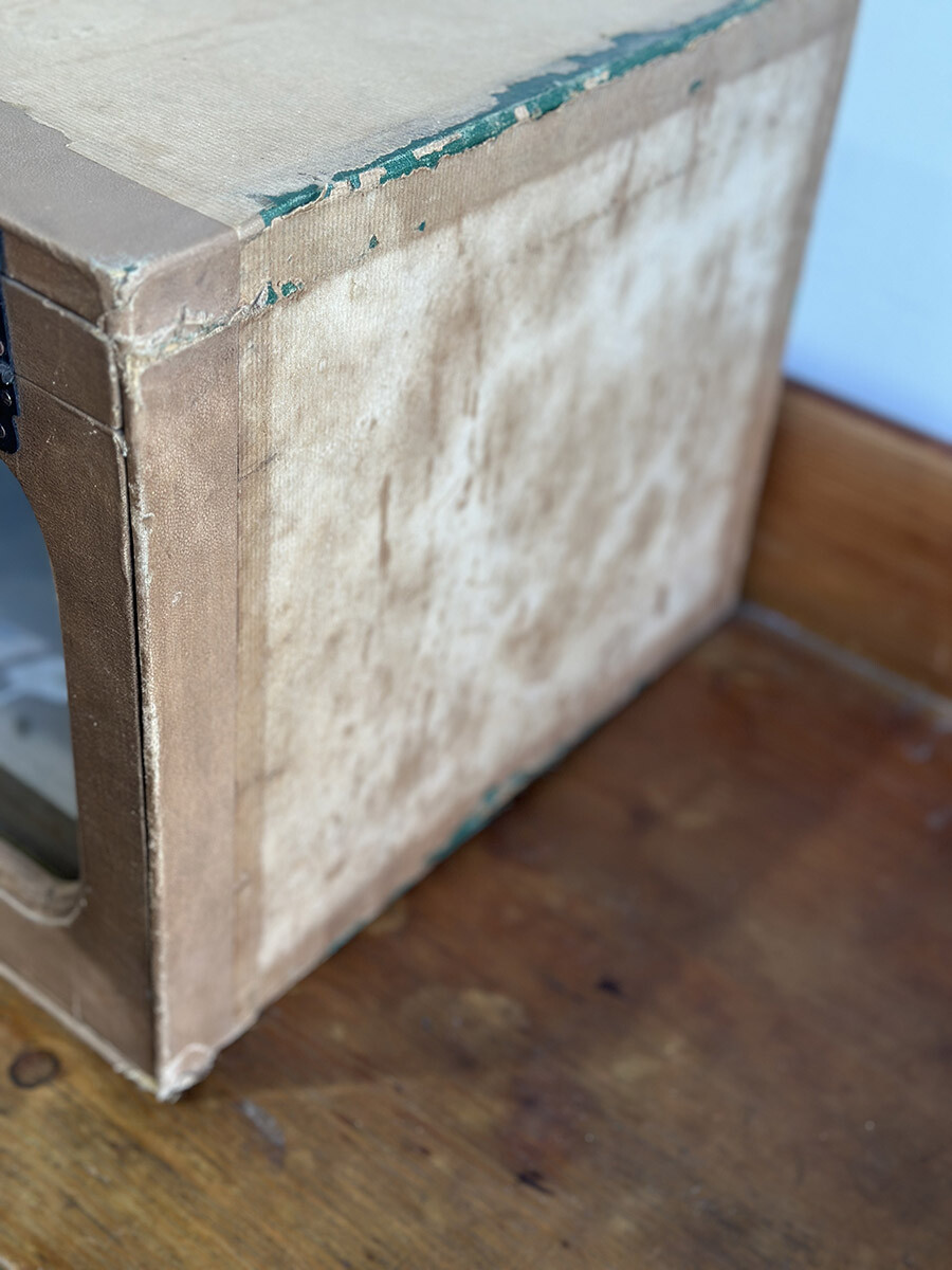 이 상품인 FISHER'S QUICK SERVING FIXTURE BOX는 두꺼운 종이로 제작되었고, 표면에 캔버스 천을 덧대어 내구성을 높인 것이 특징입니다. 또한 내부에 있는 물건을 쉽게 확인할 수 있도록 유리 소재의 창이 있어 내부를 들여다볼 수 있습니다. (제작사 로고 스티커는 현재 남아 있지 않으나, 함께 수집된 박스들과 동일한 형태와 맞춤 크기를 갖고 있어 FISHER'S 사에서 함께 제작된 것으로 추정 됩니다)
