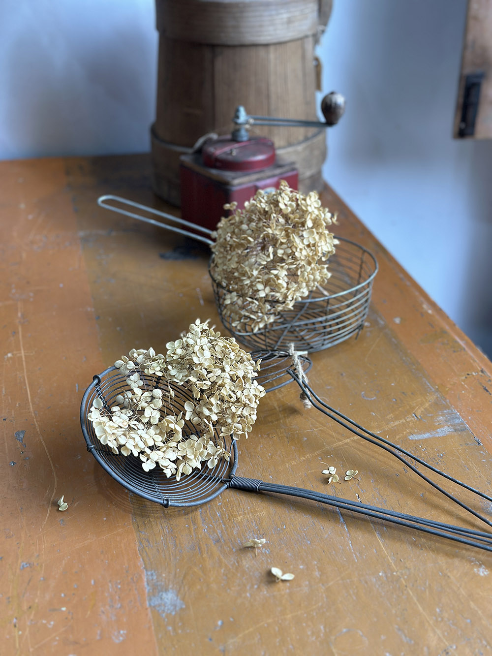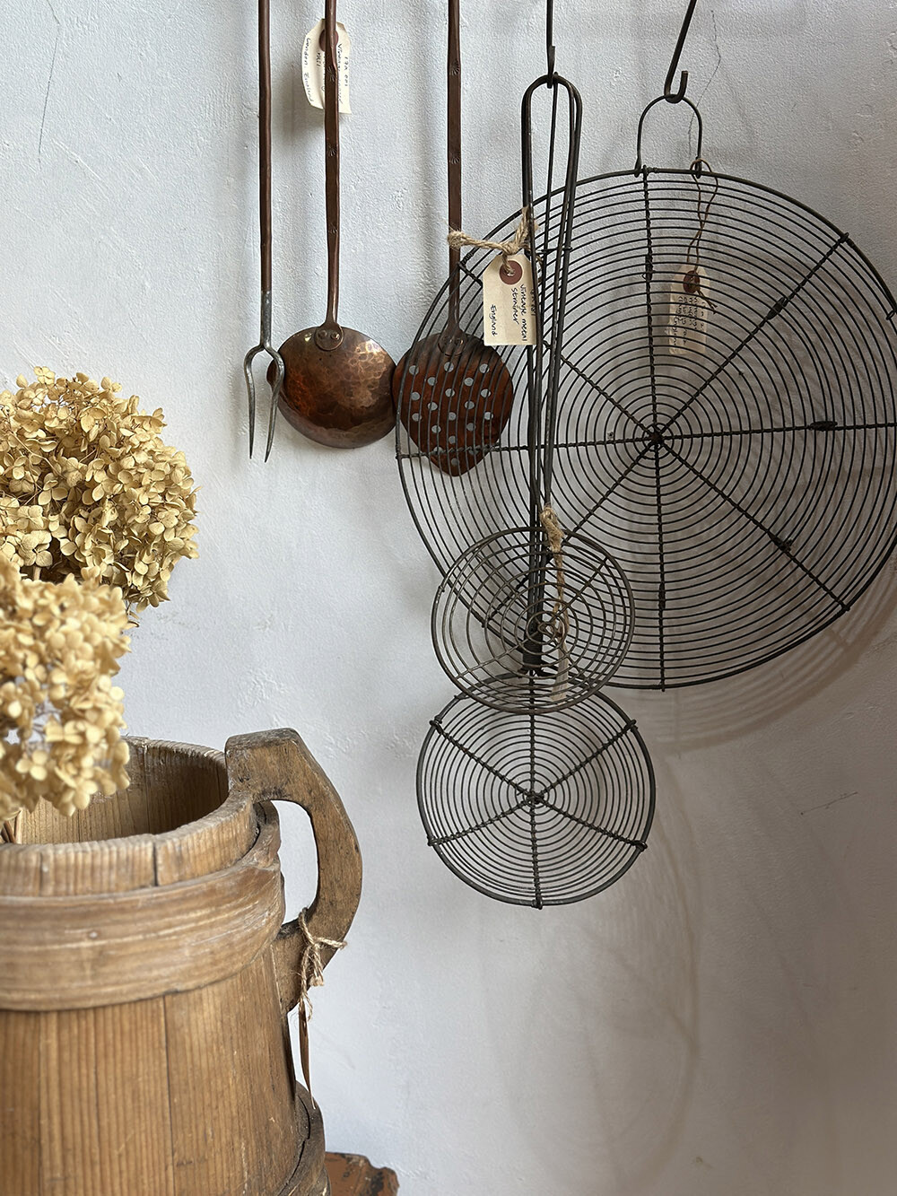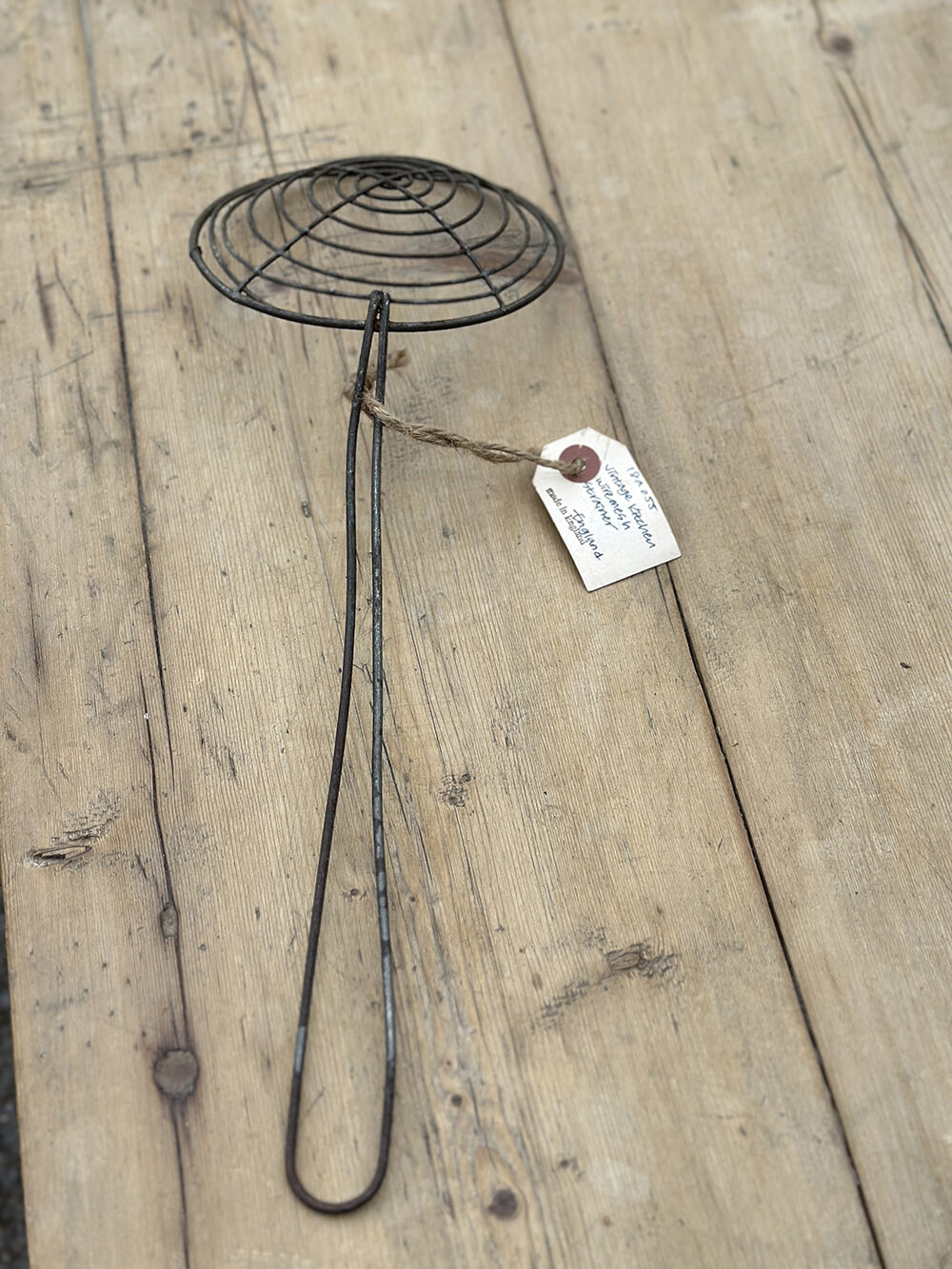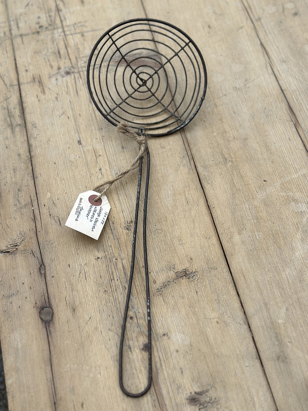 와이어 메쉬로 제작된 빈티지 키친 스트레이너입니다. 동냄비나 다른 키친 도구들처럼 빈티지 스타일의 키친 연출에 매우 유용한 아이템이죠. 사진에서 보는 느낌보다 실물은 꽤 큼직합니다.
