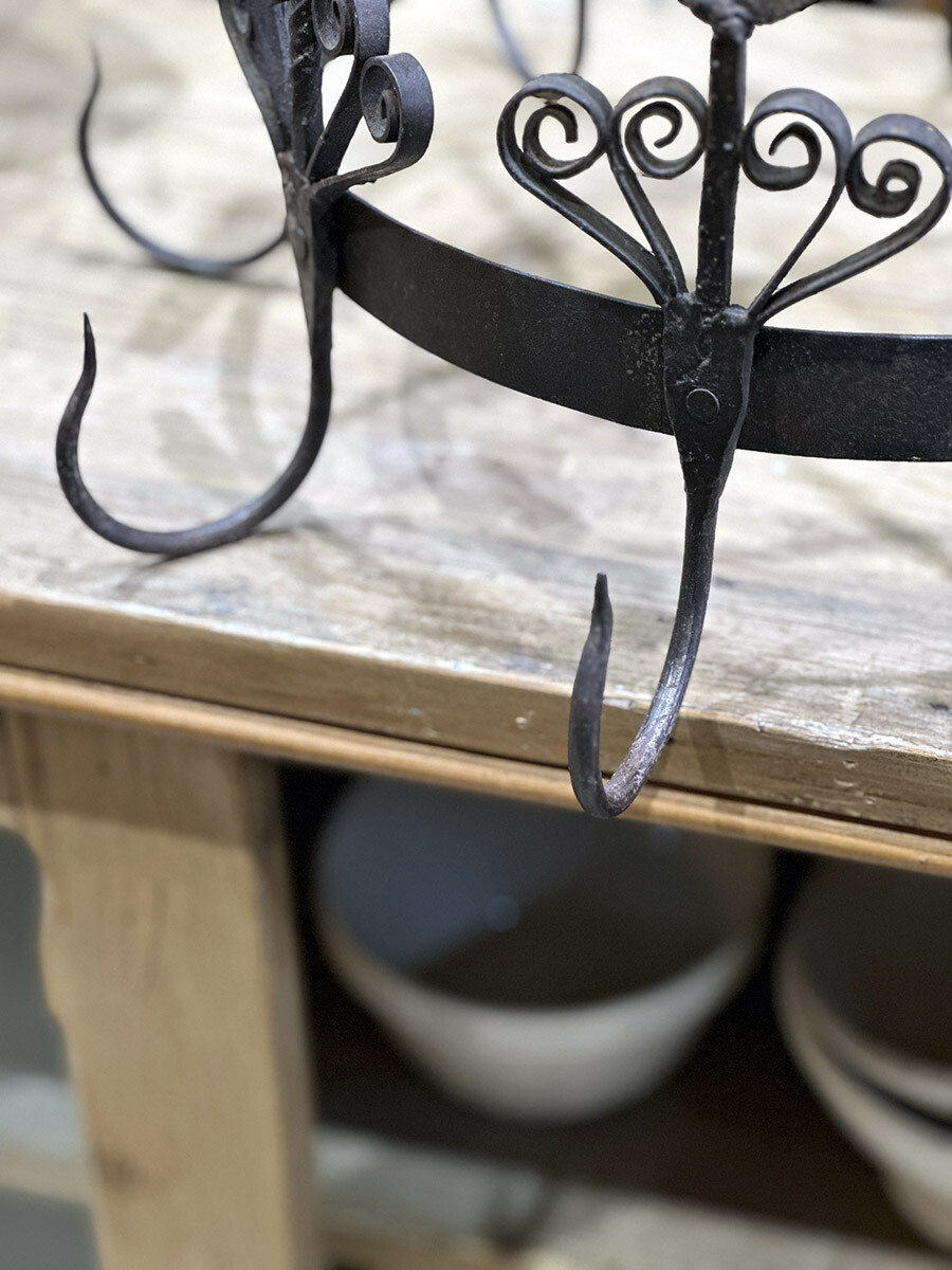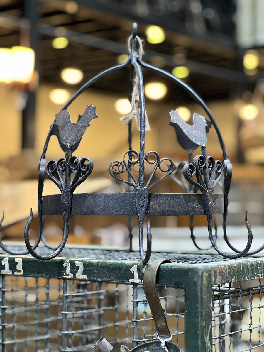 로트 아이언(wrought iron) 소재로 만들어진 빈티지 게임 랙입니다. 게임(game)이라는 단어에는 '사냥물'이라는 뜻도 있다는 사실, 알고 계셨나요? 사냥해서 잡아온 새나 작은 동물들을 개나 고양이, 쥐 등이 건드리지 못하게끔 걸어두던 랙을 '게임 랙'이라고 하는데, 1700년대 정물화에서도 게임 랙을 가끔 볼 수 있을 정도로 꽤 오래전부터 사용되어 왔던 물건 중에 하나였습니다. 지금은 동냄비나 식기류, 허브 등을 걸어서 키친 데코레이션을 하거나, 상점에서 다양한 물건들을 걸어서 디스플레이에 활용되는 일이 많습니다. 원형으로 만들어진 이 게임랙에는 8개의 고리가 달려 있으며, 닭 등이 장식되어져 있습니다.