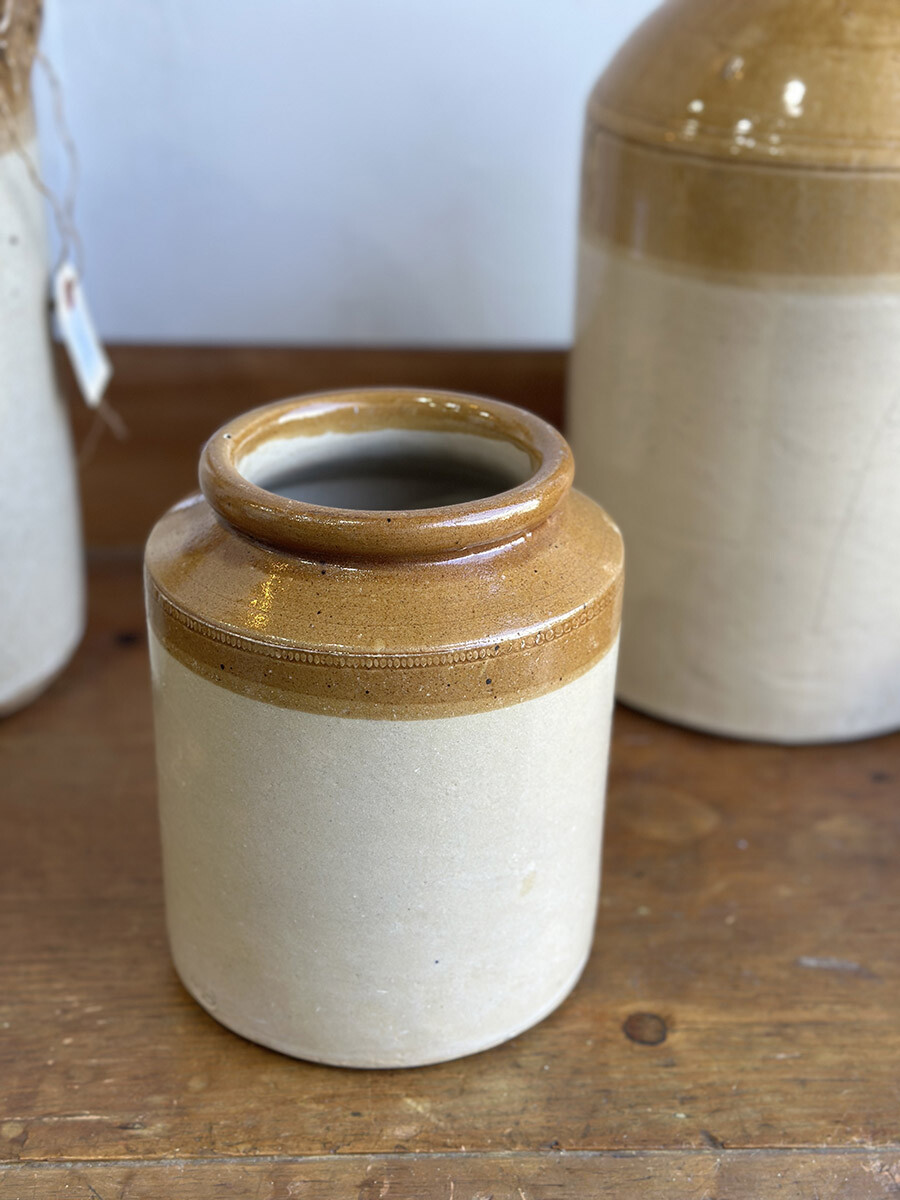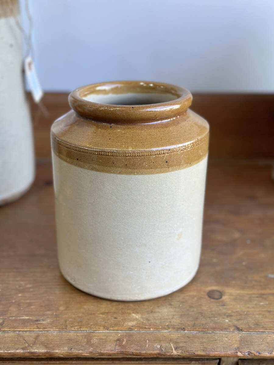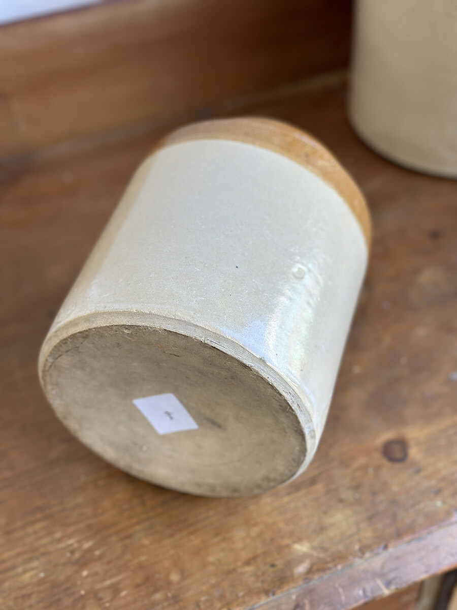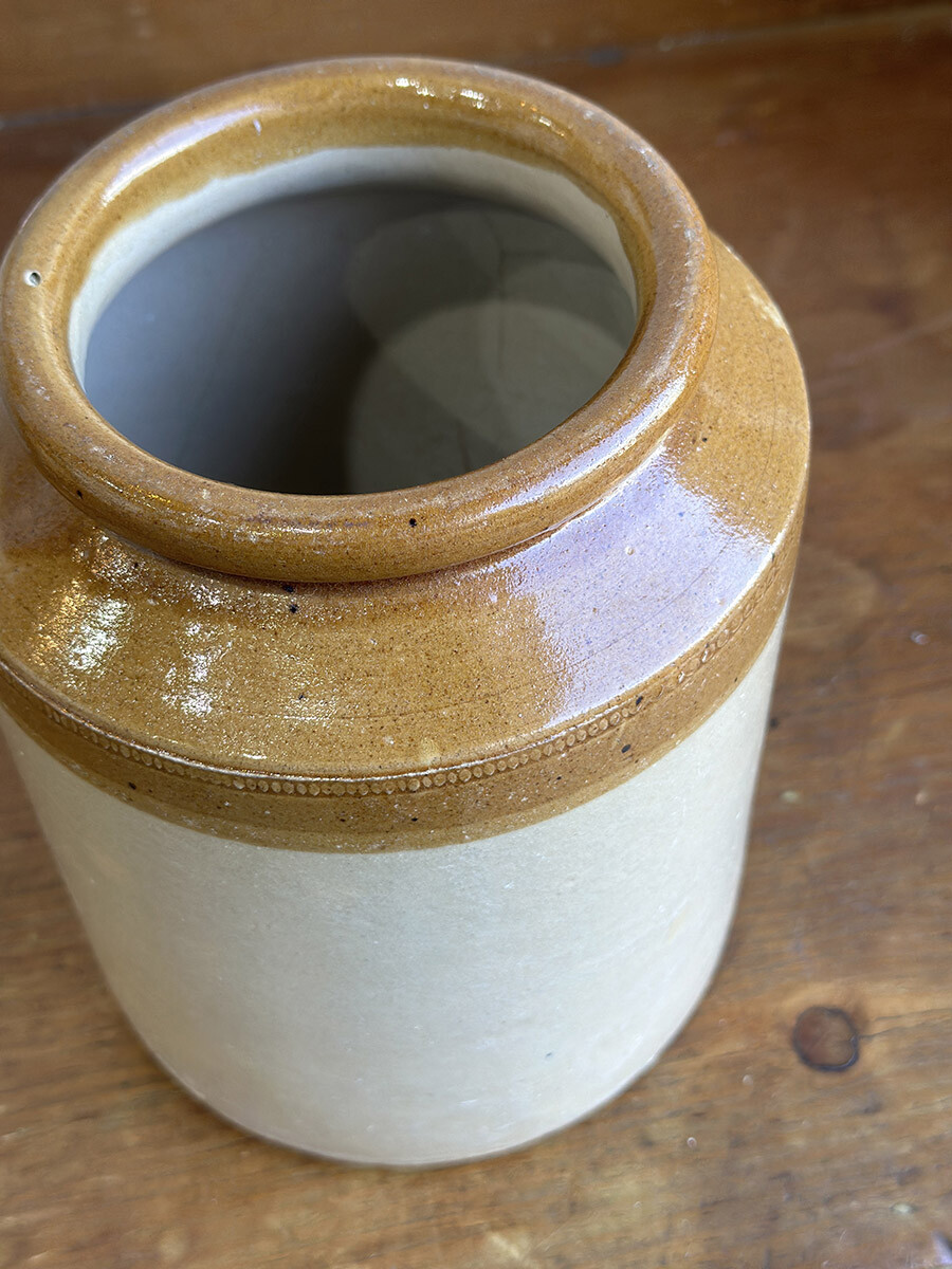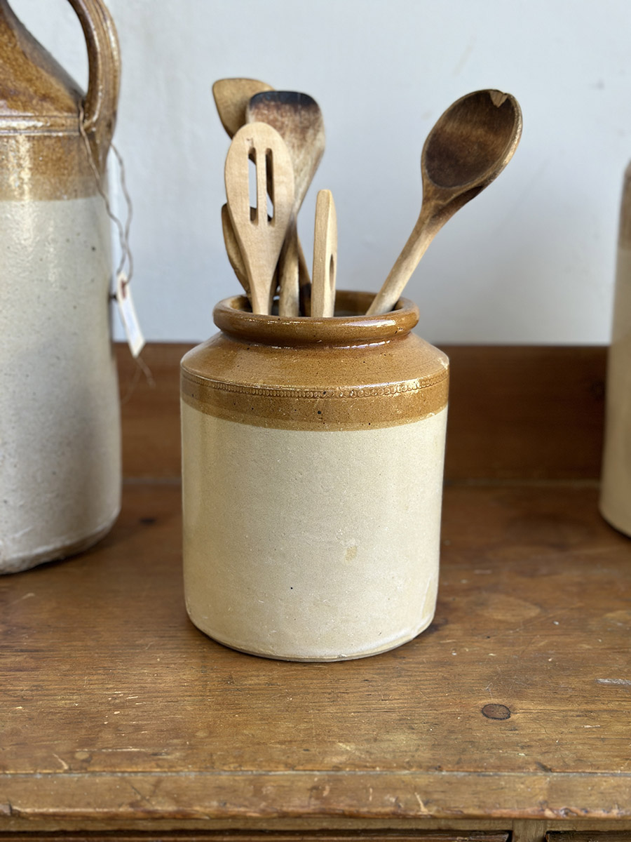 스톤웨어 재질의 앤틱 자(jar)입니다. 스톤웨어(stoneware)란 여러 가지 점토를 섞어 구워낸 불투명한 자기를 말하는데, 걔중에는 유약을 사용한 것 / 유약을 일부만 사용한 것 / 유약을 아예 사용하지 않은 것들이 있습니다. 본 상품과 같이 생산된지 약 100년 정도가 되었거나, 그 이전의 연대에 생산된 앤틱 스톤웨어 중에는 오일이나 약물, 에일(맥주), 잼, 마멀레이드 등을 생산했던 업자들이 제품의 보관과 유통을 위해 스톤웨어 용기들을 사용했습니다. 현재에도 고급 식품의 이미지를 위해 스톤웨어 용기를 사용하는 경우를 종종 볼 수 있습니다.