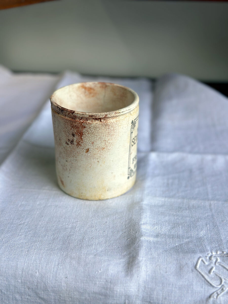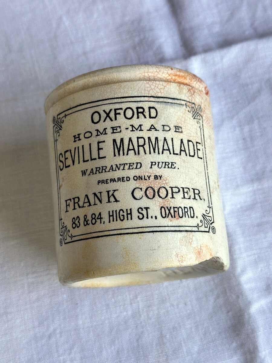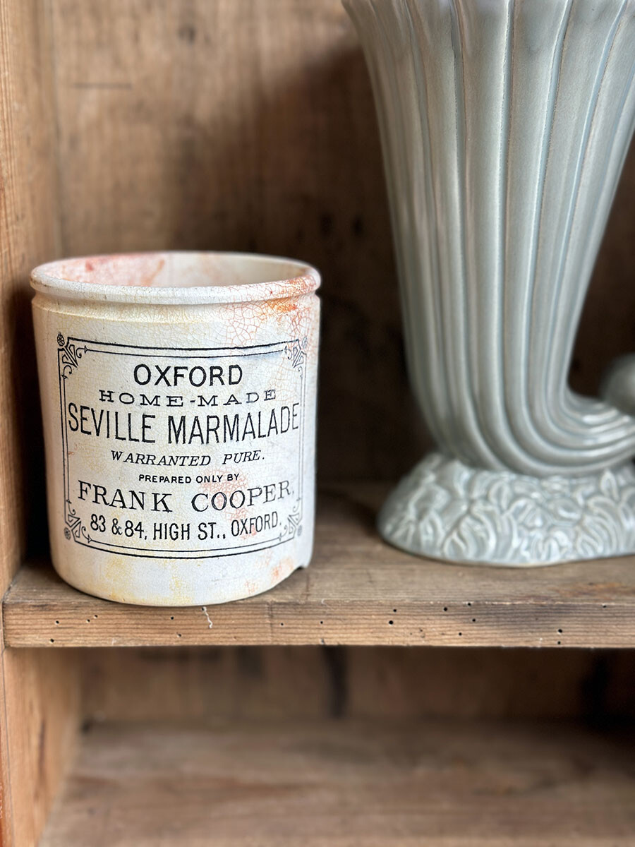 이번에 수집된 프랭크 쿠퍼의 세빌 마멀레이드 자는 1900년대 극초반에 제작되어 유통된 상업용 자기로, 상품의 유통과 보존에 용이하게끔 아이언스톤(ironstone) 소재의 용기를 사용했습니다. 오랜 시간이 흐르면서 발생한 크레이징과 부분부분 변색된 부분이 파티나(patina)로 남아서 긴 세월의 흔적을 차분하게 표현해주고 있습니다.