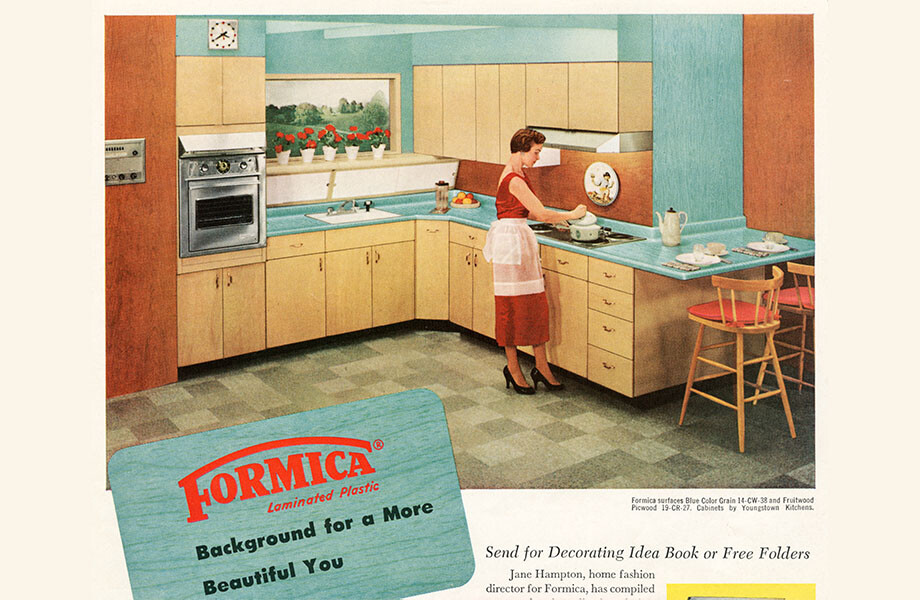 여러 겹의 수지층을 압축시켜서 단단한 재질로 만들어 낸 라미네이트 소재를 말합니다. 사실 포마이카라는 명칭은 이 라미네이트 소재를 개발했던 회사인 Formica Corp.의 이름이 상품명으로 불리워진 것인데요, 이 소재의 쓰임새는 본래 전기 절연체 영역에서 사용하기 위해서 개발되었지만, 2차 세계대전 중 목재로 만들어진 항공기 프로펠러에 함께 결합하여 사용하는 등 군수용품으로 대거 그 쓰임새에 변화가 생깁니다. 전쟁이 끝난 후에는 1950년대부터 포마이카가 가구영역으로 진출하였고, 오염이 잘 되지 않고 잘 닦이는 표면소재로 대중적인 인기를 얻게 되었지요. 특히 키친 싱크나 테이블의 상판으로 주로 사용되었습니다. 이런 일련의 흐름은 미드-센츄리 모던 시대의 가구들이 원목 부족현상으로 인해 새로운 대체 소재를 찾으면서 철제 파이프나 유리 섬유 등이 사용되었던 흐름과 같은 선상에 있는 것이죠. 1960년대 영국에서는 포마이카 제네레이션(Formica Generation)이라는 말이 생겨 났을 정도로 한 세대를 풍미했던 소재이기도 합니다. 포마이카 소재가 일본을 통해 한국으로 전해지면서, 일본식 발음인 호마이카(フォーマイカ)로 불리우기도 했습니다.