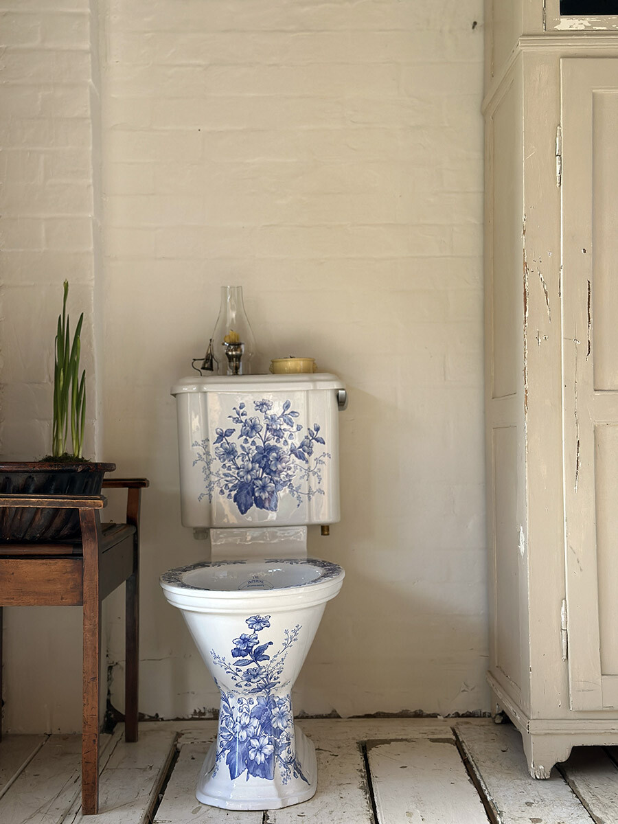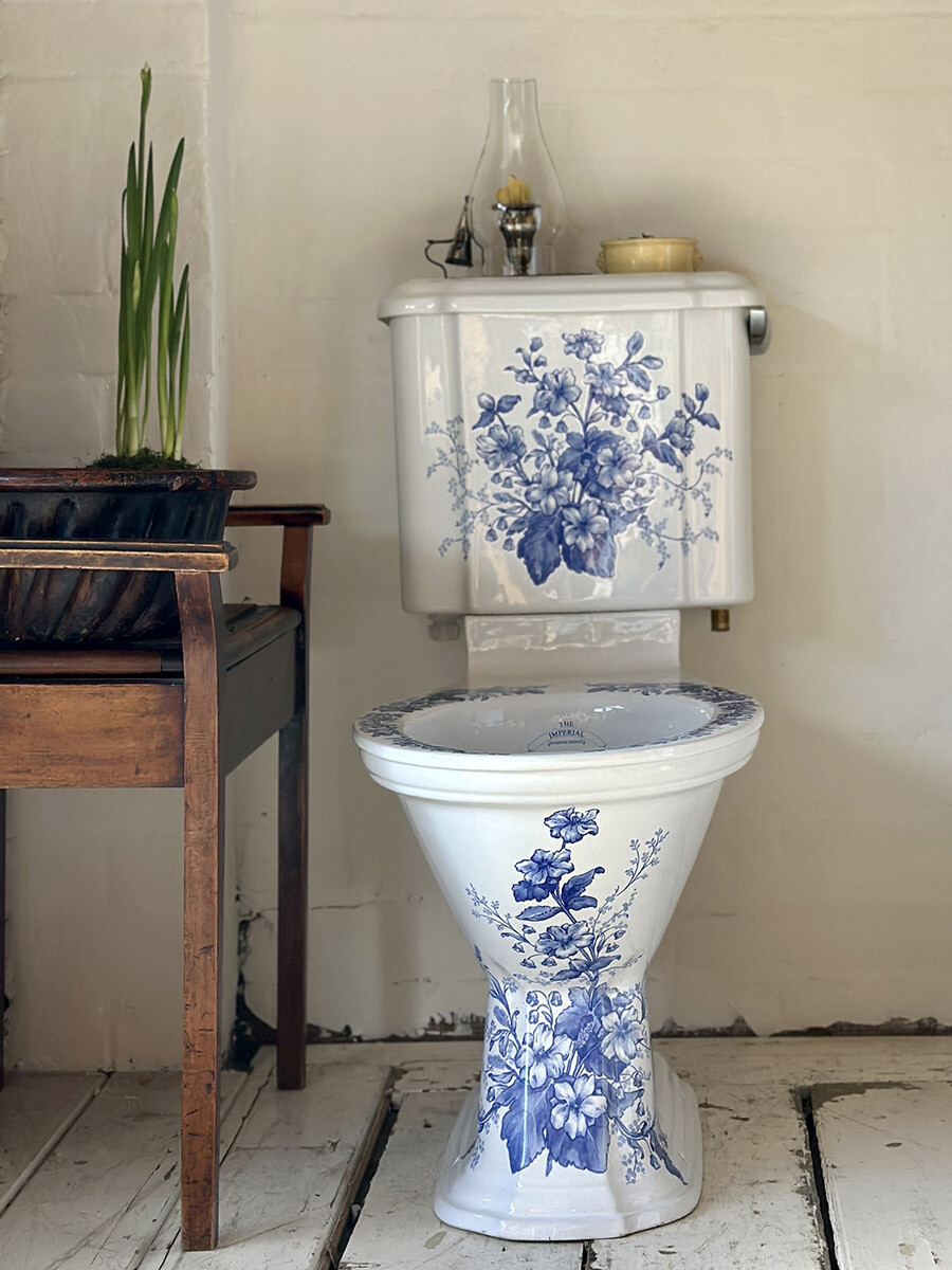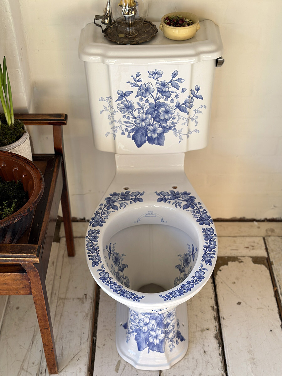 영국의 바스룸 도기 및 가구 업체인 IMPERIAL(임페리얼) 사에서 제작한 좌변기로, 상태가 민트급으로 매우 좋아 수집된 상품입니다. 임페리얼은 지금까지도 장인이 수작업으로 하나 하나 도기를 생산하는 업체이며, 1800년대의 빅토리안 스타일의 고급 욕실용 도기와 가구 및 타일 등을 생산하고 있습니다. 본 상품은 임페리얼 사에서 생산했던 시스턴(물탱크)이 포함되어 있는 모델로, 빅토리안 디자인 중에서도 특히 신고전주의적인 요소들이 많이 반영되어있고, 델프트 블루 스타일의 플로럴 그림이 추가 되어 있습니다. 시트나 커버 부분은 본래 목재로 된 것이 사용되었을 것으로 여겨지나, 수집 당시에 포함되어 있지 않았습니다. 실사용을 위한 설치는 지역 업체를 통하시거나, DIY로 진행하셔야 합니다.