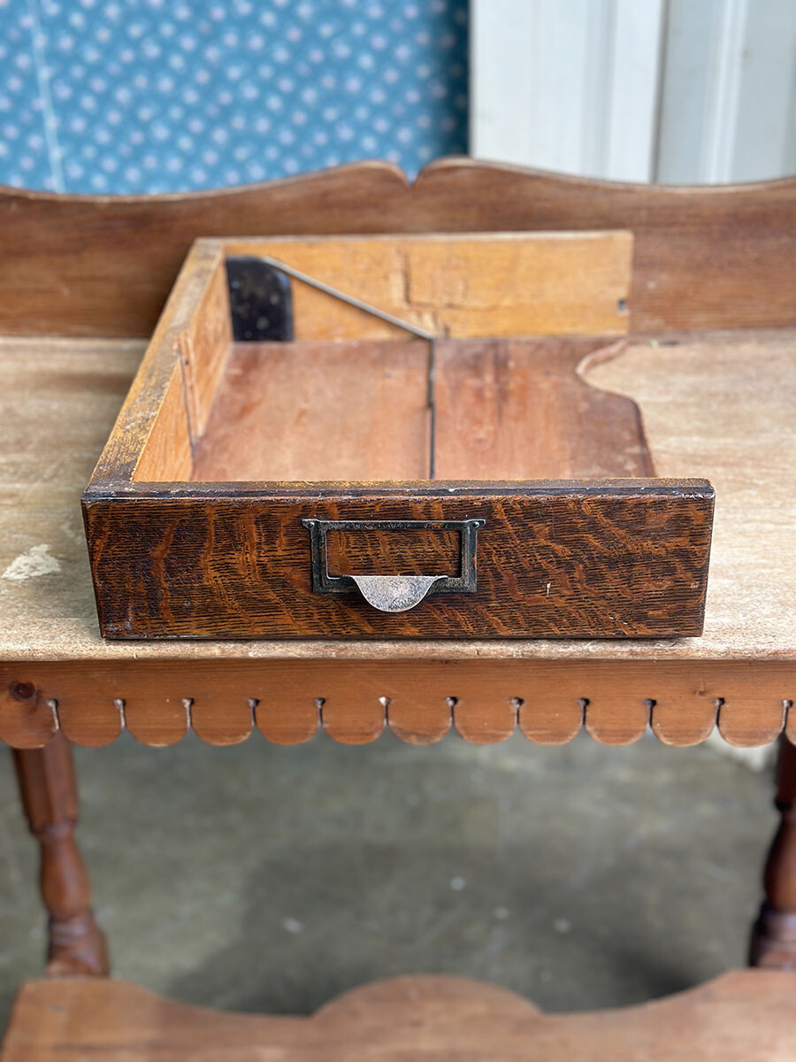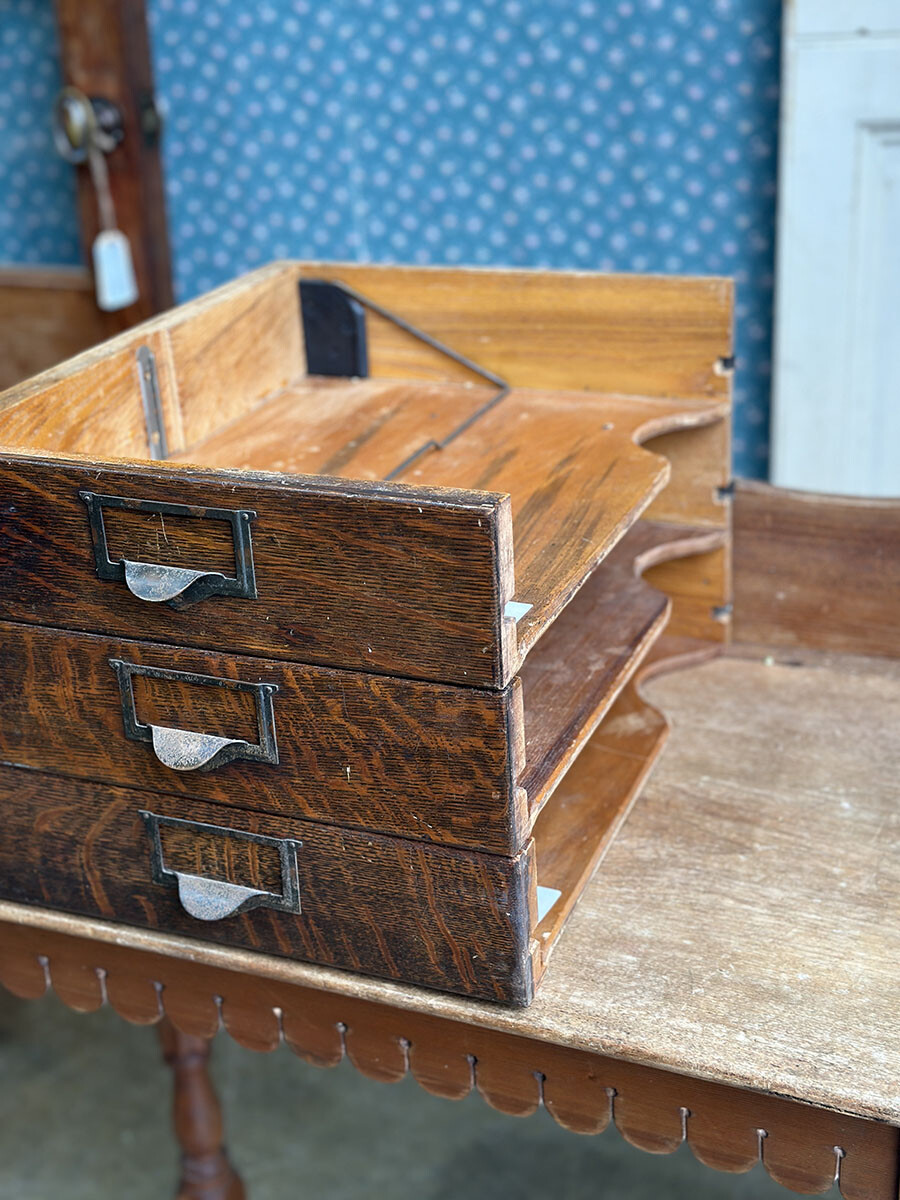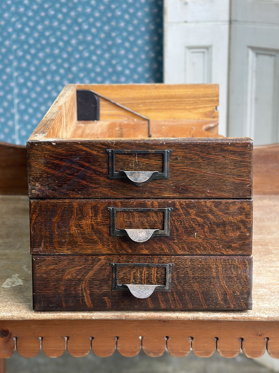 최근 감각있는 상점들이 다양한 상품의 진열을 위해 오리지널 앤틱 혹은 빈티지 서랍들을 사용하는 사례를 자주 볼 수 있습니다. 본 상품은 글로브 워니크(Globe Wernicke) 사에서 제작한 파일링 캐비넷에 사용된 서랍들을 수집한 것으로, 3개가 한 셋트로 구성되어 있습니다. 서랍에는 각각 메탈 소재의 네임 홀더 및 손잡이가 달려 있고, 서류들이 흩어지지 않도록 잡아주는 바인더가 있습니다. 바인더는 프레임 바깥과 바닥에 붙어 있으므로 상품 진열에 방해되지 않습니다.