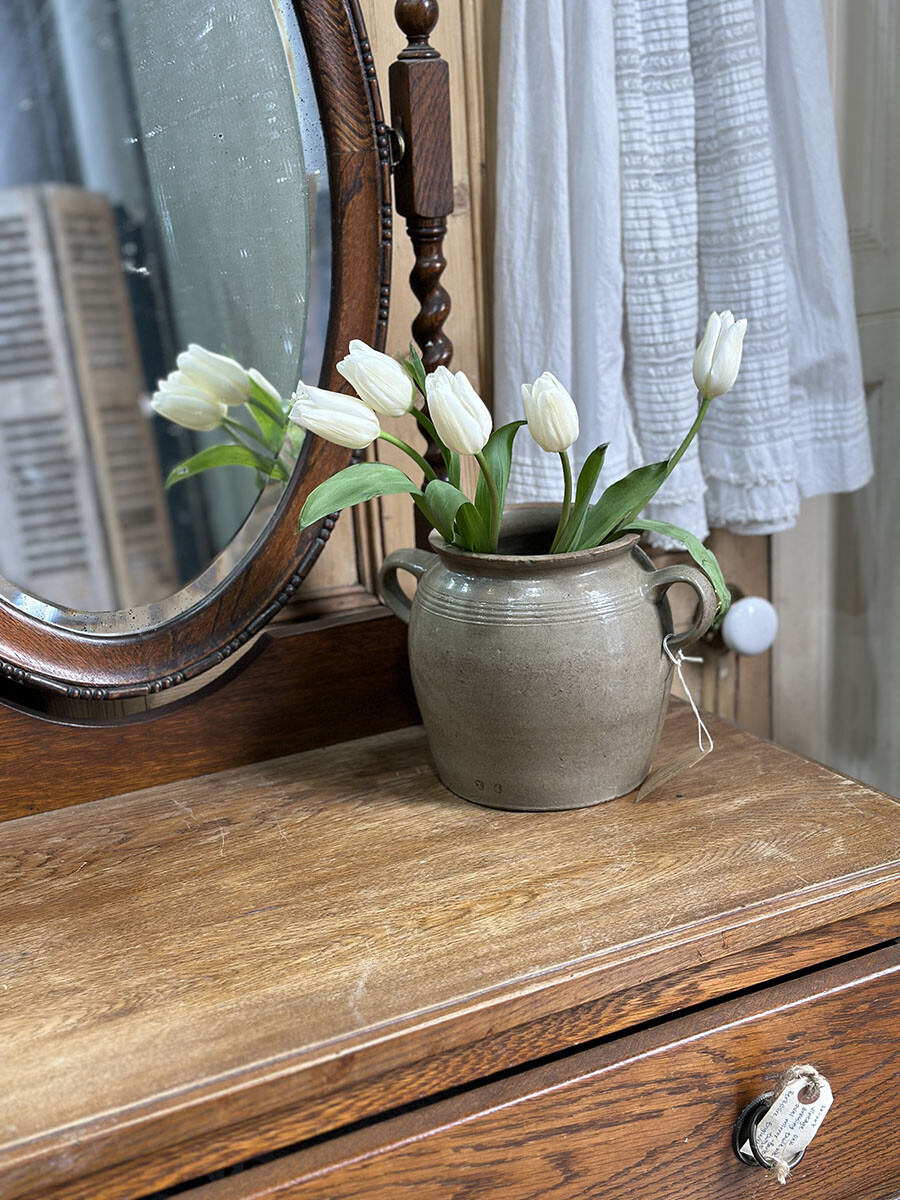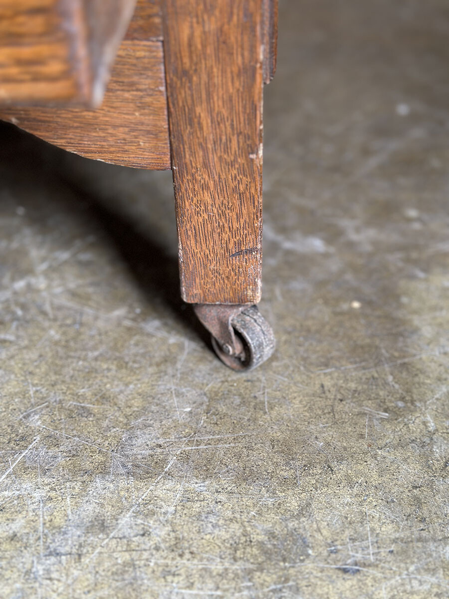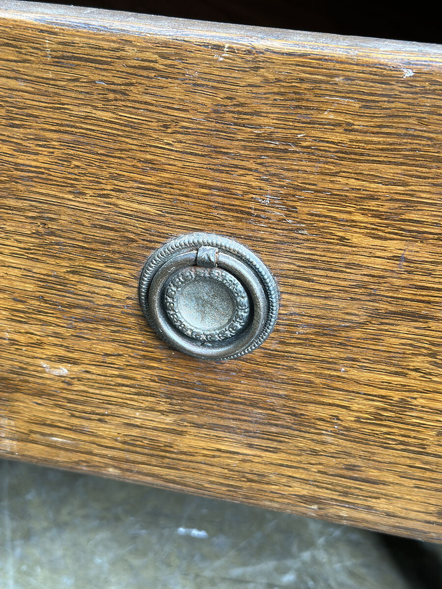 오크 소재로 만들어진 드레싱 테이블(dressing table ; 화장대)입니다. 하부 베이스가 3단 서랍장으로 만들어져 수납장으로써의 실용성도 뛰어난 편입니다. 거울은 양 옆에 발리 트위스트(barley twist) 형태의 기둥에, 타원 형태의 각도 조정이 가능한 스위블 미러가 장착되어 있습니다. 발리 트위스트는 영국에서 많이 볼 수 있는 보리(barley)의 이삭이 달린 모습을 모티프로 한 전형적인 영국적 디자인 요소입니다. 발리 트위스트 타입의 깊이가 있는 이중 거울을 사용하고, 손잡이에는 리젠시 스타일의 하드웨어를 사용하였습니다. 다리에는 주물로 된 카스트 아이언 바퀴가 달려 있습니다.