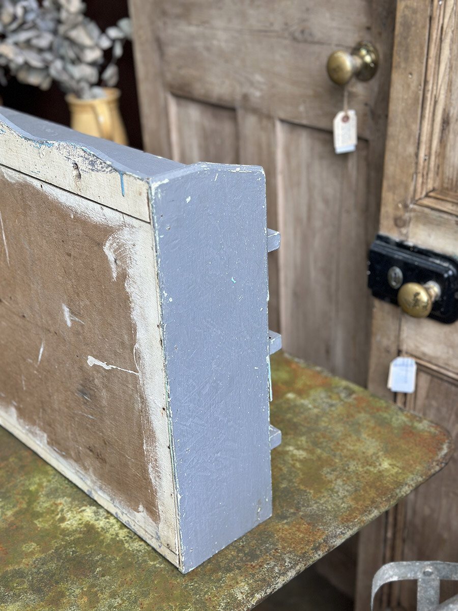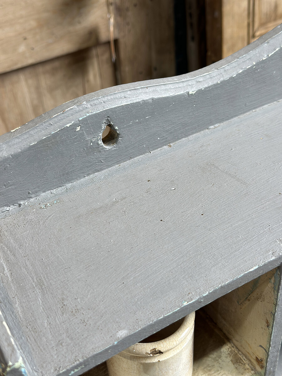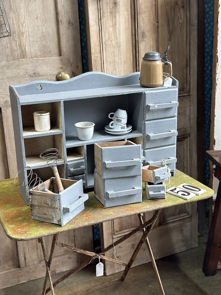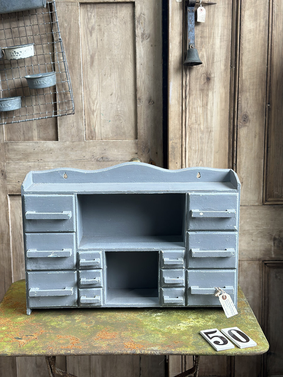 아담한 크기의 올드 빈티지 쉐비 시크 프렌치 월 행잉 드로워입니다. 그레이 컬러의 쉐비 시크 페인팅이 되어 있고, 작은 서랍장과 선반으로 짜여져 있어서 오밀조밀한 디스플레이 연출에 좋습니다. 본래는 벽걸이 형태로 만들어졌습니다만, 아래 사진과 같이 스탠딩 타입으로 사용하셔도 무방합니다.