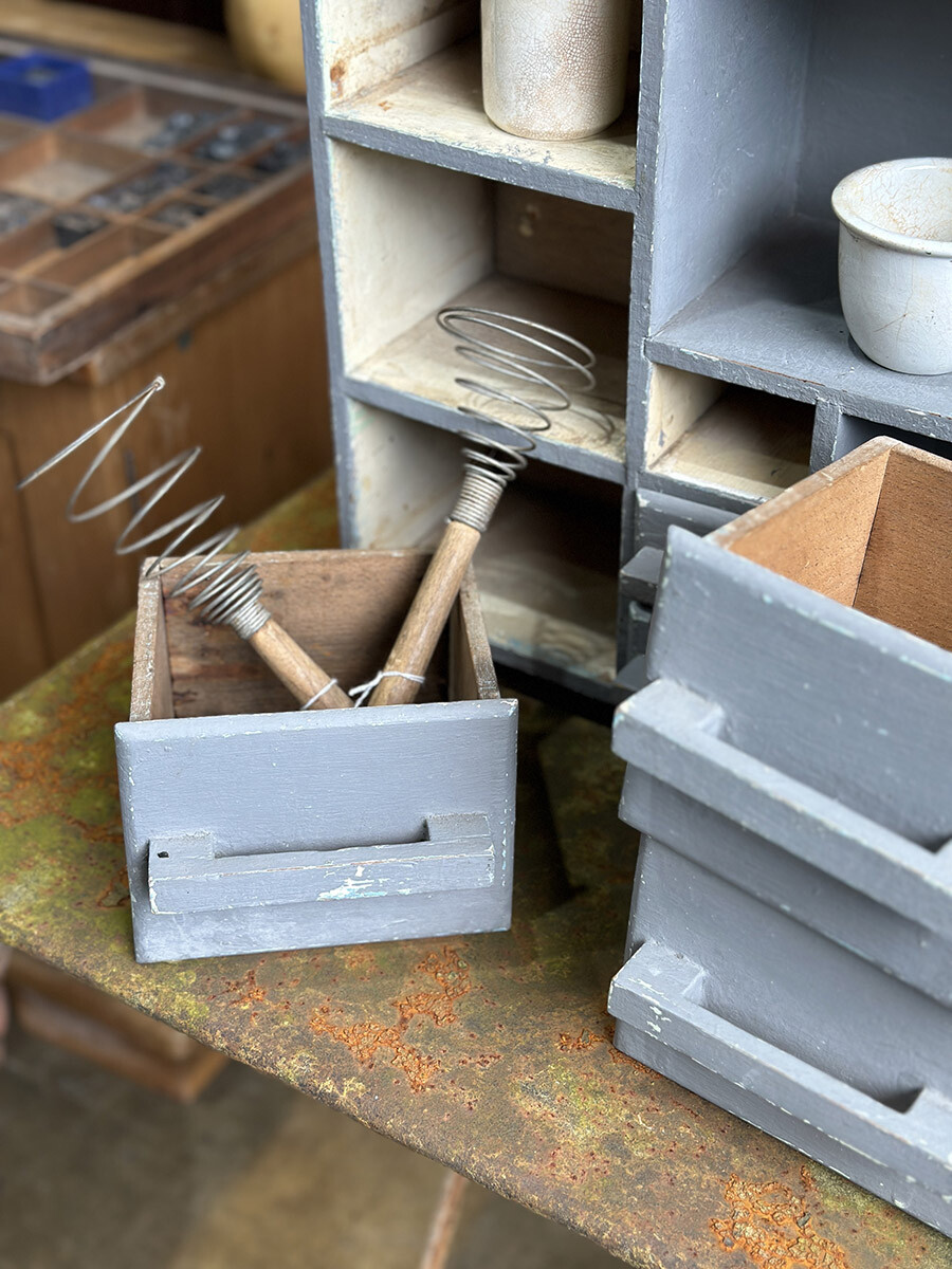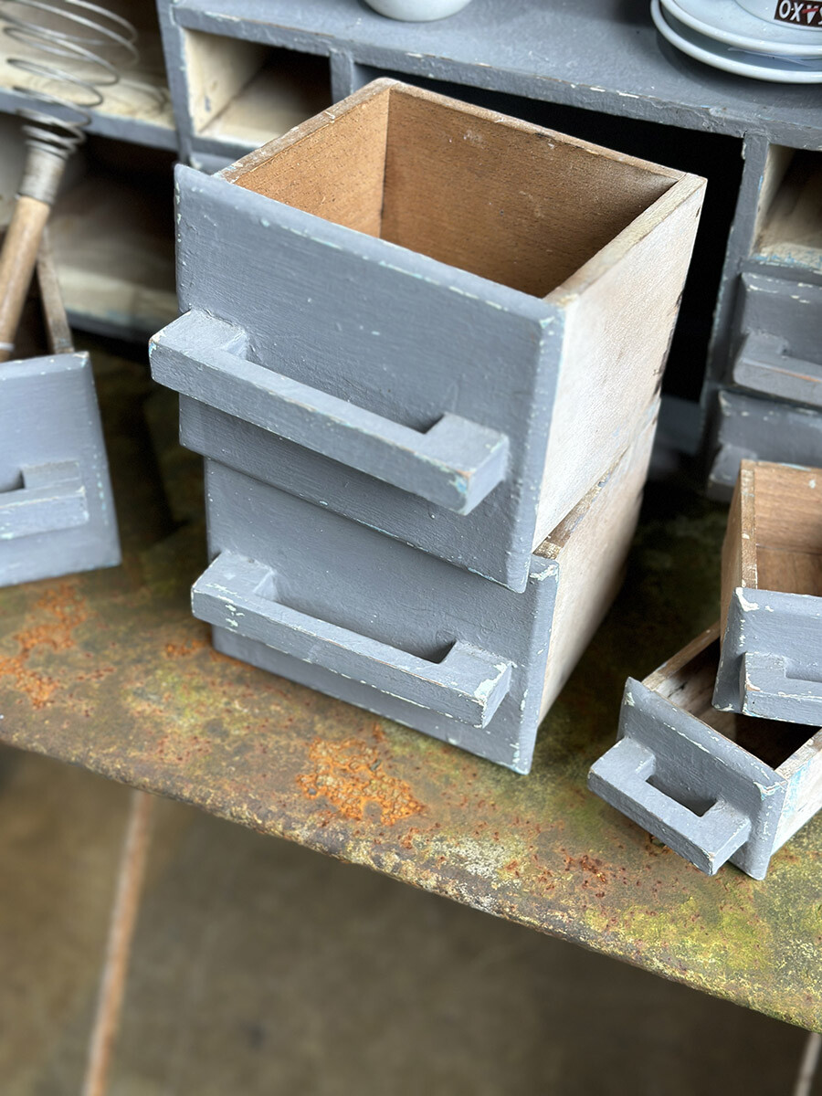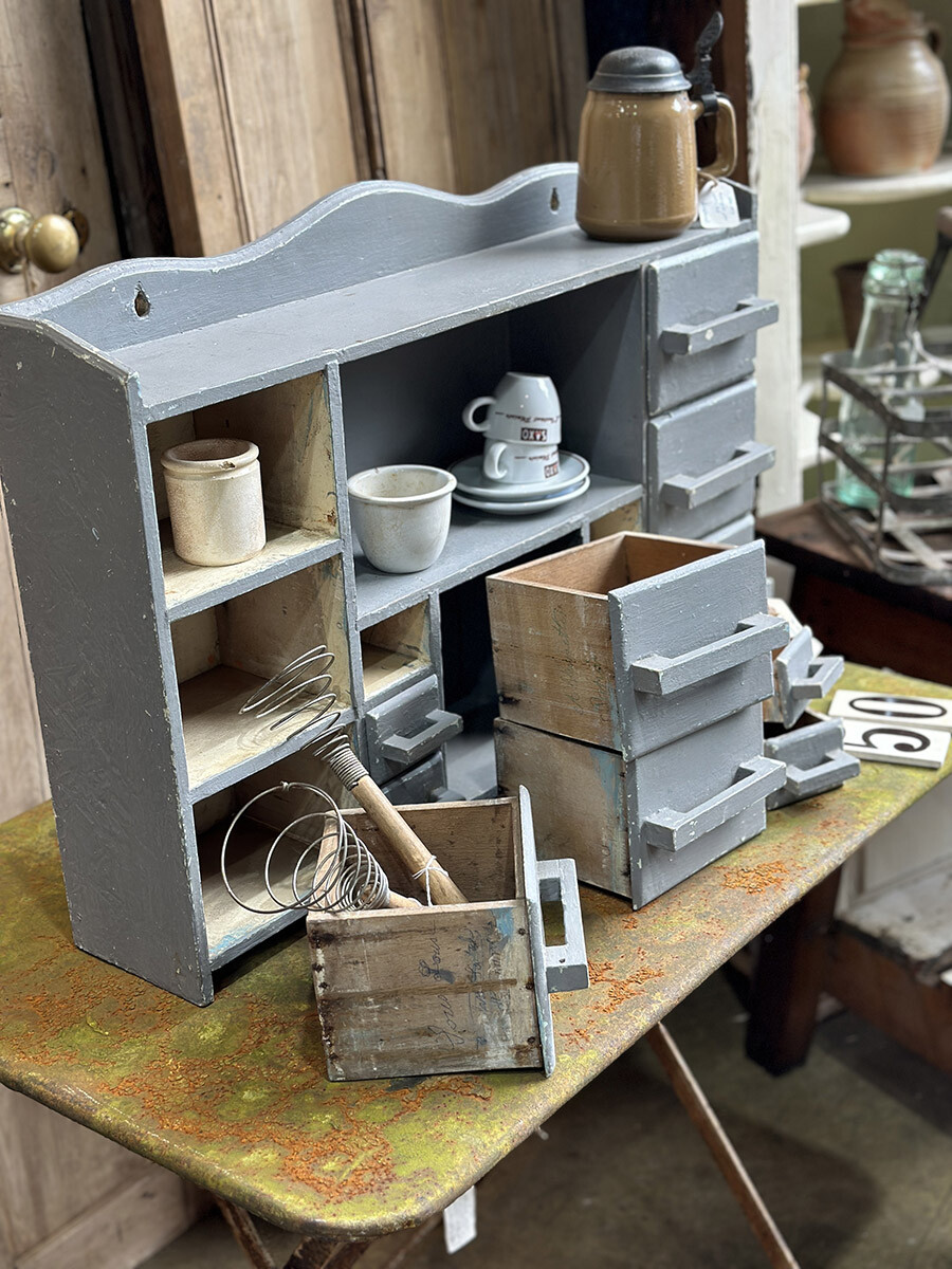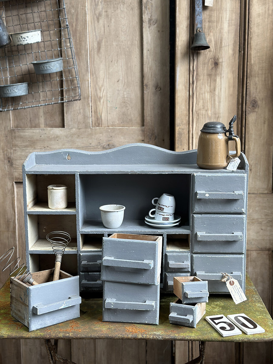 아담한 크기의 올드 빈티지 쉐비 시크 프렌치 월 행잉 드로워입니다. 그레이 컬러의 쉐비 시크 페인팅이 되어 있고, 작은 서랍장과 선반으로 짜여져 있어서 오밀조밀한 디스플레이 연출에 좋습니다. 본래는 벽걸이 형태로 만들어졌습니다만, 아래 사진과 같이 스탠딩 타입으로 사용하셔도 무방합니다.
