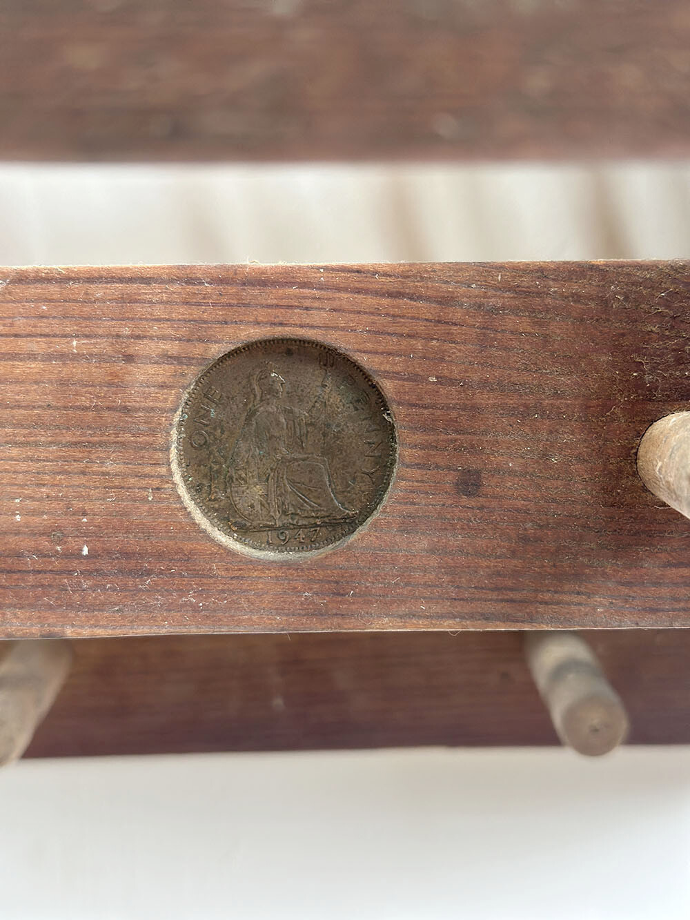 키친 타월이나 키친 툴, 컵 등을 걸어두라고 만들어진 훅이 8개, 좌측 사이드에 작은 철물로 된 훅이 또 하나 있습니다. 주방에서 나만의 소품들을 디스플레이 하고 싶을 때, 훌륭한 플랫폼 역할을 해줄 거예요. 훅이 있는 영역에 동전이 하나 박혀 있는데, 이 동전은 행운의 동전이예요. 전통적으로 행운의 동전을 서랍 속에 넣어 두거나, 혹은 이렇게 가구에 박아 두는 모습들이 가끔 보입니다.
