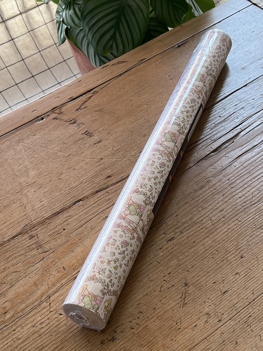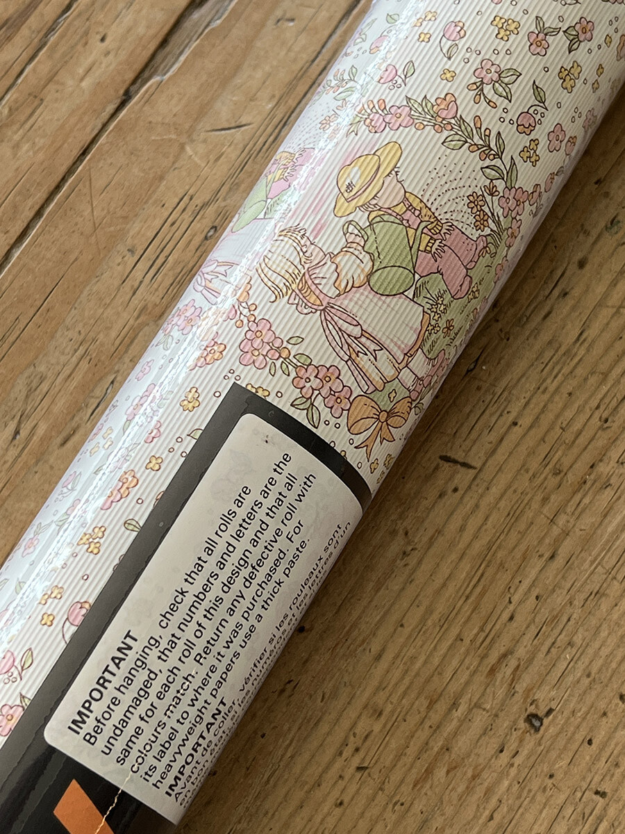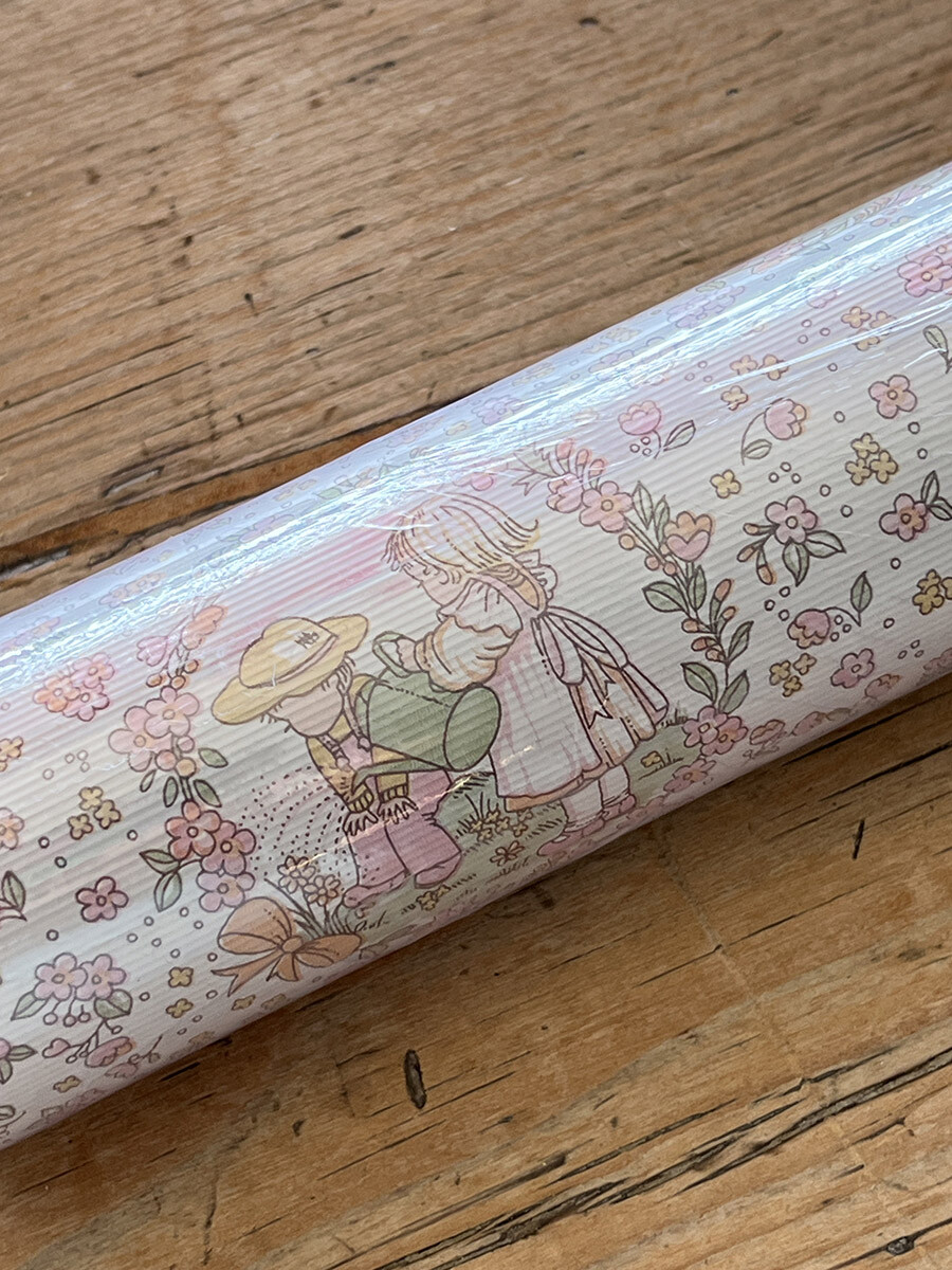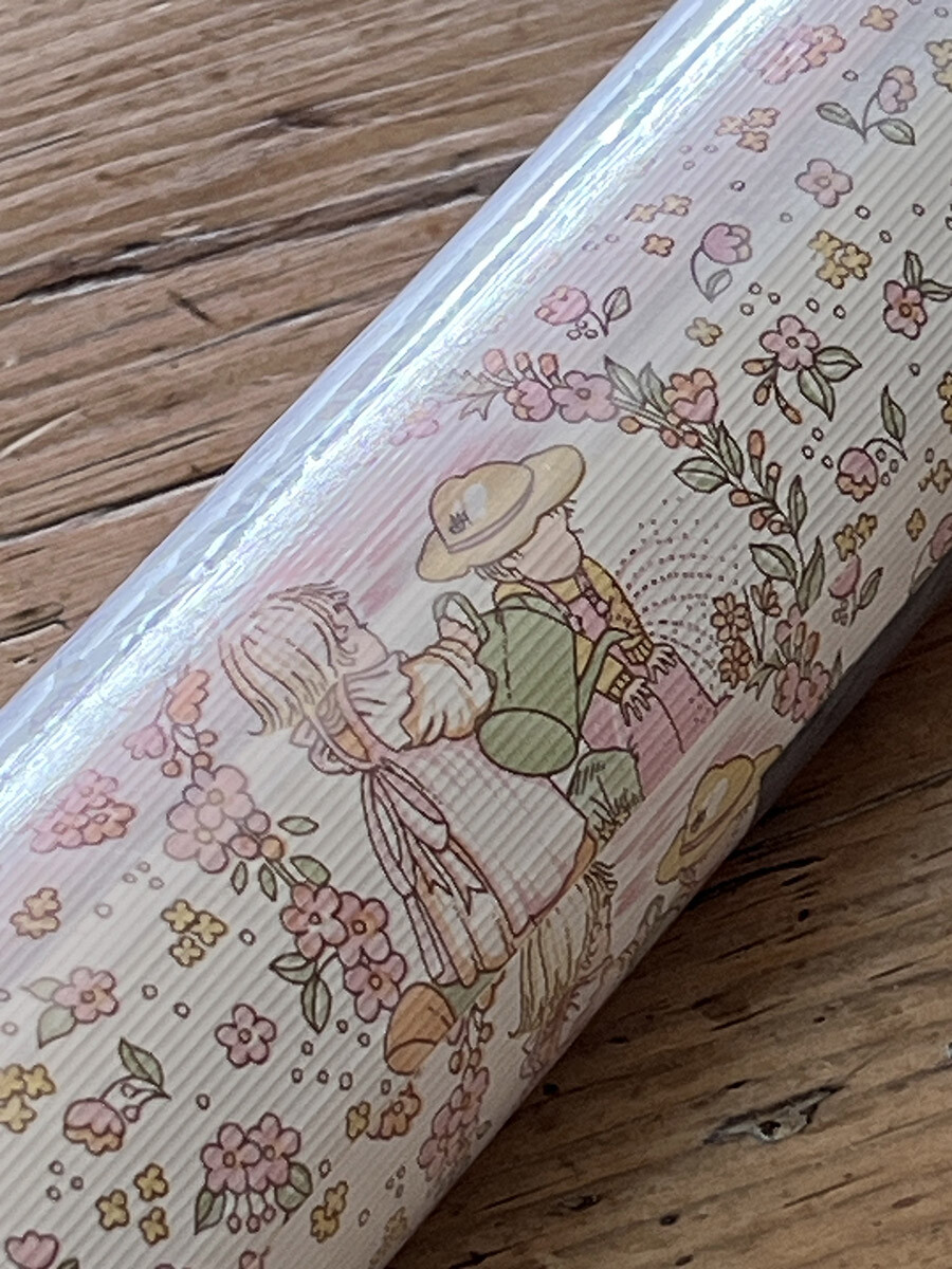 영국 멜로디 밀스(Melody Mills) 사에서 1970년대에 제작한 빈티지 월페이퍼로 핑크톤의 벽지입니다. 약간의 쿠션감이 있는 엠보싱 재질의 화이트 배경에 핑크 컬러의 꽃들과 정원에서 물을 주고 있는 남자아이와 여자아이의 패턴이 장식되어 있습니다. 도배용 풀이 필요하고, 건조 후에는 벽지를 물로 닦을 수 있는 슈퍼 워셔블 타입입니다.